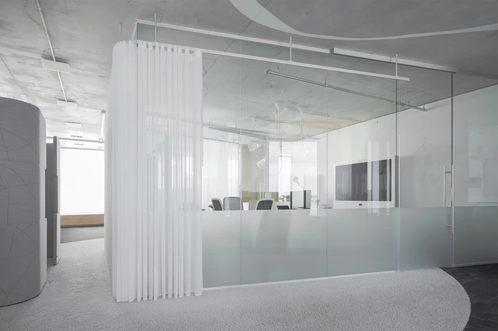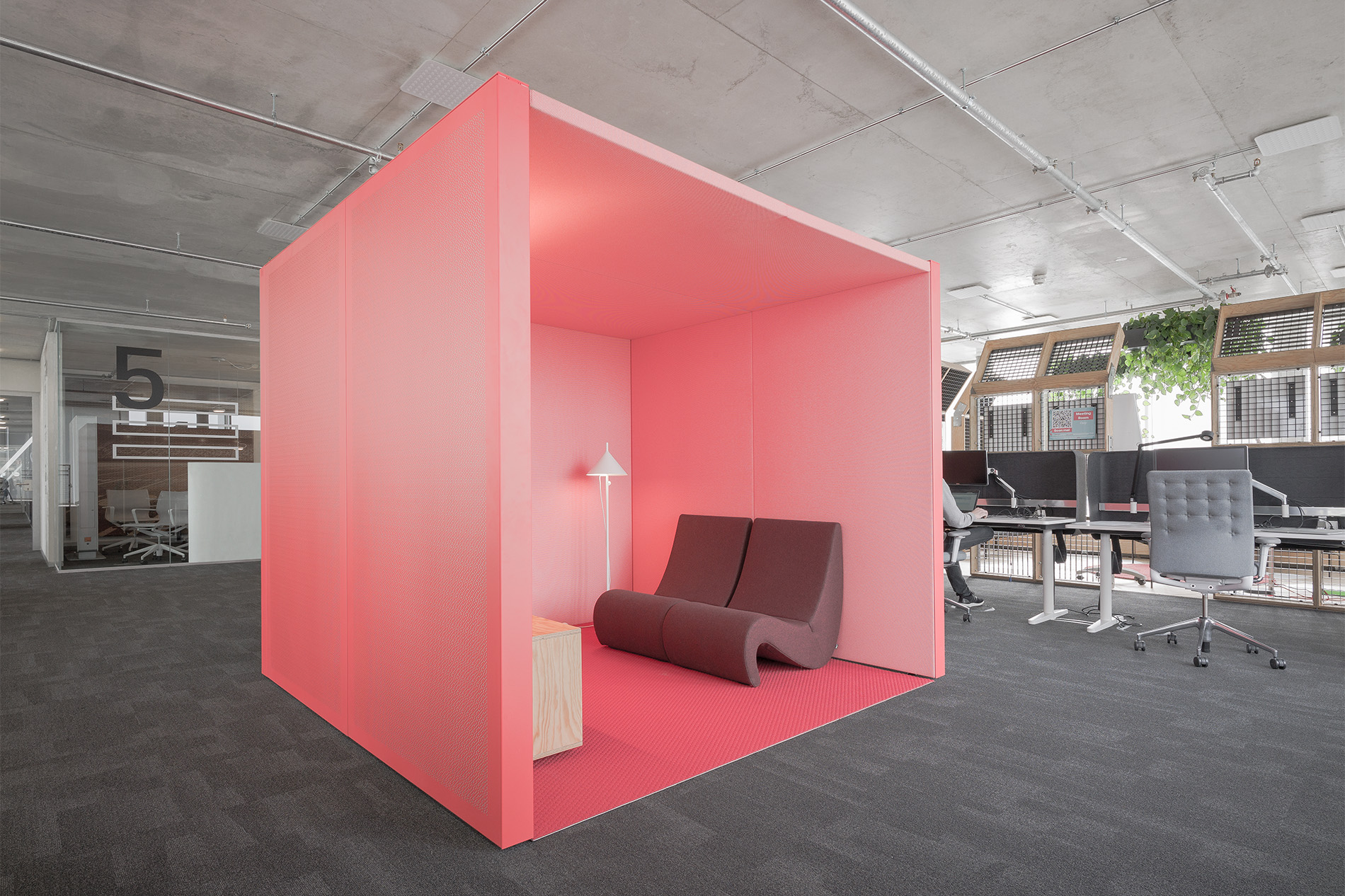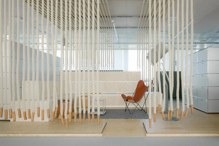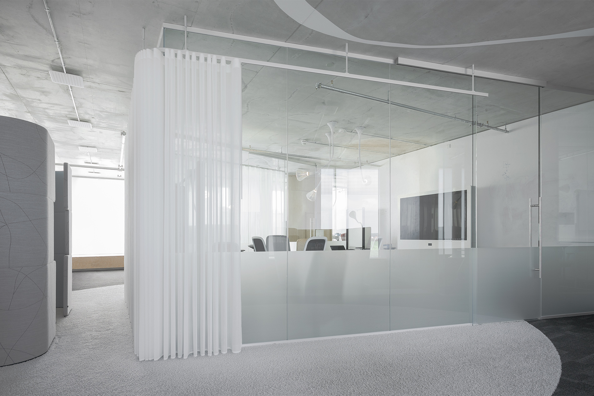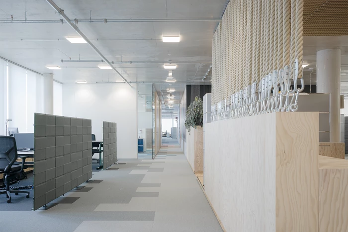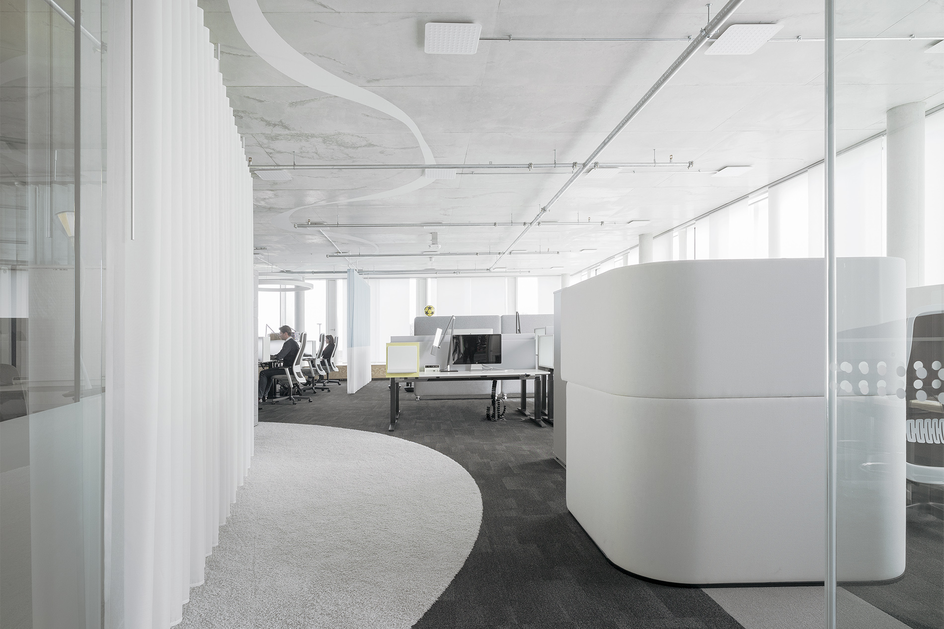 Die Grundrissgestaltung bietet 450 feste sowie weitere temporäre Arbeitsplätze für externe Mitarbeiter und Besprechungsräume. Der langgestreckte Baukörper ist durch die drei Erschließungs- und Servicekerne gegliedert und ermöglicht so die unterschiedlichsten Grundriss- und Raumkonfigurationen.