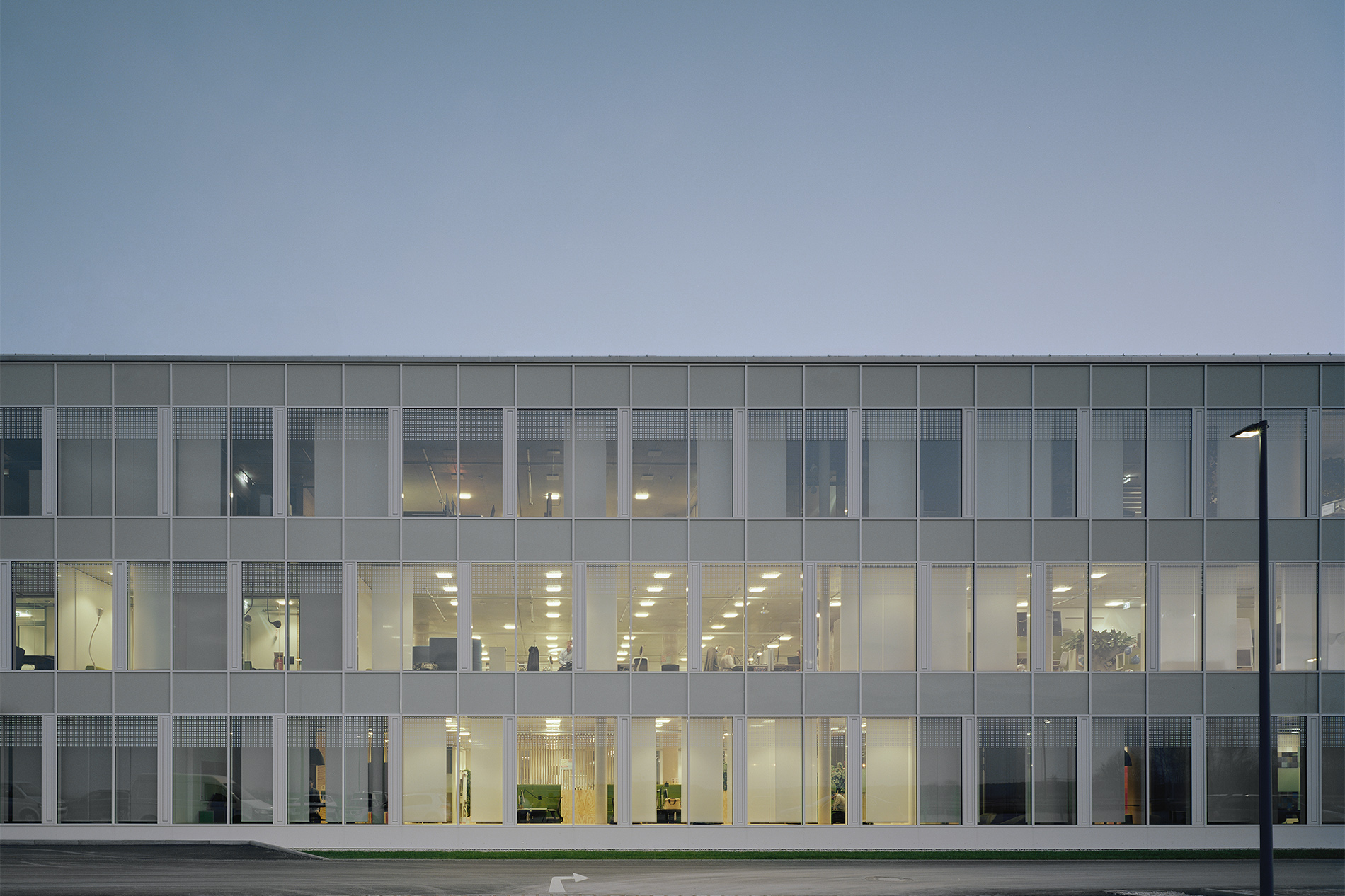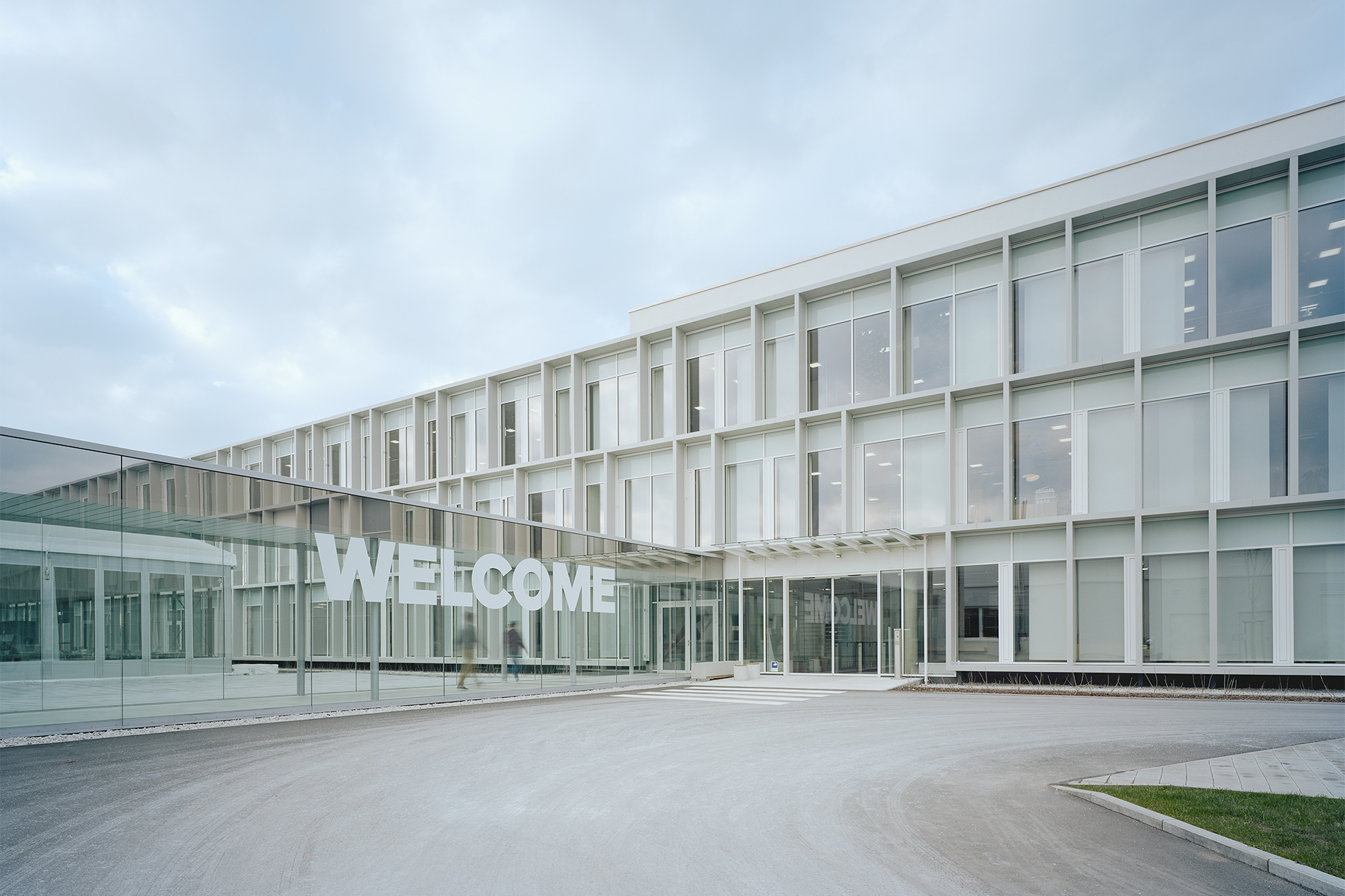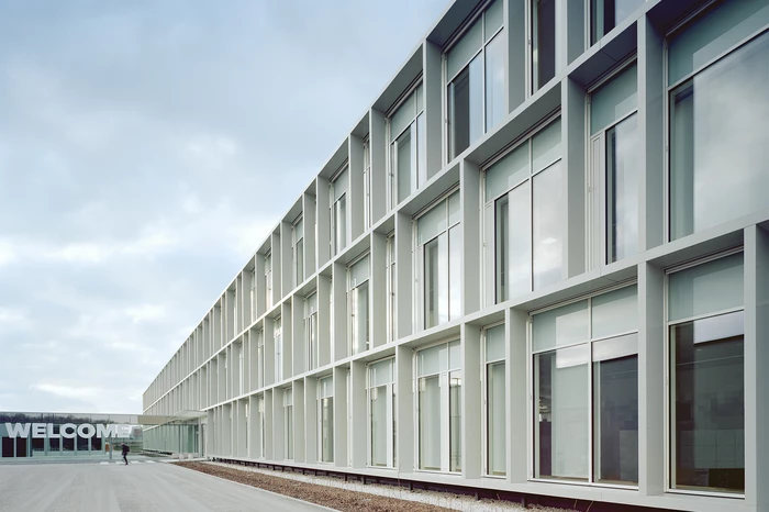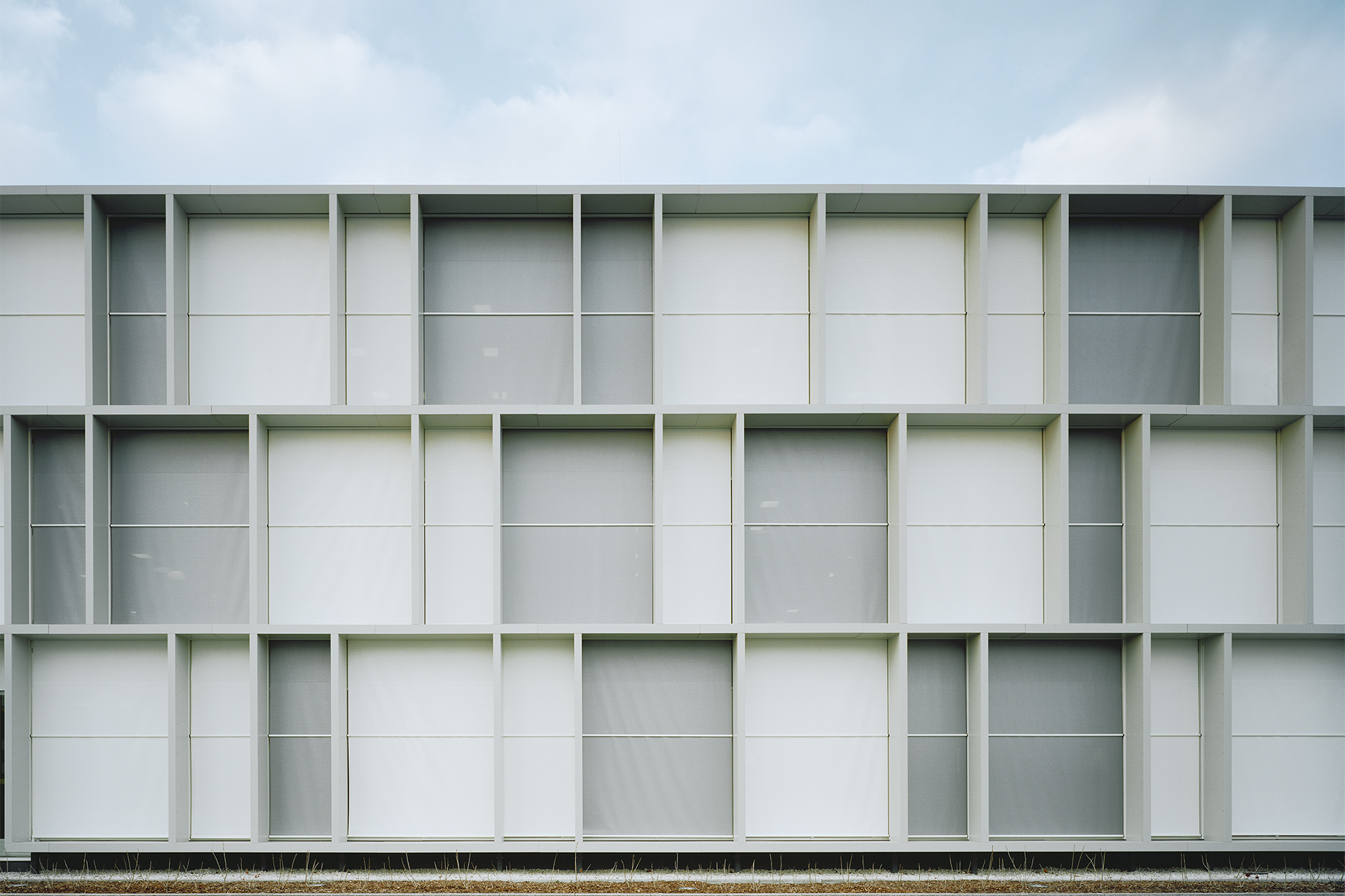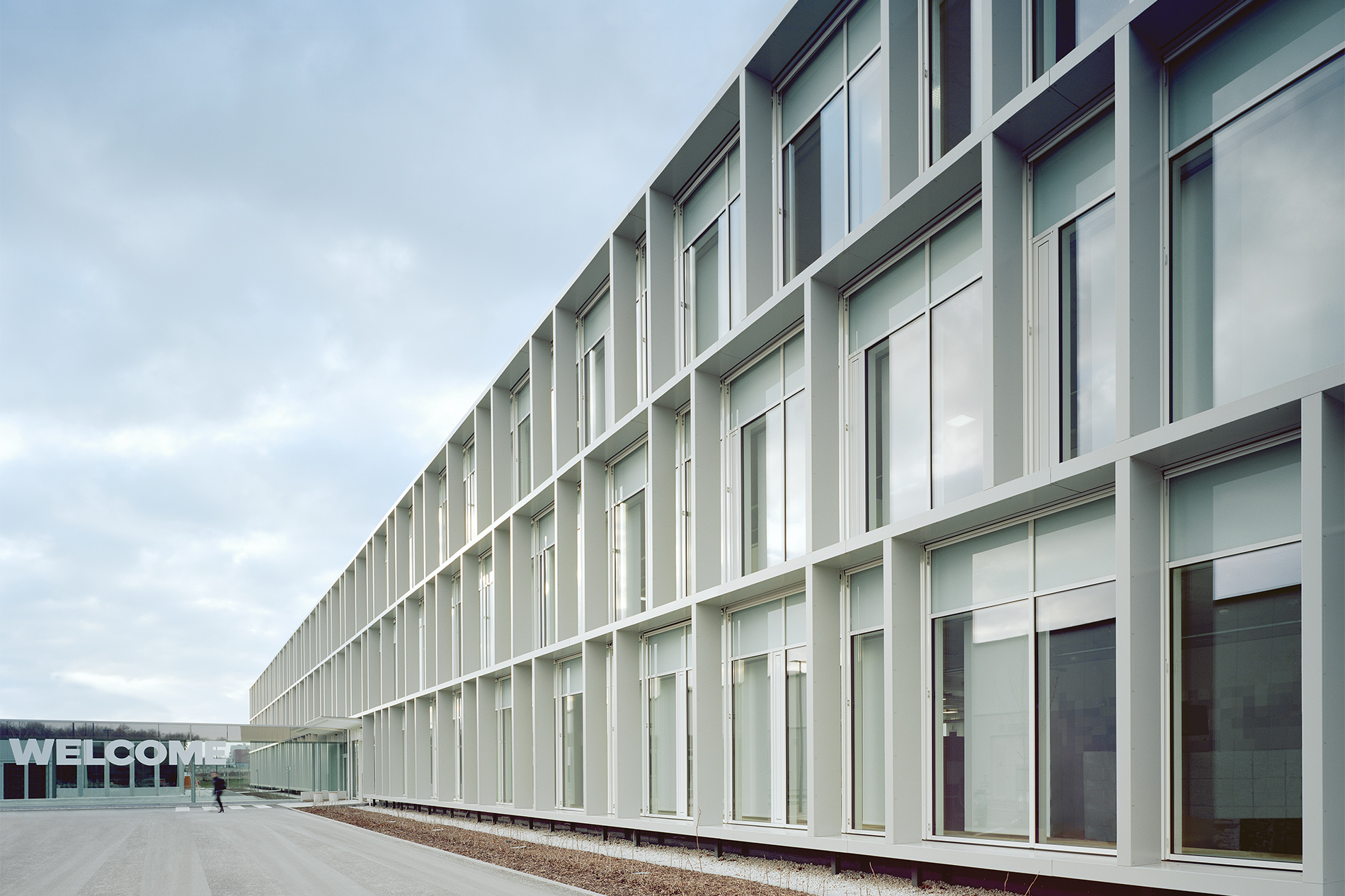 Das architektonische Konzept ist wirtschaftlich und gleichzeitig prägnant. Eine modulare Fassade umhüllt die „zurückhaltenden“ Innenräume und unterstreicht den industriellen Charakter. In Auseinandersetzung mit den örtlichen Begebenheiten und dem Sonnenverlauf entstand ein feststehender, vorgelagerter Sonnenschutz auf drei Gebäudeseiten. Für das in exponierter Lage befindliche Gebäude kann so die notwendige Verschattung der Innenräume gewährleistet werden.