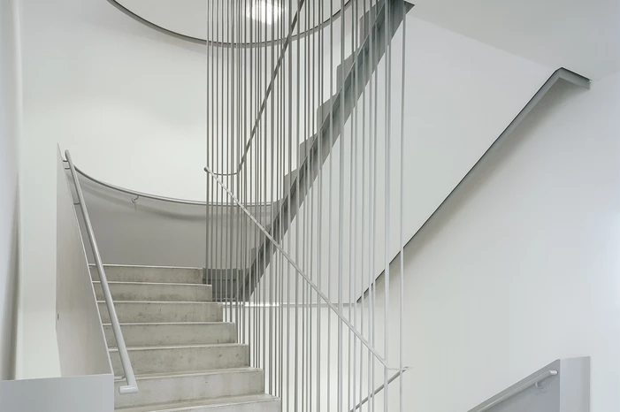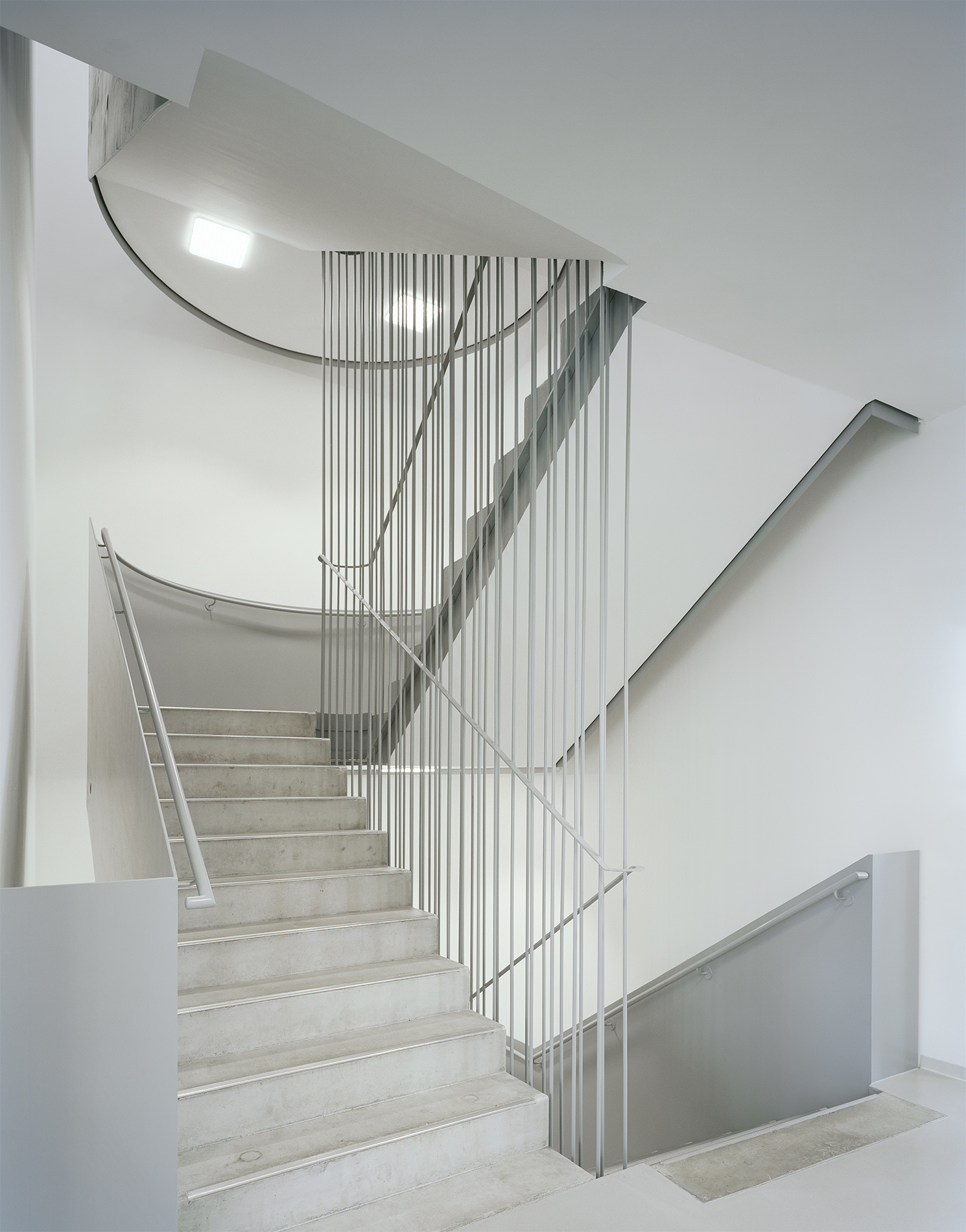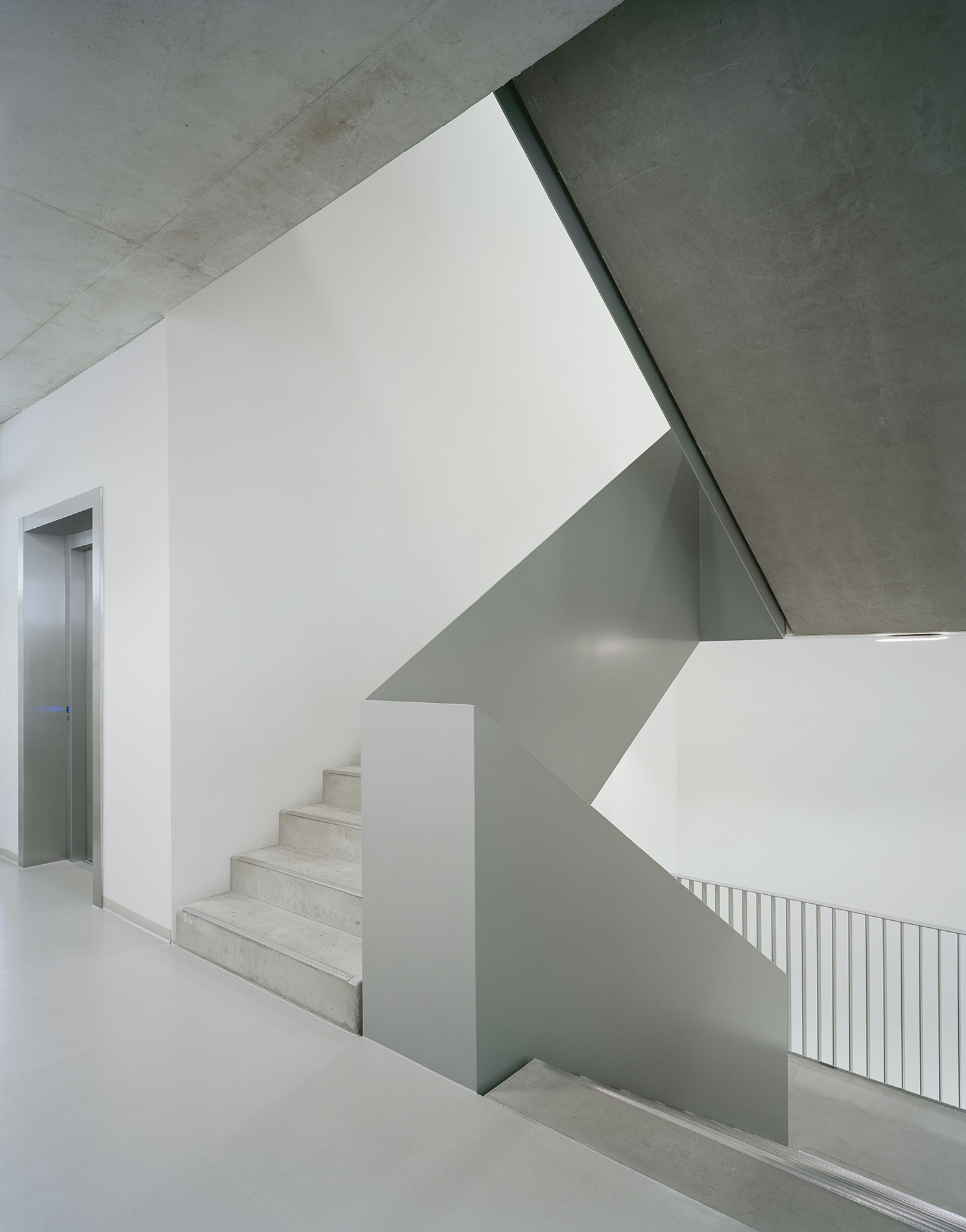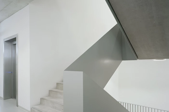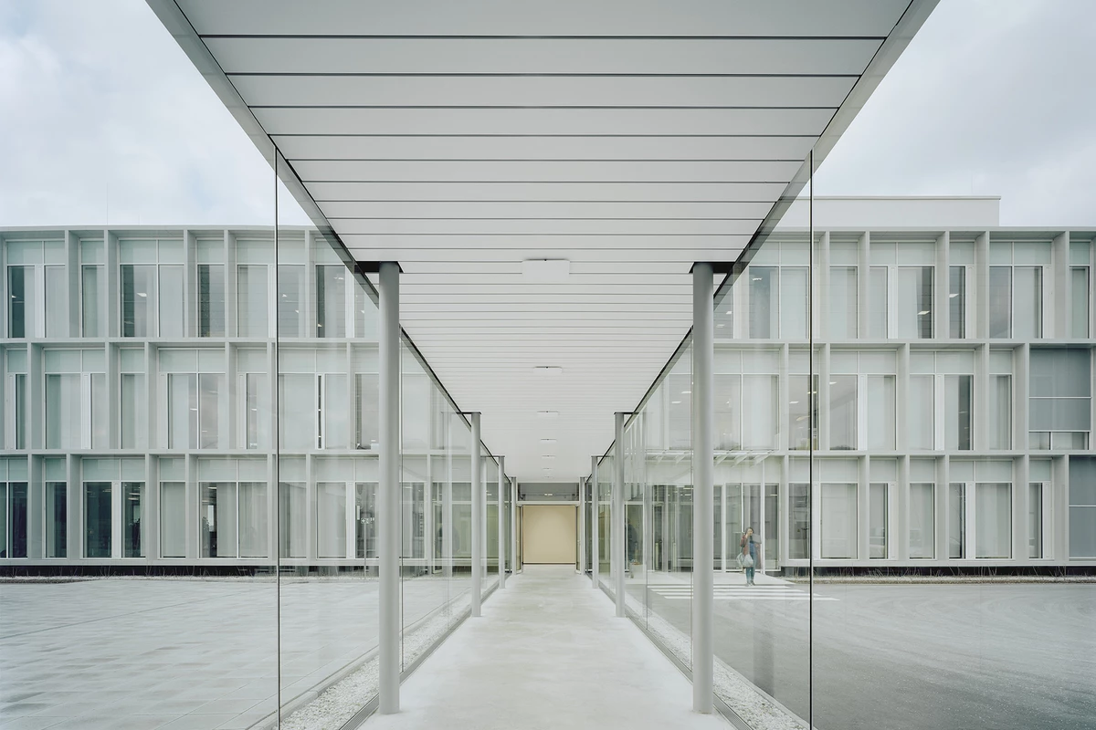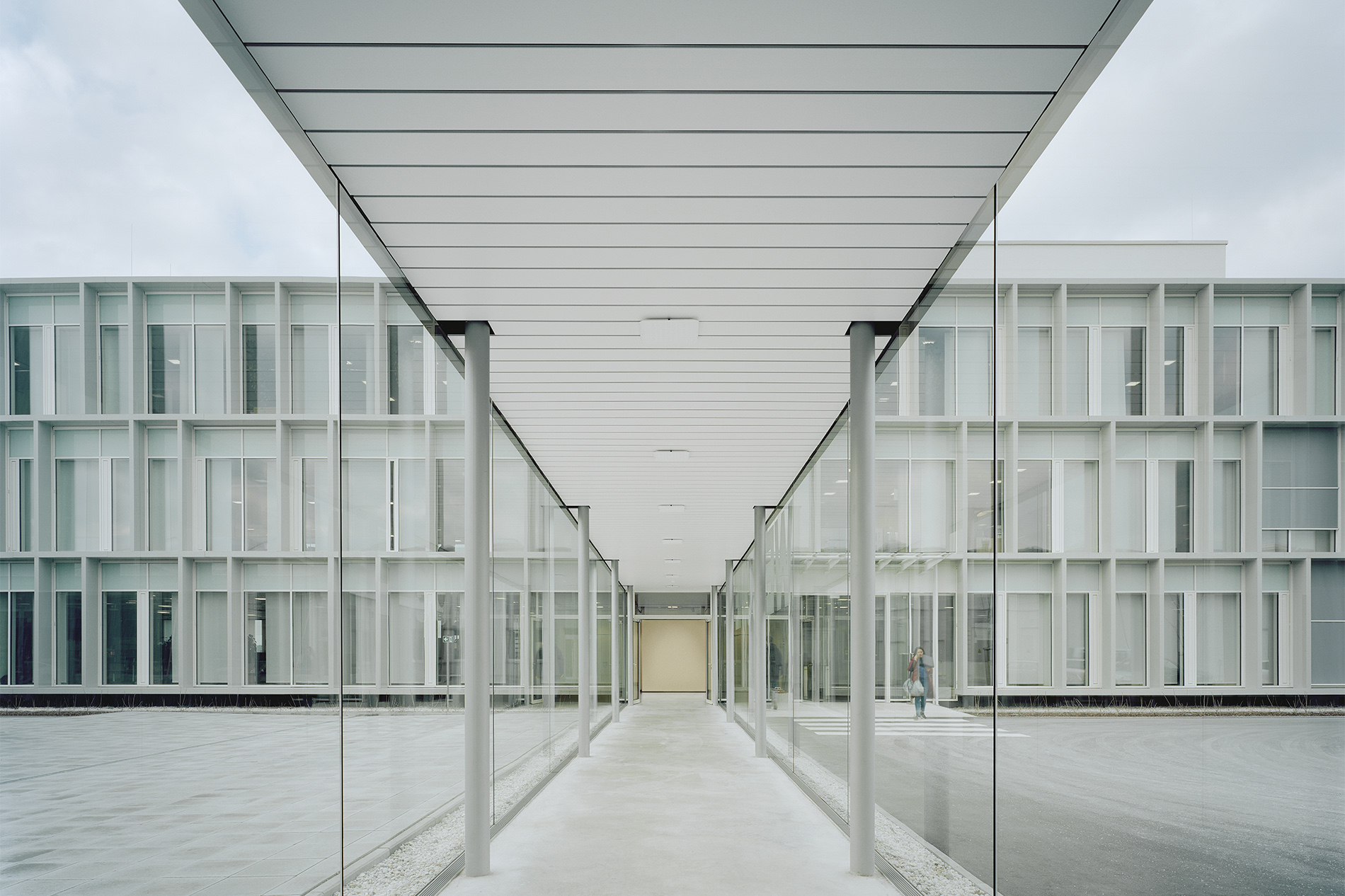 Das architektonische Konzept ist wirtschaftlich und gleichzeitig prägnant. Eine modulare Fassade umhüllt die „zurückhaltenden“ Innenräume und unterstreicht den industriellen Charakter. In Auseinandersetzung mit den örtlichen Begebenheiten und dem Sonnenverlauf entstand ein feststehender, vorgelagerter Sonnenschutz auf drei Gebäudeseiten. Für das in exponierter Lage befindliche Gebäude kann so die notwendige Verschattung der Innenräume gewährleistet werden.
