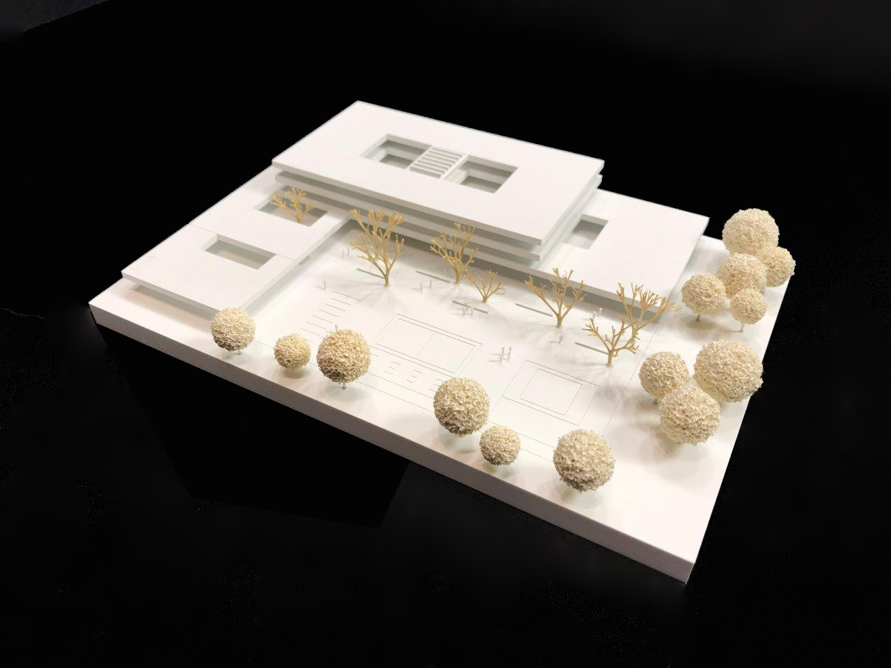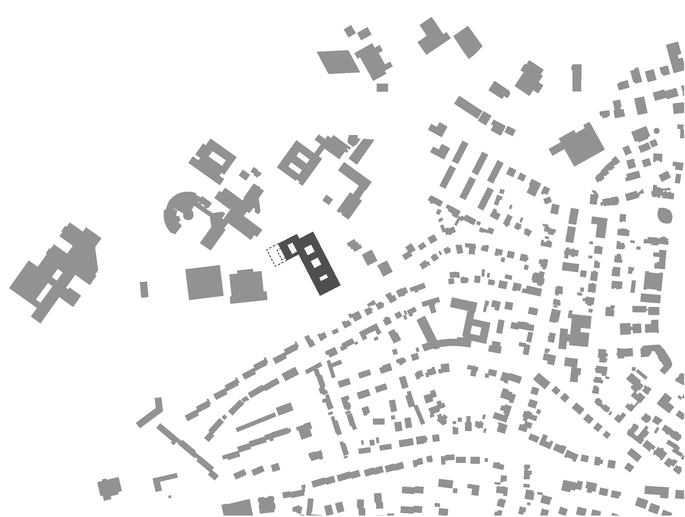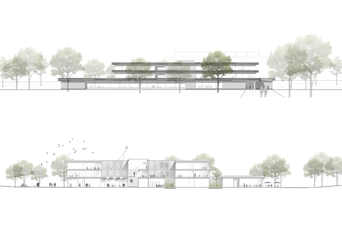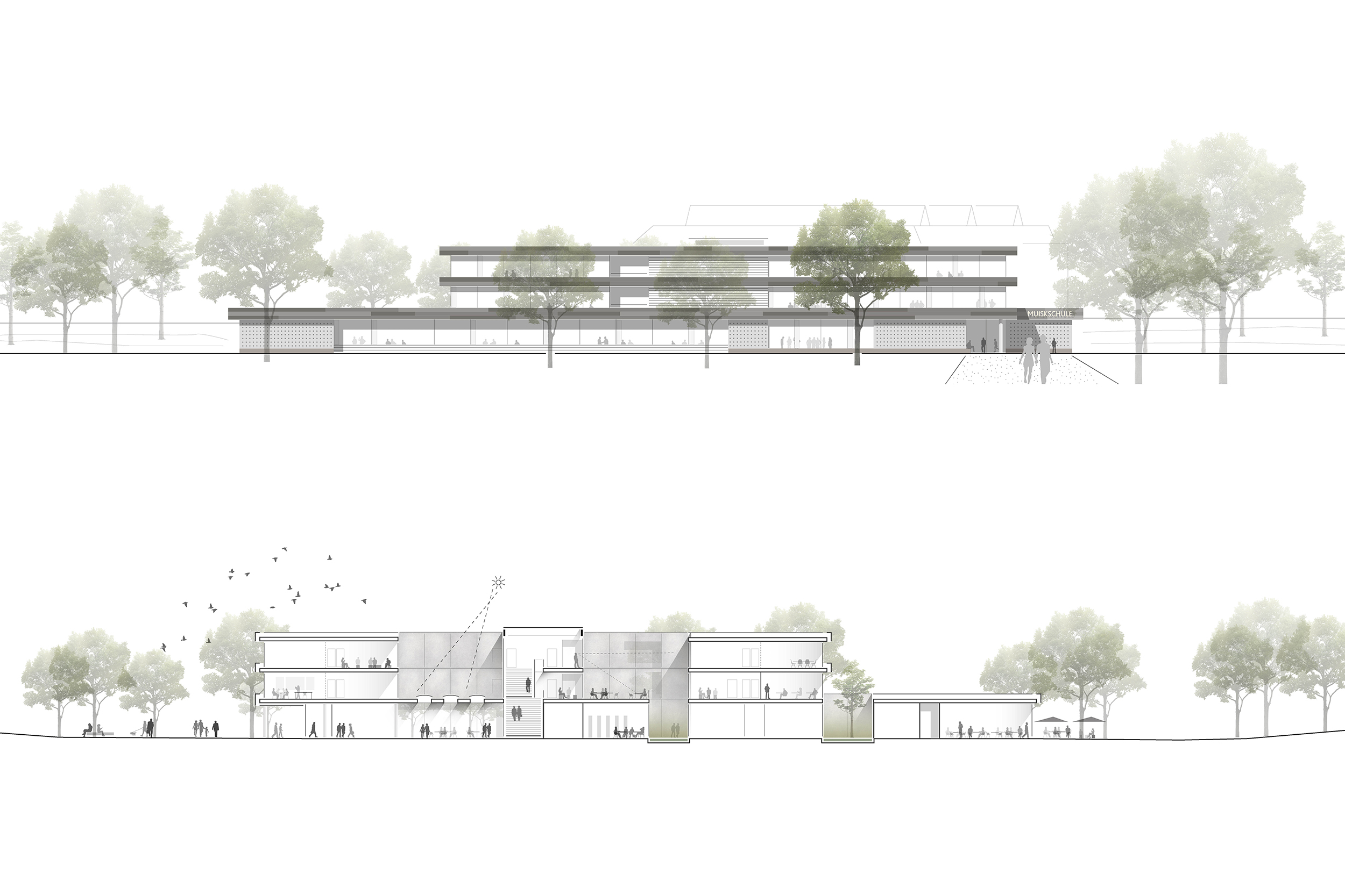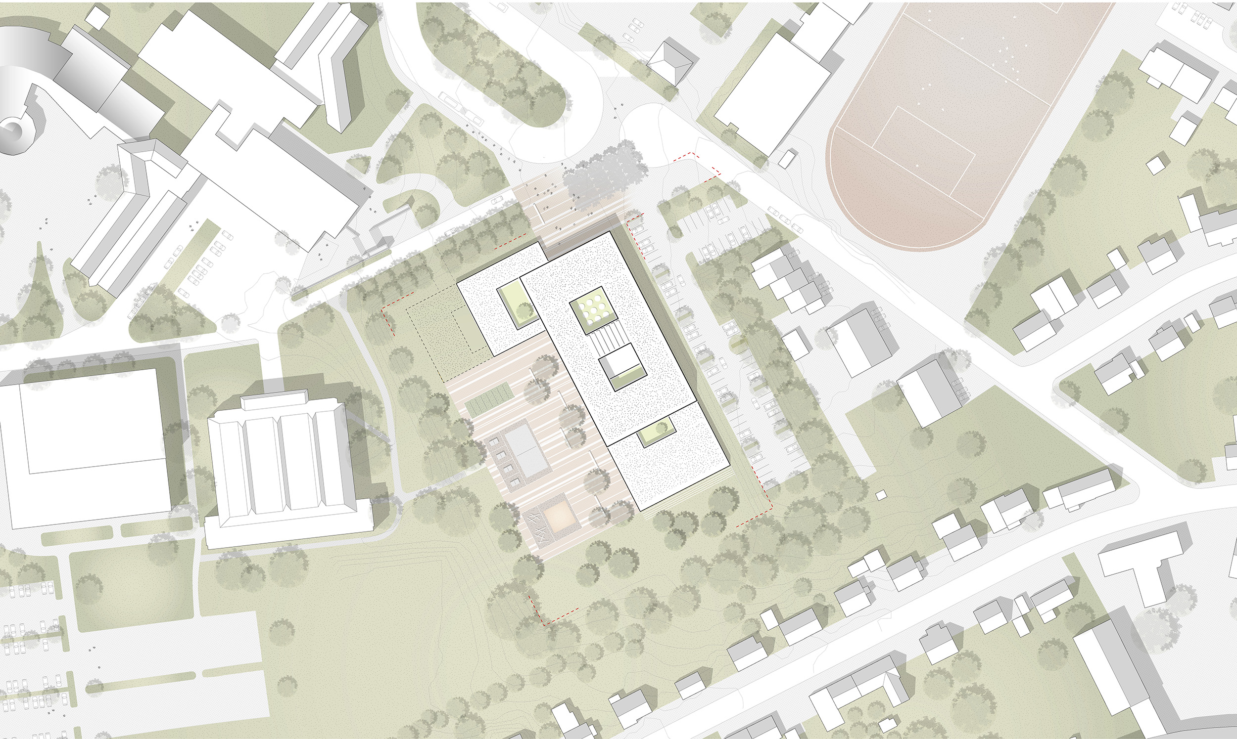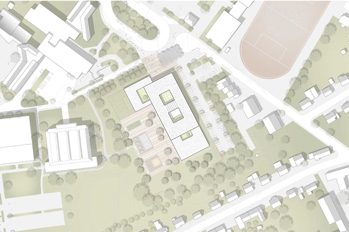 Das neue Schulgebäude mit Kreismusikschule und zukünftiger Mensa-Erweiterung wird als winkelförmiger Baukörper konzipiert, der konsequent an den östlichen und nördlichen Grundstücksrand rückt. Es werden klare Raumkanten zum öffentlichen Raum hin definiert und ein großzügiger zusammenhängender Grün- und Freibereich generiert, der als Schulhof für vielfältige Aktivitäten aber auch Ruhezonen genutzt werden kann und sich mit dem bestehenden Grünzug verzahnt.