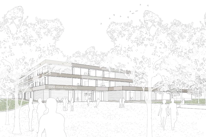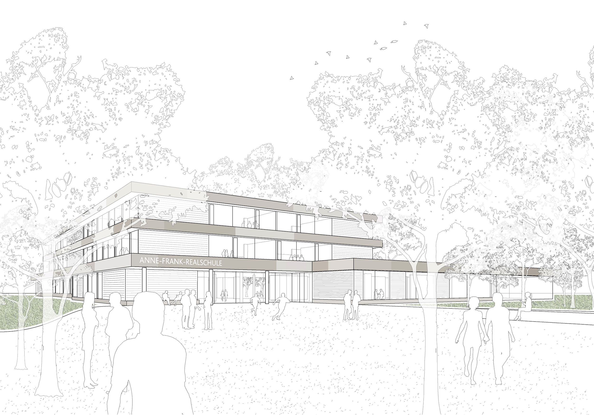 Durch die Positionierung und Höhenentwicklung des Neubaus wird eine gute Wahrnehmbarkeit des Schulgebäudes erreicht. Der Hauptzugang liegt an der nordöstlichen Ecke des Grundstücks mit direkter Anbindung zur Bushaltestelle und Ausrichtung zu den anderen Schulen. Er wird sowohl durch den Vorplatz als auch die Gebäudehöhe hervorgehoben. Es entsteht eine eindeutige Eingangssituation mit klarer Adressbildung. Die AFR wird ein prägender Baustein innerhalb des „Bildungscampus“.