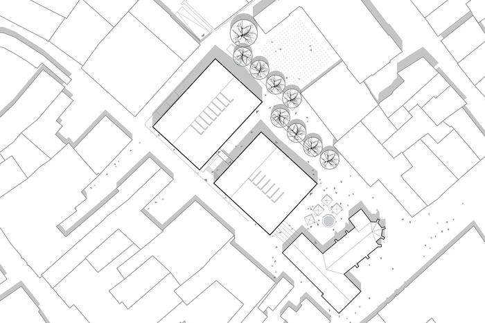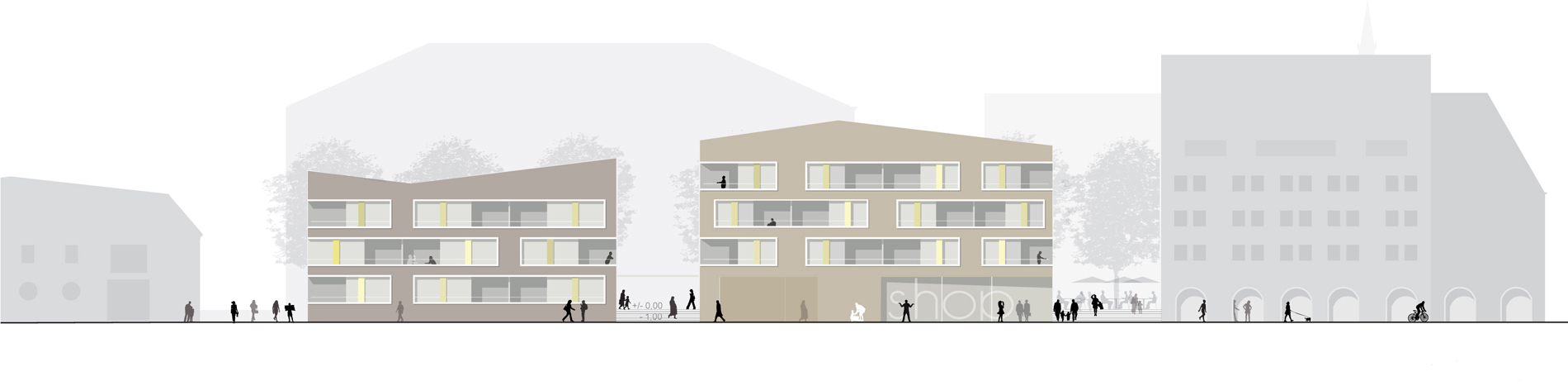 Die Gliederung der Baukörper gibt eine städtebauliche Antwort auf die Maßstäblichkeit der angrenzenden Altstadtstruktur. Die Verdichtung des Raumprogramms in zwei kompakte Bauten ermöglicht eine klare und großzügige Platzgestaltung und Wegeführung und stellt die geforderte Durchlässigkeit her. Es entsteht ein gemeinsamer, differenzierter Lebensraum. Diese Konzeption der Integration ist das zentrale Anliegen des Entwurfes.