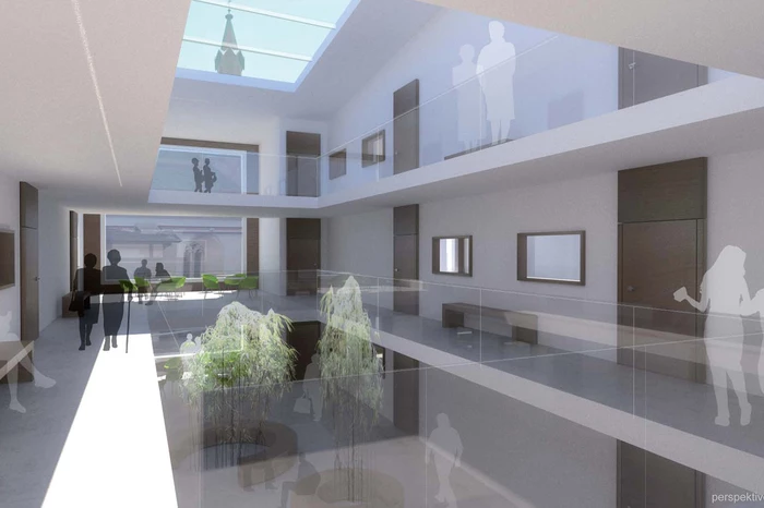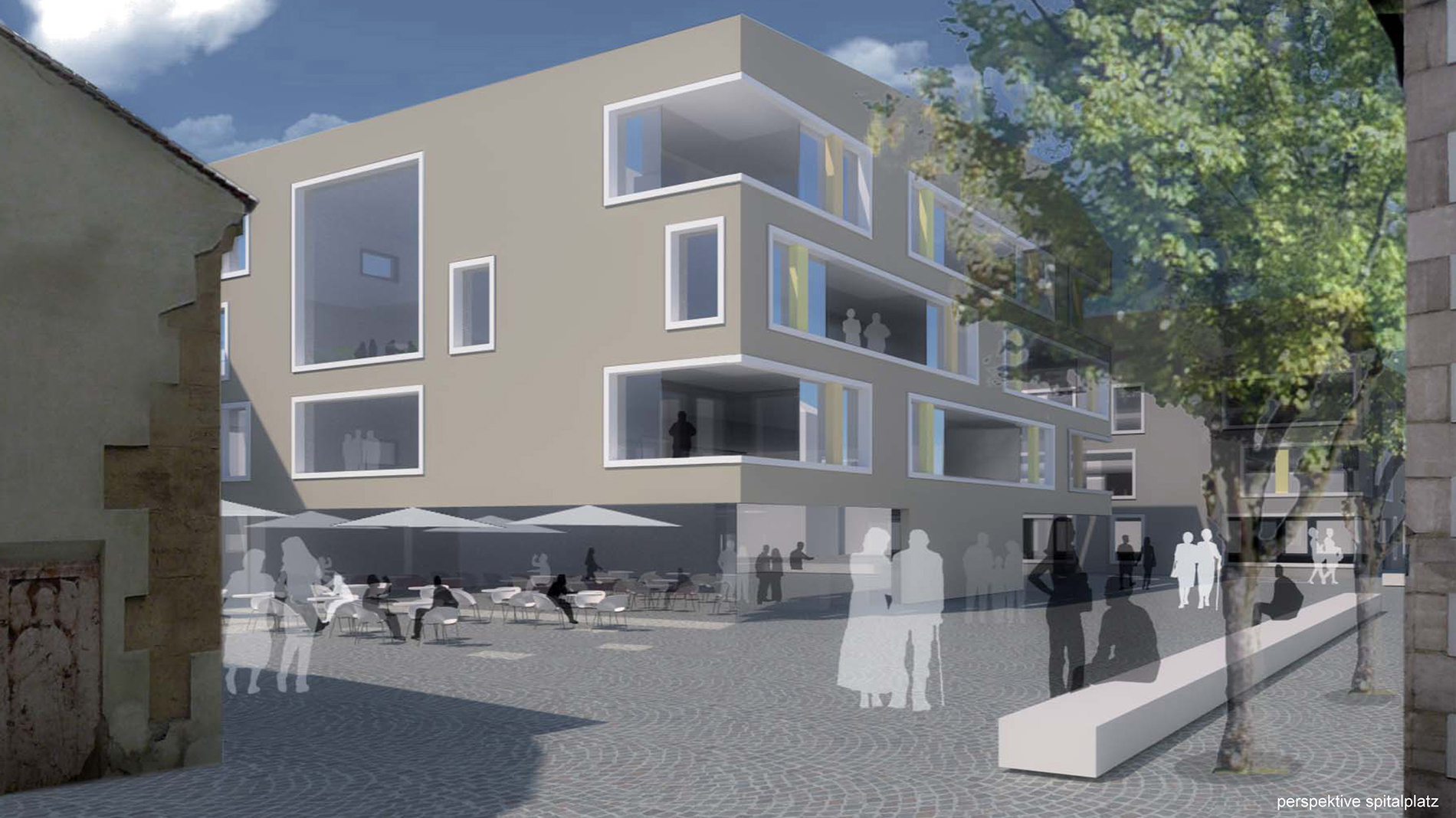 Dem Spitalplatz zugeordnet befinden sich Cafè und Verwaltung, dem Quartierszugang und Pausenhof zugewandt liegen die