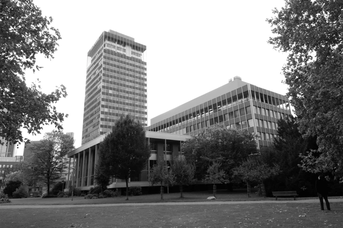 Das denkmalgeschützte Gebäudeensemble der Bank wurde in den sechziger Jahren von Sep Ruf, einem der bedeutendsten Nachkriegsarchitekten Deutschlands, entworfen und realisiert. Der Gebäudekomplex besteht aus drei Gebäudeteilen, dem flachen Atriumbau, dem verbindenden Mittelbau und dem 23 geschossigen Hochhaus.