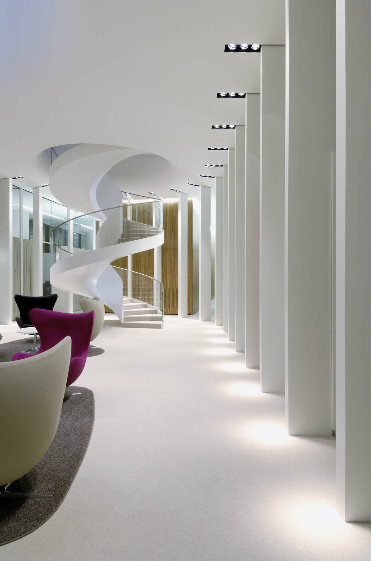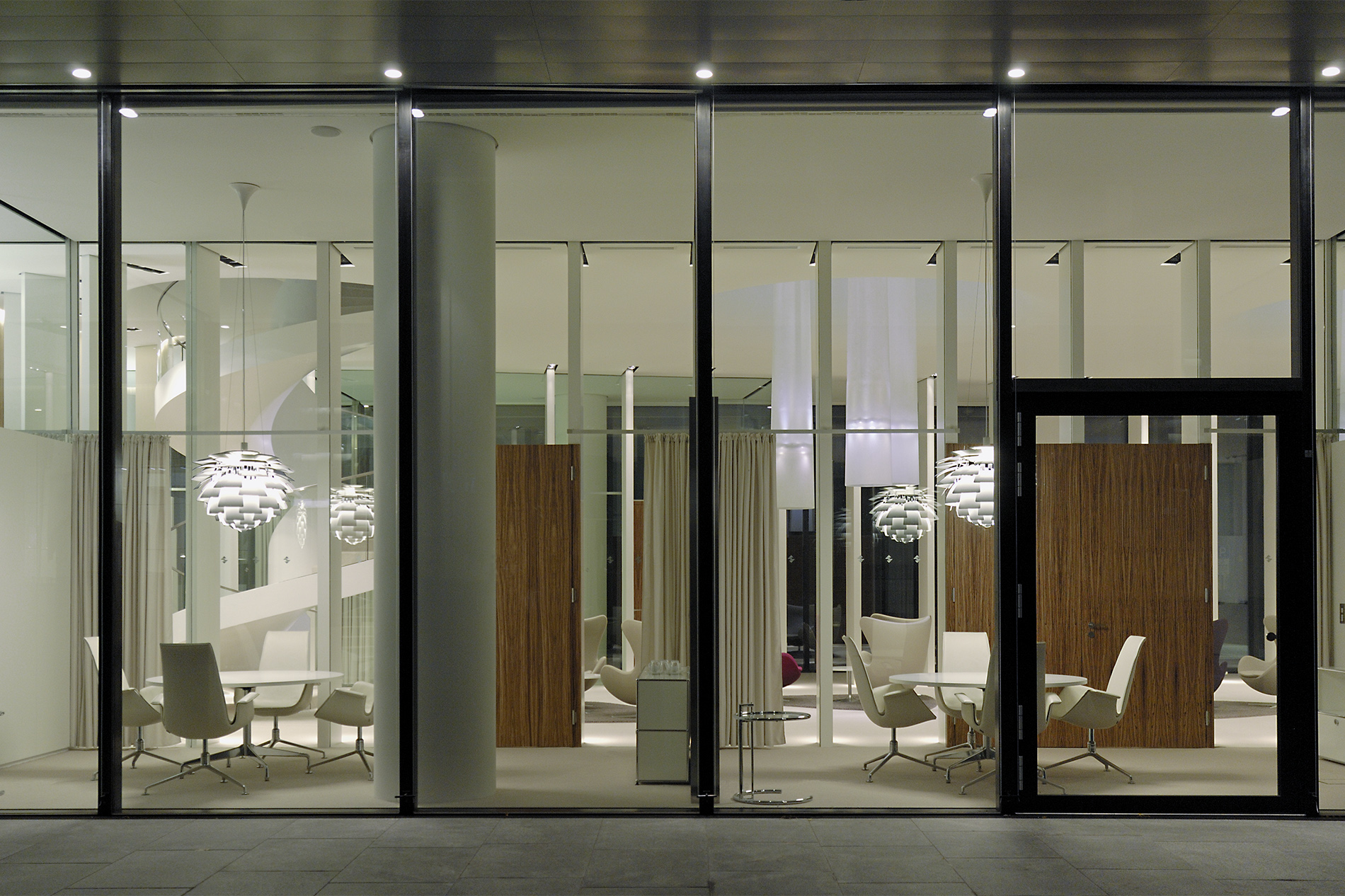 Vom Haupteingang aus gelangt man in das Atrium oder über eine Aufzuganlage in die einzelnen Etagen des Mittelbaus. Diese Empfangssituation wurde im Zusammenhang mit dem neu zu schaffenden Private Banking Bereich, der im Erdgeschoss und im 1. Obergeschoss des Mittelbaus entstehen sollte, neu organisiert und gestaltet.