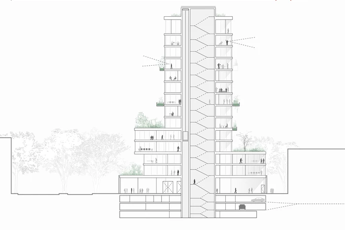 Das neue Gebäude fügt sich mit seiner differenzierten Volumetrie in den städtebaulichen Kontext ein und schafft durch klare Raumkanten im Erdgeschoss, die die vorhandenen Baufluchten aufnehmen, klar definierte Straßenräume. Mit seinen unterschiedlichen Höhenentwicklungen reagiert der Neubau angemessen auf die angrenzenden Bestandsbauten und markiert mit dem von der Gebäudeflucht zurückversetzten Hochpunkt den Übergang von der Innenstadt in den Campus.