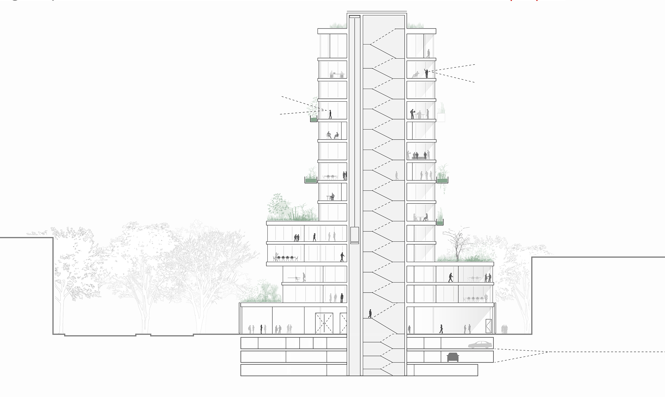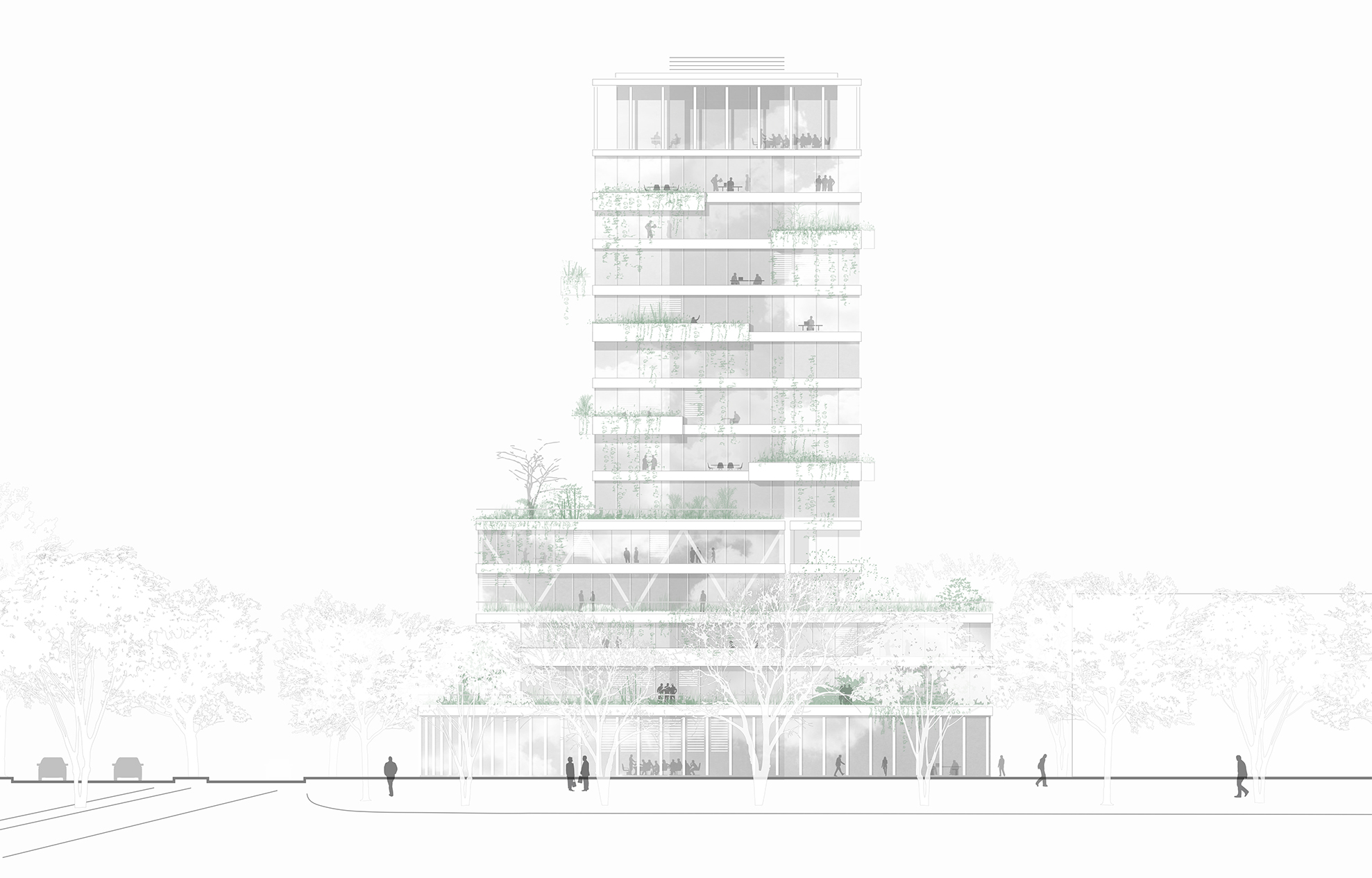 Durch die Gliederung des Neubaus entstehen differenzierte Dachflächen, die als begrünte Außenbereiche mit hoher Aufenthaltsqualität genutzt werden können und damit sowohl für das Klima als auch die Nutzer einen Mehrwert erzeugen. Die begrünten Dachflächen reduzieren die Abflussmengen des einzuleitenden Regenwassers (dezentrale Retention) und fördern die Biodiversität und ein positives Mikroklima.