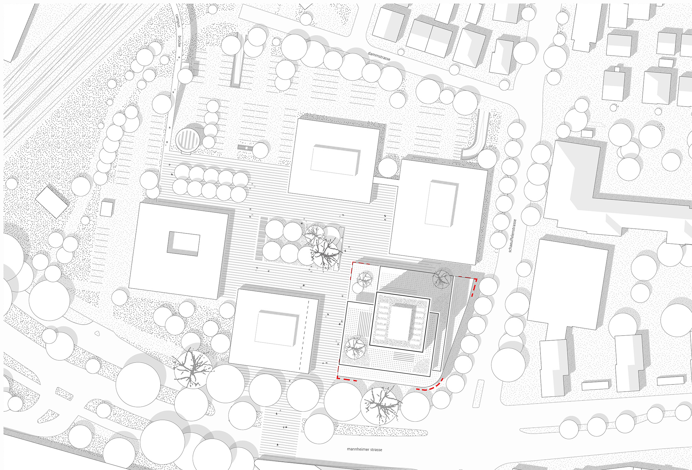 Für eine klare Adressbildung und eine einladende Eingangssituation sorgt die Lage des Haupteingangs, der sich an der bestehenden Querung der Mannheimer Straße orientiert. Mit seiner Positionierung trägt er zur Belebung der Gesamtsituation bei.