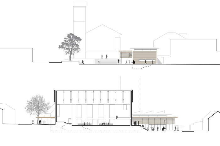 Selbstbewusst repräsentiert der Neubau die Präsenz des Gemeindelebens nach außen, ohne unangemessen zu dominieren. Gemeindemitglieder und Besucher sind eingeladen, den Raum zu erleben und zu genießen. Das Gebäude vermittelt zwischen der kleinteiligen Wohnbebauung und den massiven Baukörpern von Kirche und Pfarrhaus. Durch die leichte Konstruktion und hohe Transparenz nimmt sich der Neubau zurück und fasst die Solitäre zu einem neuen Ganzen. Von jedem Standpunkt sind die räumlichen Zusammenhänge erkennbar. Blickbezüge verbinden Kirchgarten und Kirchplatz durch das Gebäude hindurch. Im Gegensatz zur plastischen Stärke des Bestands wird der Neubau von Linien und Flächen geprägt.