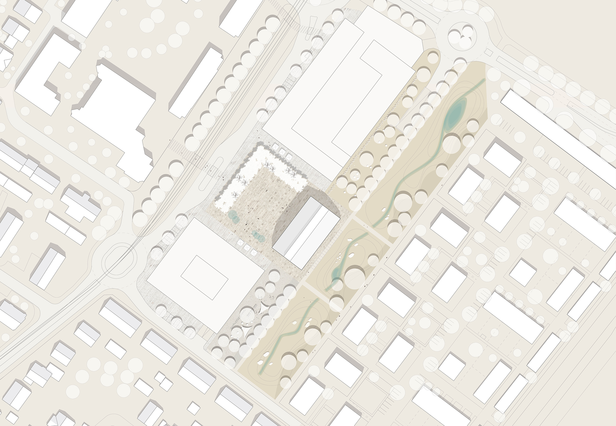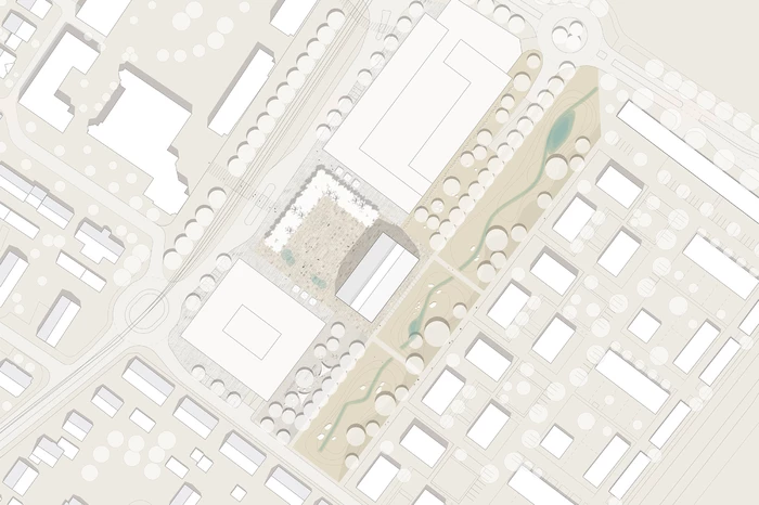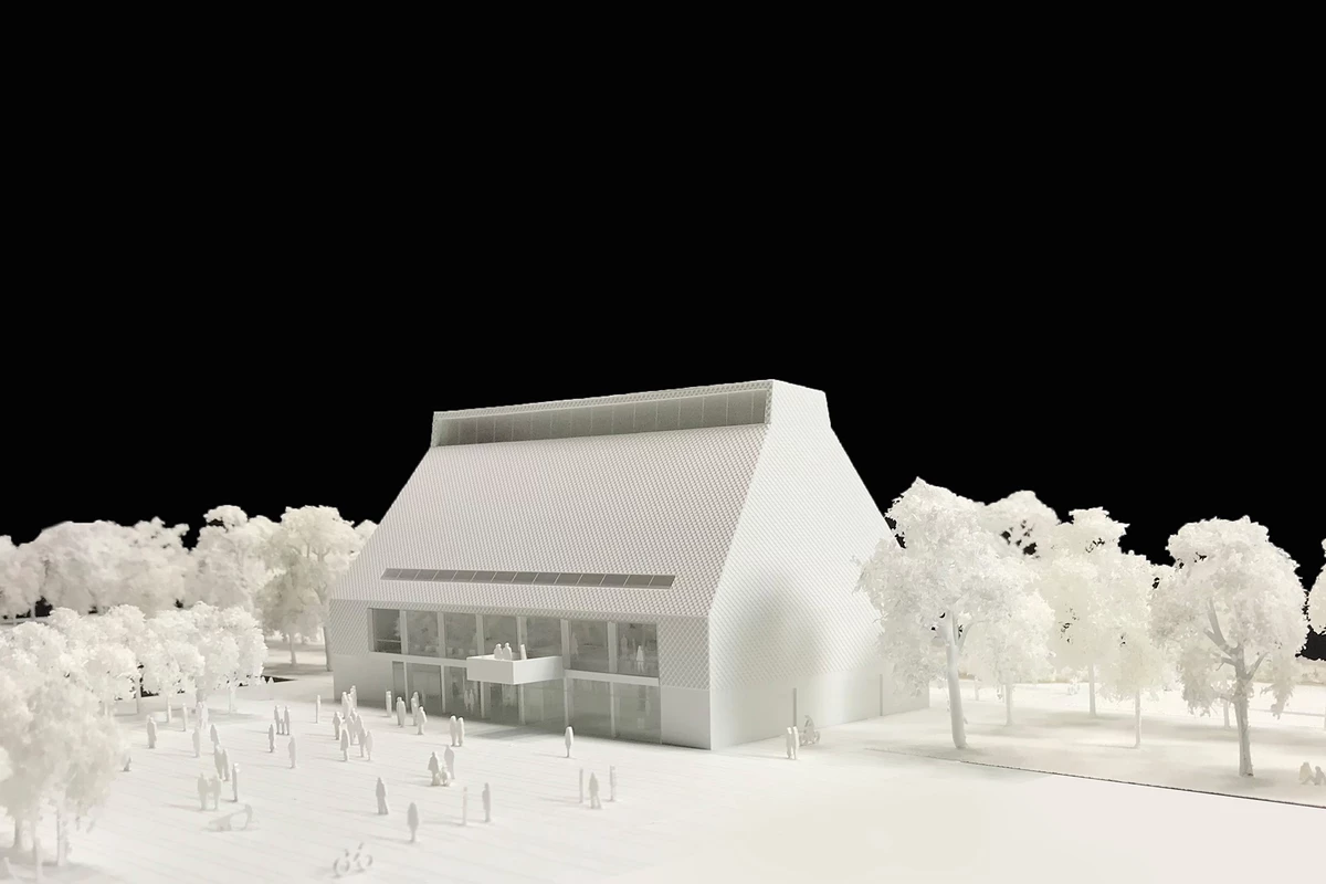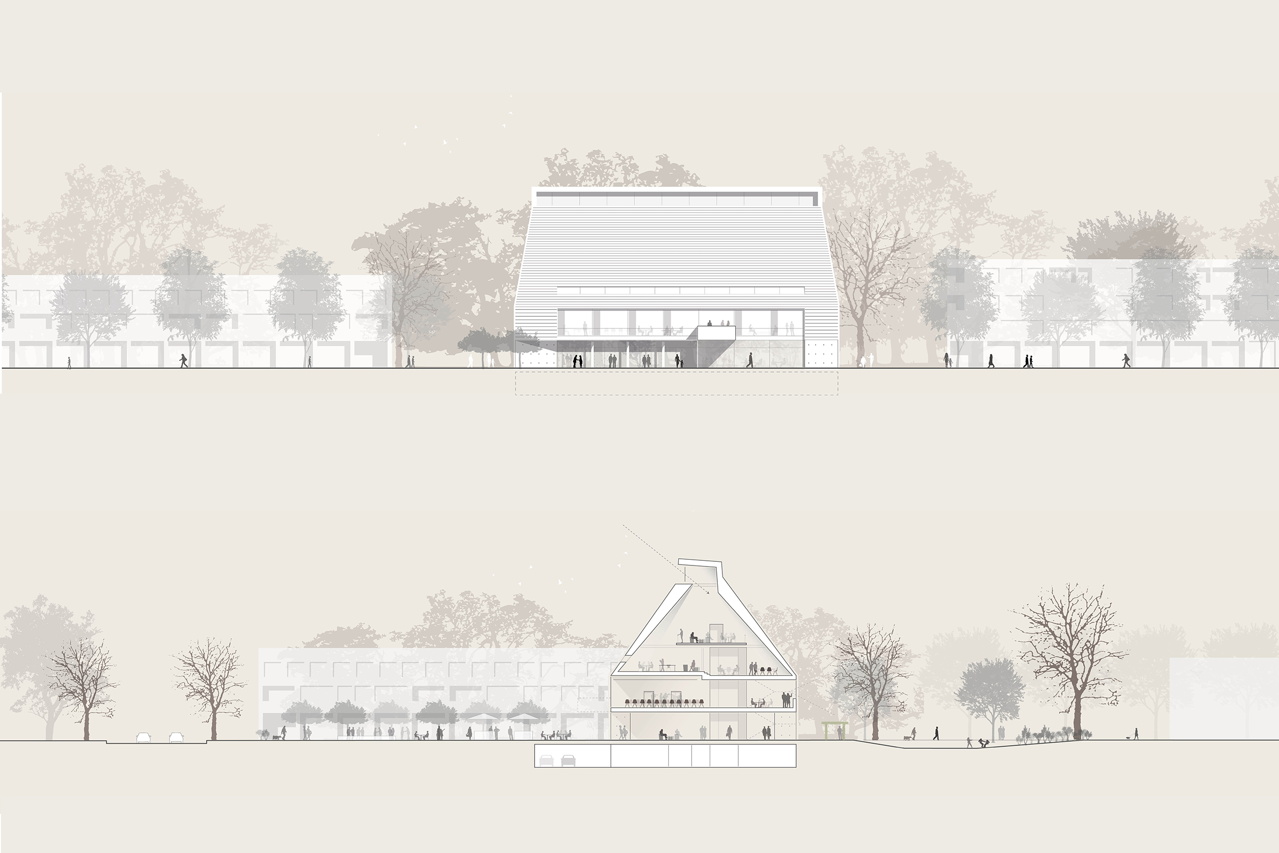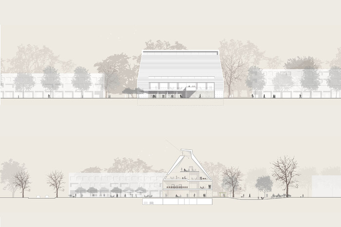 Das neue Bürger- und Kulturhaus verbindet den Wunsch nach städtebaulicher Integration mit einer angemessenen gestalterischen Eigenständigkeit. Als prägnanter Solitär liegt der Neubau gut sichtbar an der Hauptstraße von Rheinstetten und bildet den südlichen Raumabschluss des Marktplatzes. Über einem durch seine Materialität massiv und robust erscheinenden Sockel erhebt sich ein mit lasierten Ziegeln verkleidetes, durch Lichtreflexionen irisierendes Dach, das dem Gebäude die notwendige Höhe und angemessene Dimension verschafft. Die Balance von Transparenz und Massivität transportiert das Leitbild einer modernen und offenen Verwaltung und verfügt gleichzeitig über die notwendige stadträumliche Kraft. Es entsteht ein erkennbarer Stadtmittelpunkt mit einer attraktiven städtebaulichen Adresse und einem Eingangsbereich mit hoher Aufenthaltsqualität, der zum Verweilen und zur sozialen Interaktion einlädt und als Entrée für das zukünftige Bürger- und Kulturhaus fungiert.
