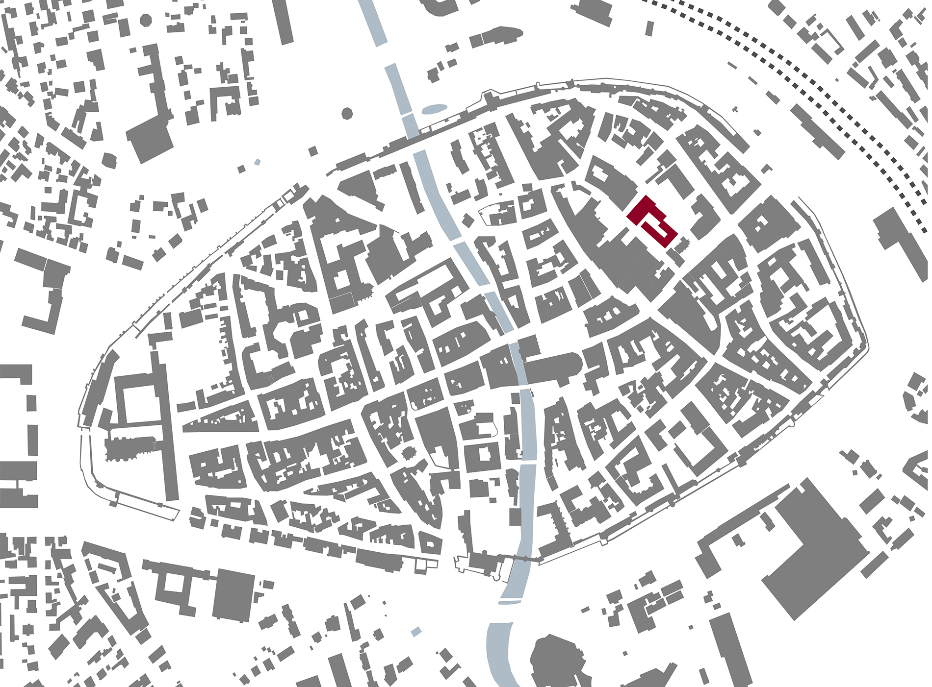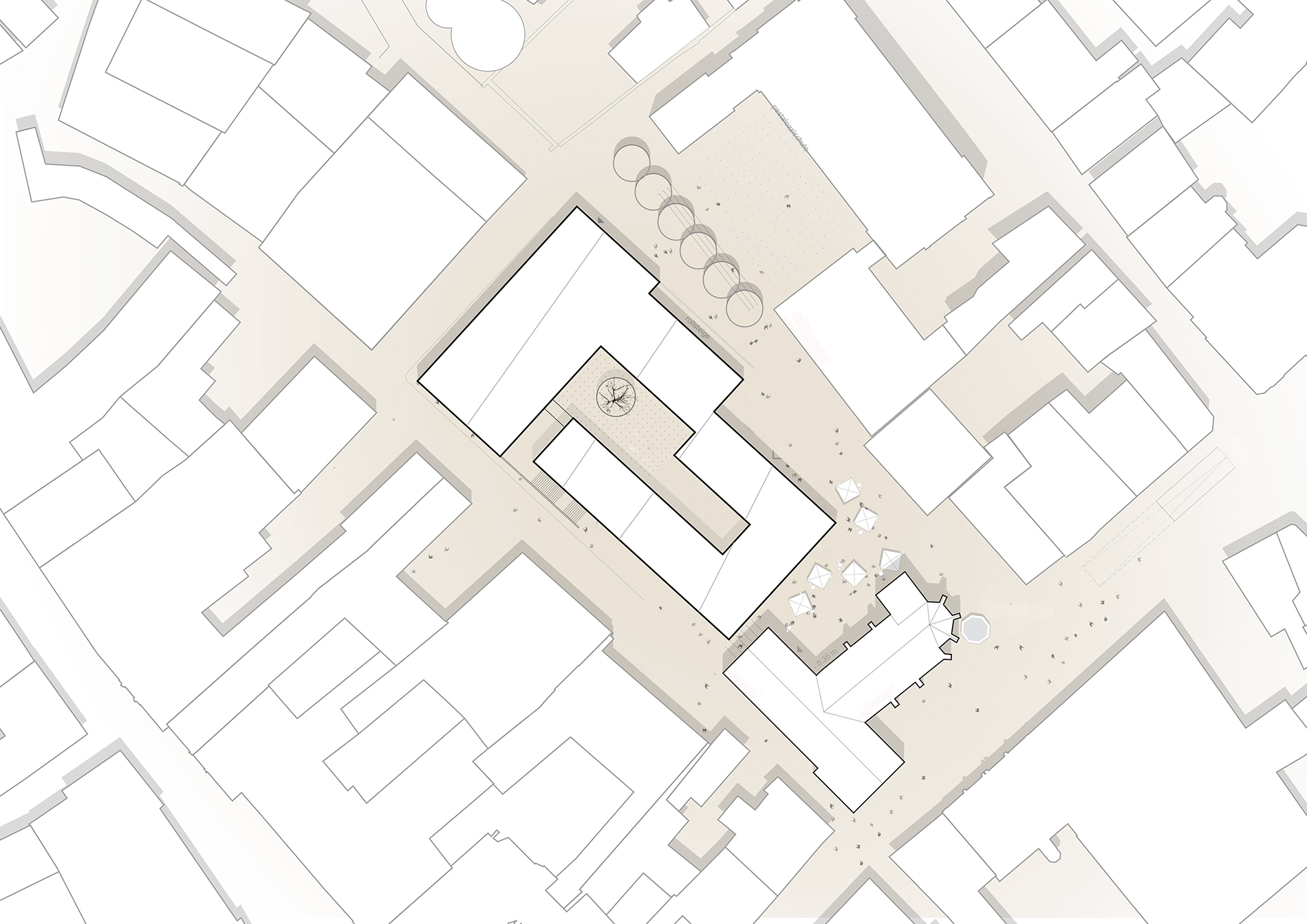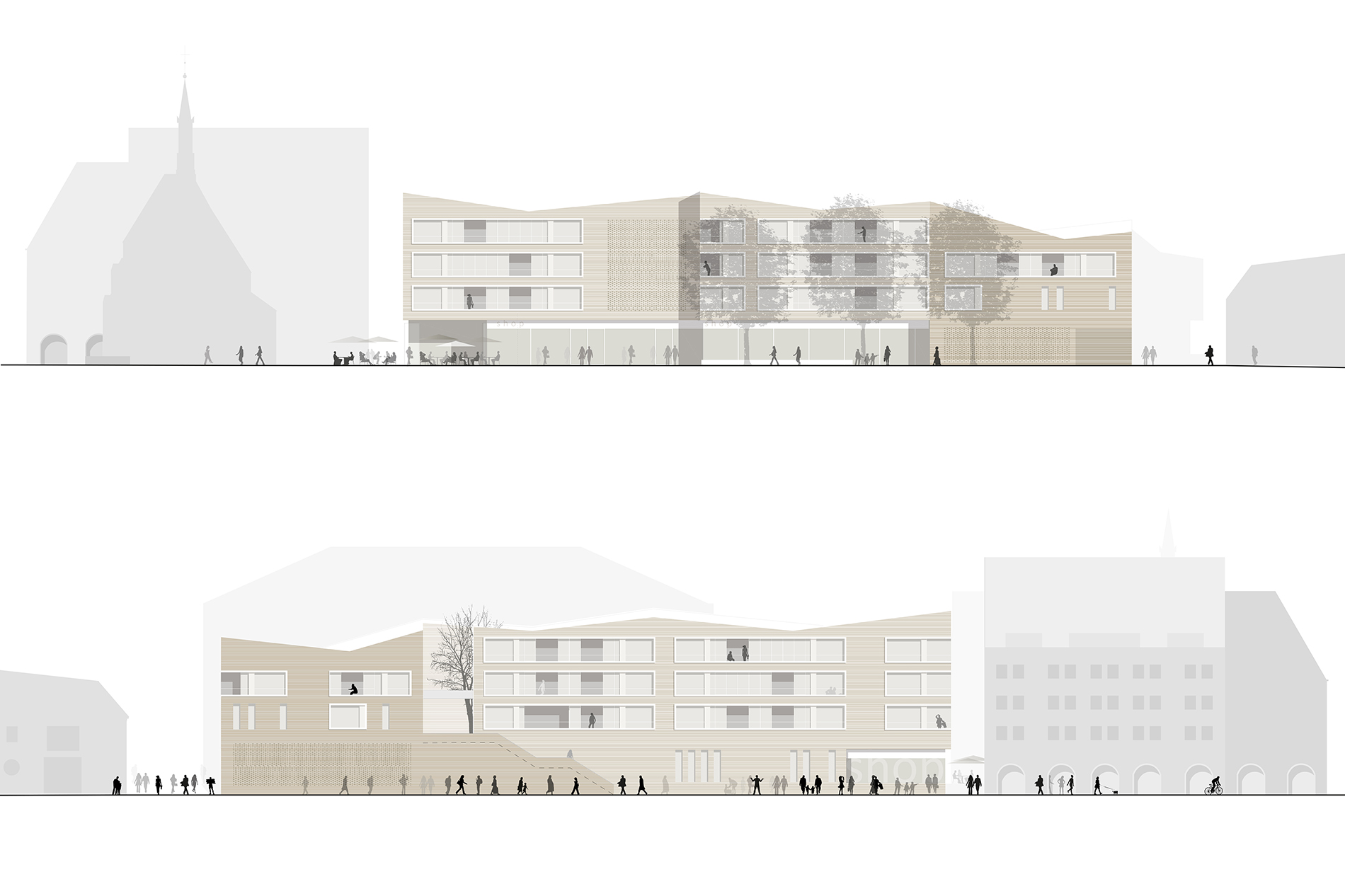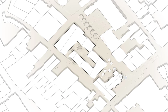 Der Baukörper, der mit seinen vier Geschossen die Höhenentwicklung der umliegenden Bebauung aufgreift, liegt über einer zweigeschossigen Tiefgarage. Im Erdgeschoss werden zur Spitalkirche hin und auf einen kleinen Platz ausgerichtet Räumlichkeiten für Gastronomie geschaffen, dahinter Flächen für den Handel. Während im ersten Obergeschoss ein Mix aus Dienstleistung und Wohnen vorgesehen ist, bleiben die beiden obersten Geschosse dem Wohnen vorbehalten. Erschlossen werden diese Ebenen vom Spitalgraben aus über eine Treppenanlage und einen Innenhof, der für die notwendige Privatsphäre sorgt.
