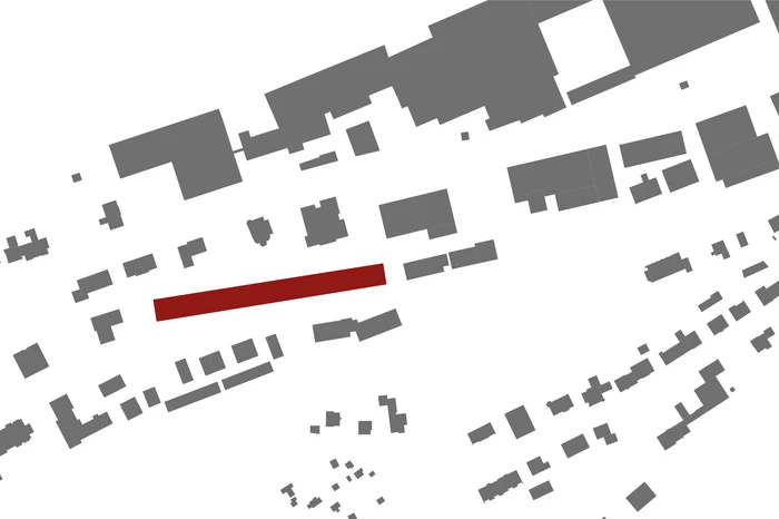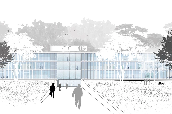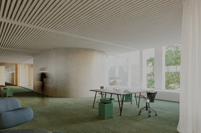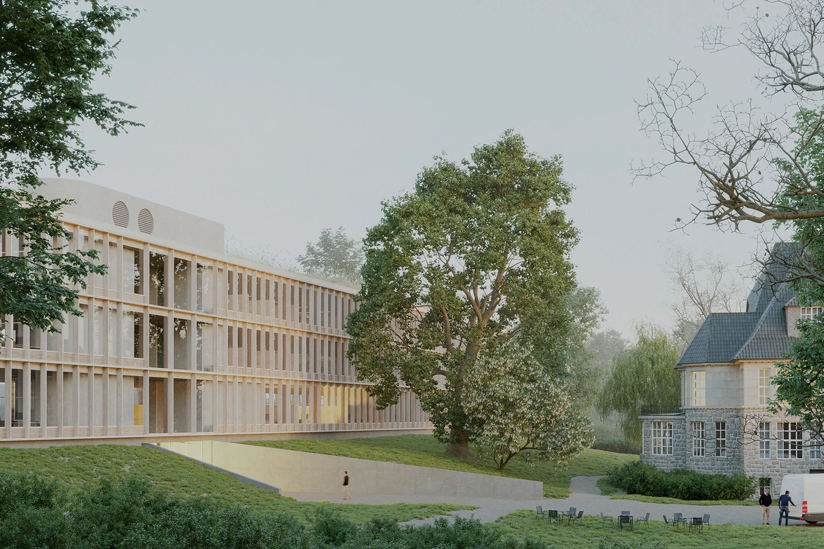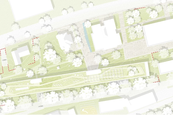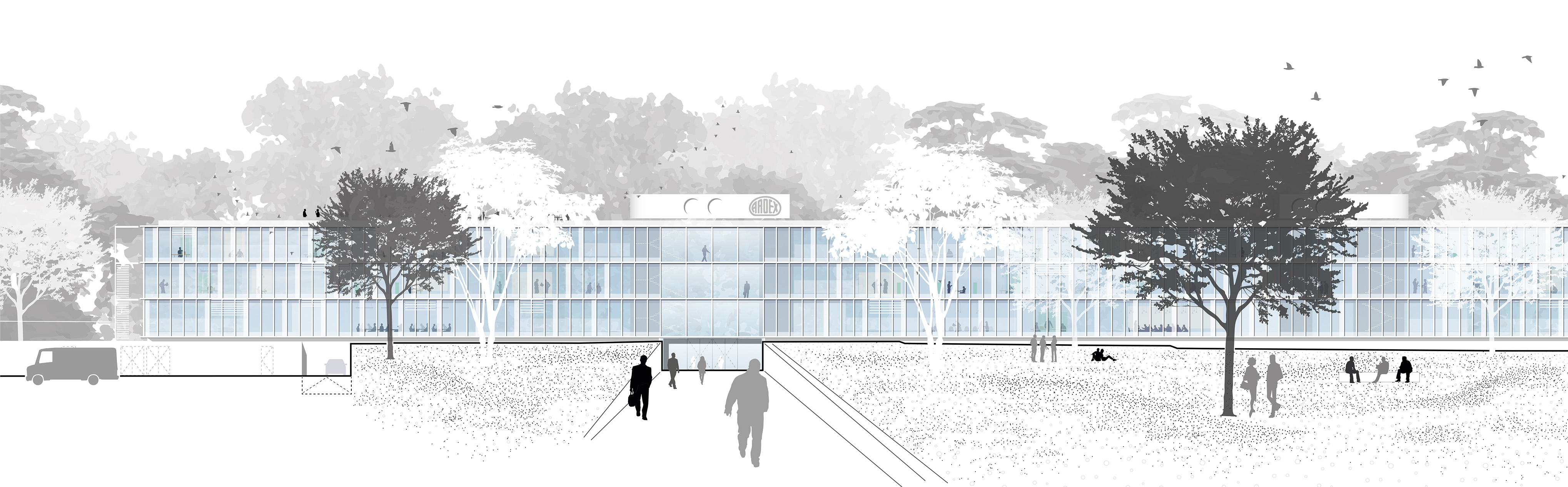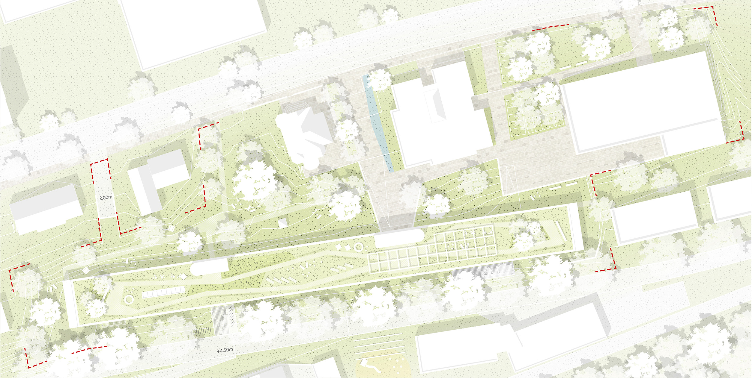 Das Bürogebäude wird an der südlichen Grundstücksgrenze parallel zur Kreisstraße und der sie flankierenden Baumreihe platziert. Der für den Erhalt des wertvollen Baumbestands notwendige Abstand wird eingehalten und die Reihe durch Neupflanzungen ergänzt. Die Konzentration aller geforderten Flächen in einem Gebäude ermöglicht eine maximale Ausnutzung des Geländes zugunsten einer durchgängigen Parklandschaft und eines reduzierten „Footprints“. Im Sinne einer ganzheitlichen Freiraumplanung beschränken sich die versiegelten Flächen auf ein Minimum. Das „Bürogebäude im Park“ verhält sich gegenüber der denkmalgeschützten Villa in einem angemessenen Rahmen sowohl was Distanz als auch Höhenentwicklung betrifft und berücksichtigt die historisch überlieferte Situation im Hinblick auf den parkartigen Gartenbereich. Es fügt sich mit seiner Höhenentwicklung und Materialwahl selbstverständlich in den städtebaulichen Kontext ein und erhält einen adäquaten Ausdruck als Unikat mit hohem Wiedererkennungswert.