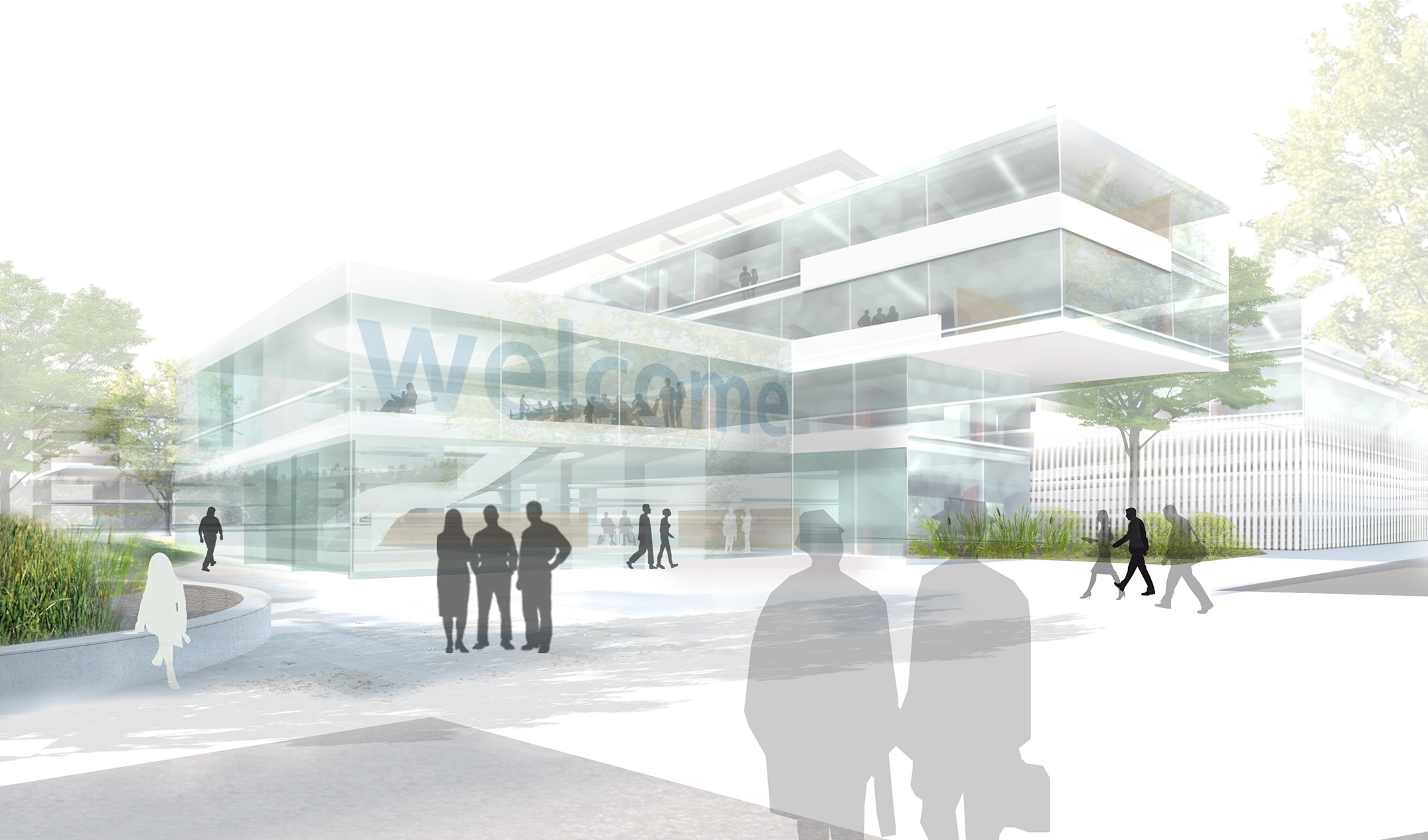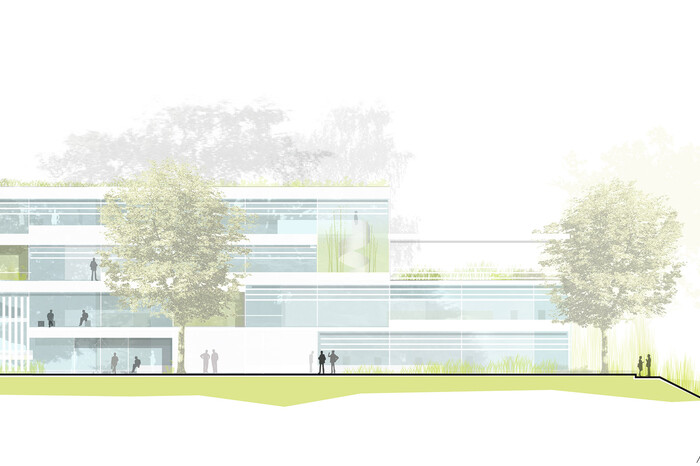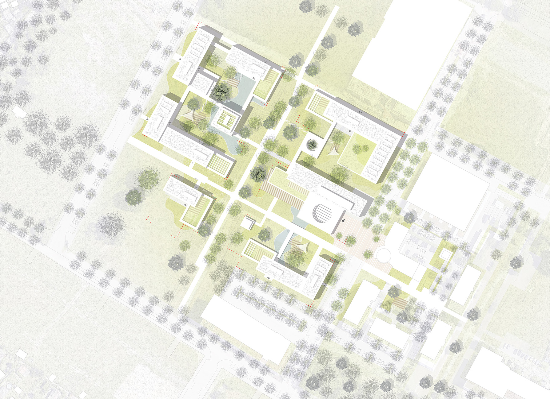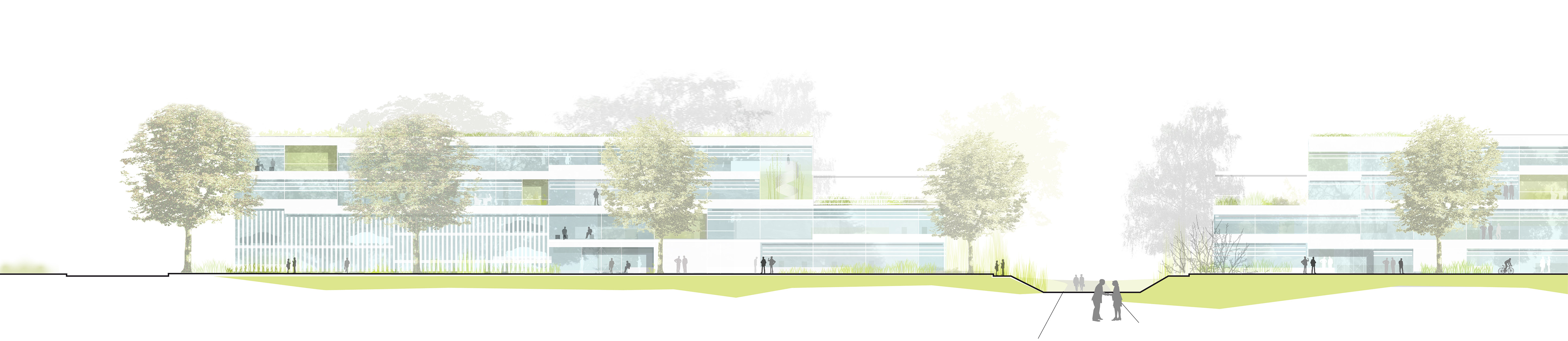 Um den gewünschten Campuscharakter für die Erweiterung des Unternehmensstandortes zu erreichen und die städtebauliche Körnung des Kontextes aufzugreifen, werden die geforderten Flächen sinnfällig auf mehrere Gebäude aufgeteilt. Entlang den Straßen definieren dem Bebauungsplan entsprechend klare Raumkanten klare Straßenräume. Die Gebäudehöhen verringern sich zum Campusinneren hin. Zusammen mit einem differenzierten Wegesystem, das unterschiedlichste Verbindungen und Zusammenhänge herstellt, entsteht ein Netzwerk, das sich über das gesamte Areal legt und Innen- und Außenräume miteinander verzahnt. Es entsteht ein durchgängiger, mit Grünflächen durchzogener Campus mit multifunktionalen Freiflächen, die in den Dachterrassen der Gebäude ihre konsequente Fortsetzung finden. Auf diese Weise werden unterschiedliche Orte für vielfältige Aktivitäten im Außenraum angeboten und die Arbeitswelten im Inneren mit Freiraumarbeitsplätzen verknüpft. Es werden hohe Aufenthaltsqualitäten geschaffen, die das Wohlbefinden der Campusnutzer und der Besucher steigern.