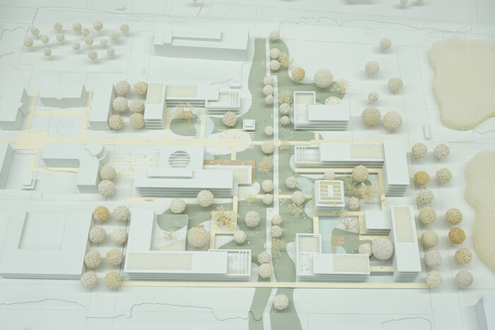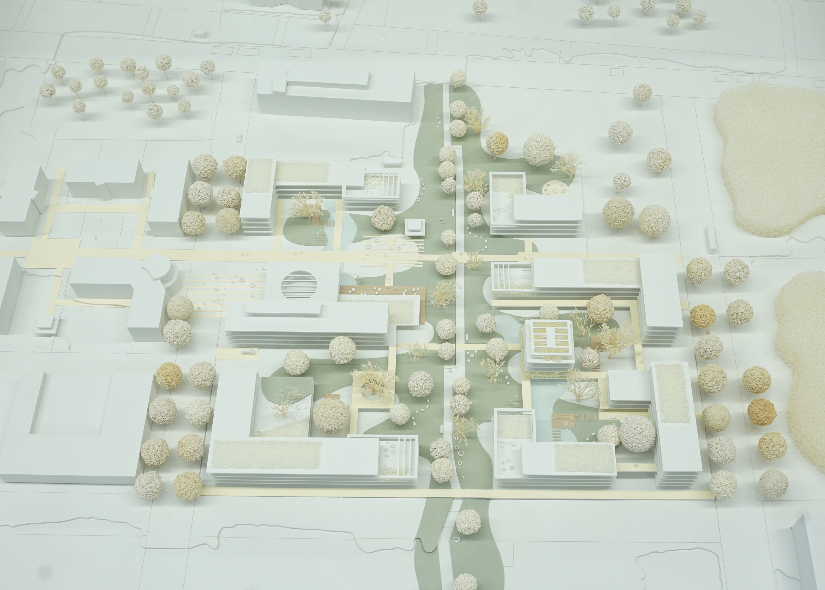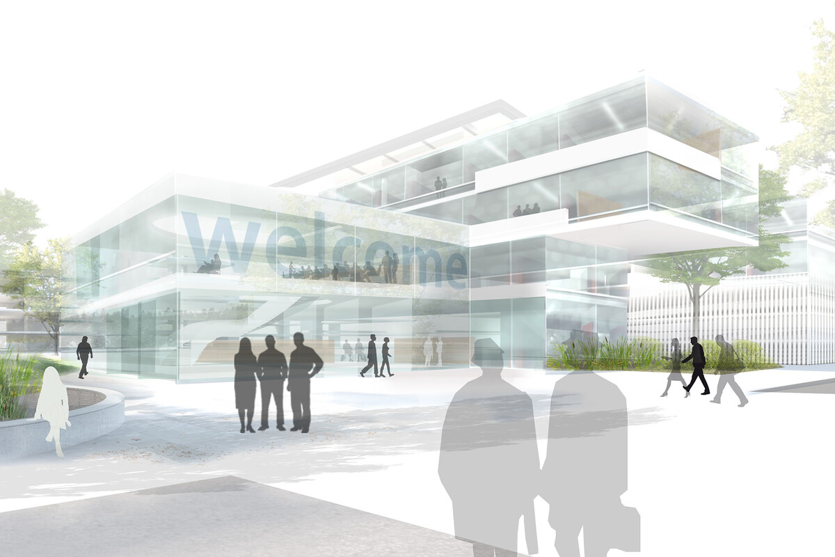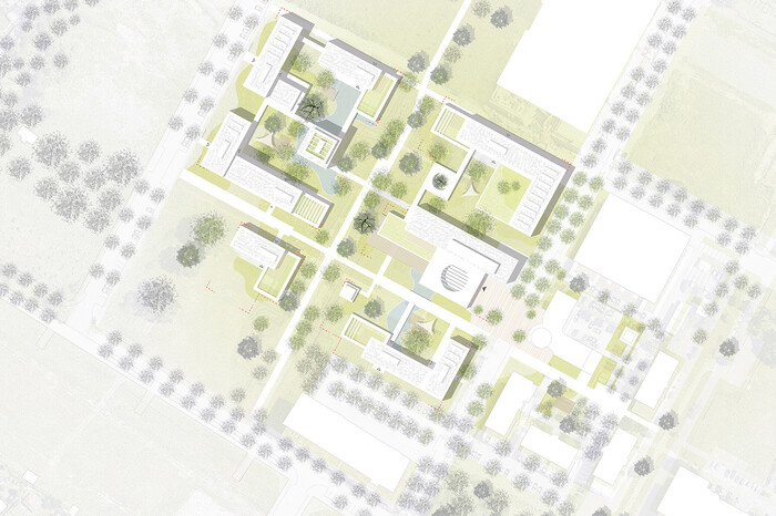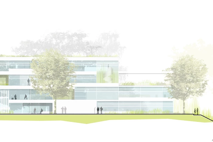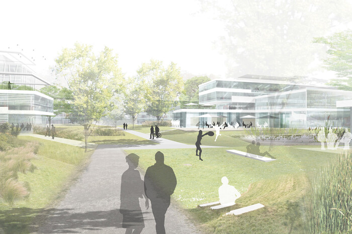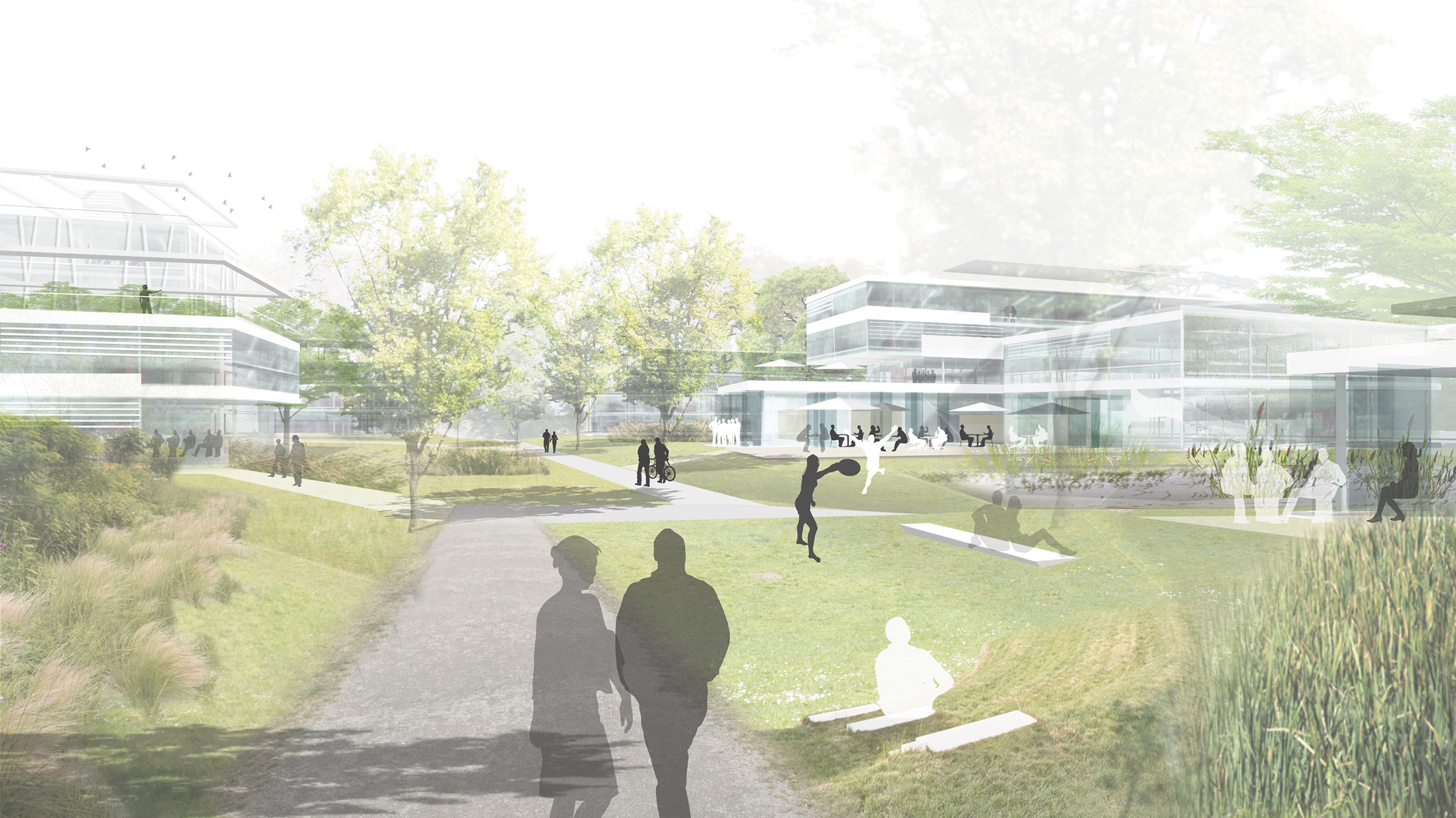 Um den gewünschten Campuscharakter für die Erweiterung des Unternehmensstandortes zu erreichen und die städtebauliche Körnung des Kontextes aufzugreifen, werden die geforderten Flächen sinnfällig auf mehrere Gebäude aufgeteilt. Entlang den Straßen definieren dem Bebauungsplan entsprechend klare Raumkanten klare Straßenräume. Die Gebäudehöhen verringern sich zum Campusinneren hin. Zusammen mit einem differenzierten Wegesystem, das unterschiedlichste Verbindungen und Zusammenhänge herstellt, entsteht ein Netzwerk, das sich über das gesamte Areal legt und Innen- und Außenräume miteinander verzahnt. Es entsteht ein durchgängiger, mit Grünflächen durchzogener Campus mit multifunktionalen Freiflächen, die in den Dachterrassen der Gebäude ihre konsequente Fortsetzung finden. Auf diese Weise werden unterschiedliche Orte für vielfältige Aktivitäten im Außenraum angeboten und die Arbeitswelten im Inneren mit Freiraumarbeitsplätzen verknüpft. Es werden hohe Aufenthaltsqualitäten geschaffen, die das Wohlbefinden der Campusnutzer und der Besucher steigern.