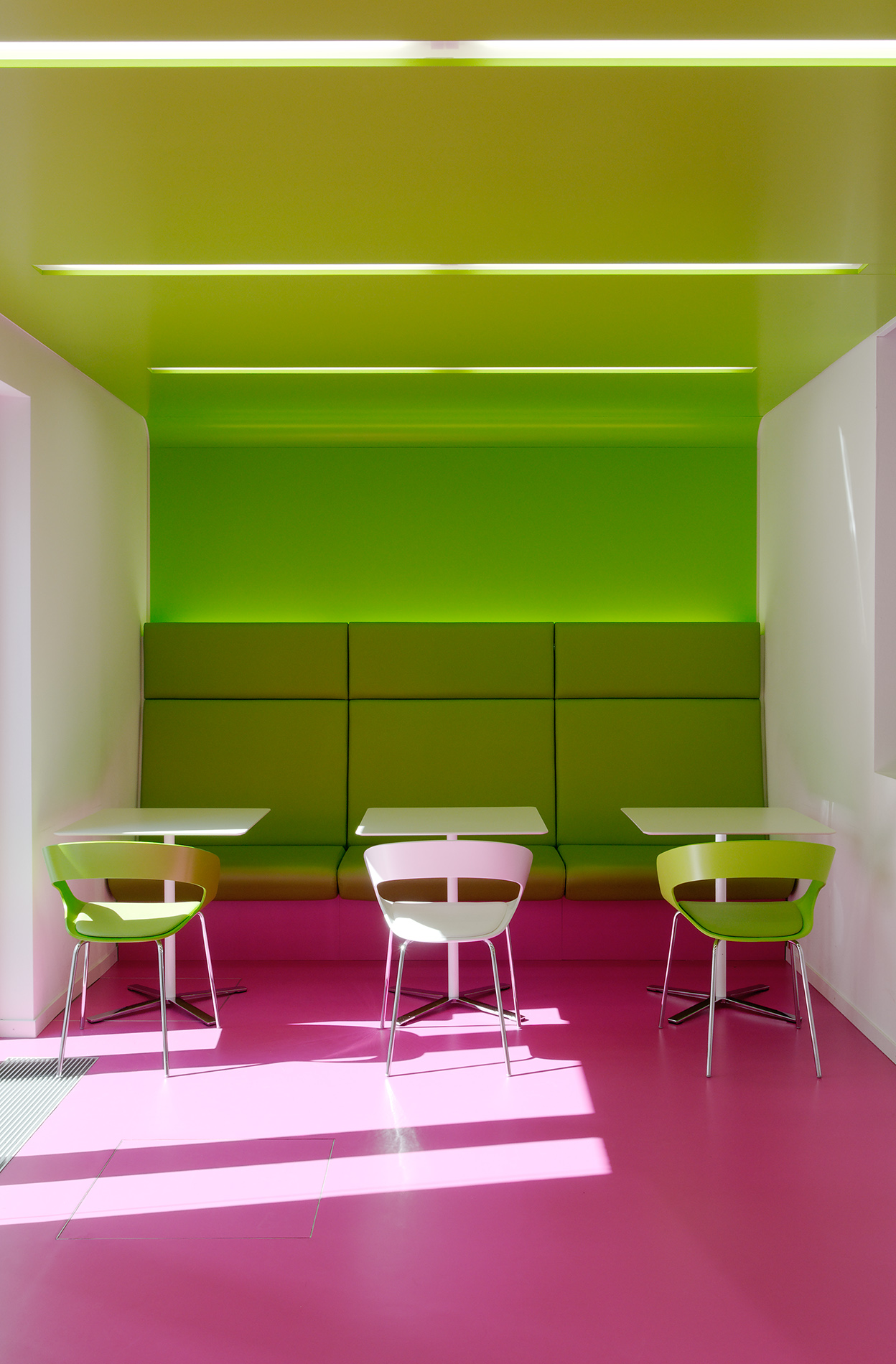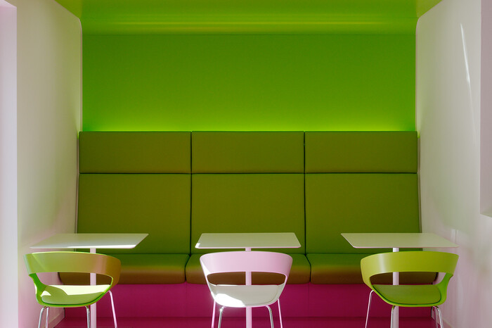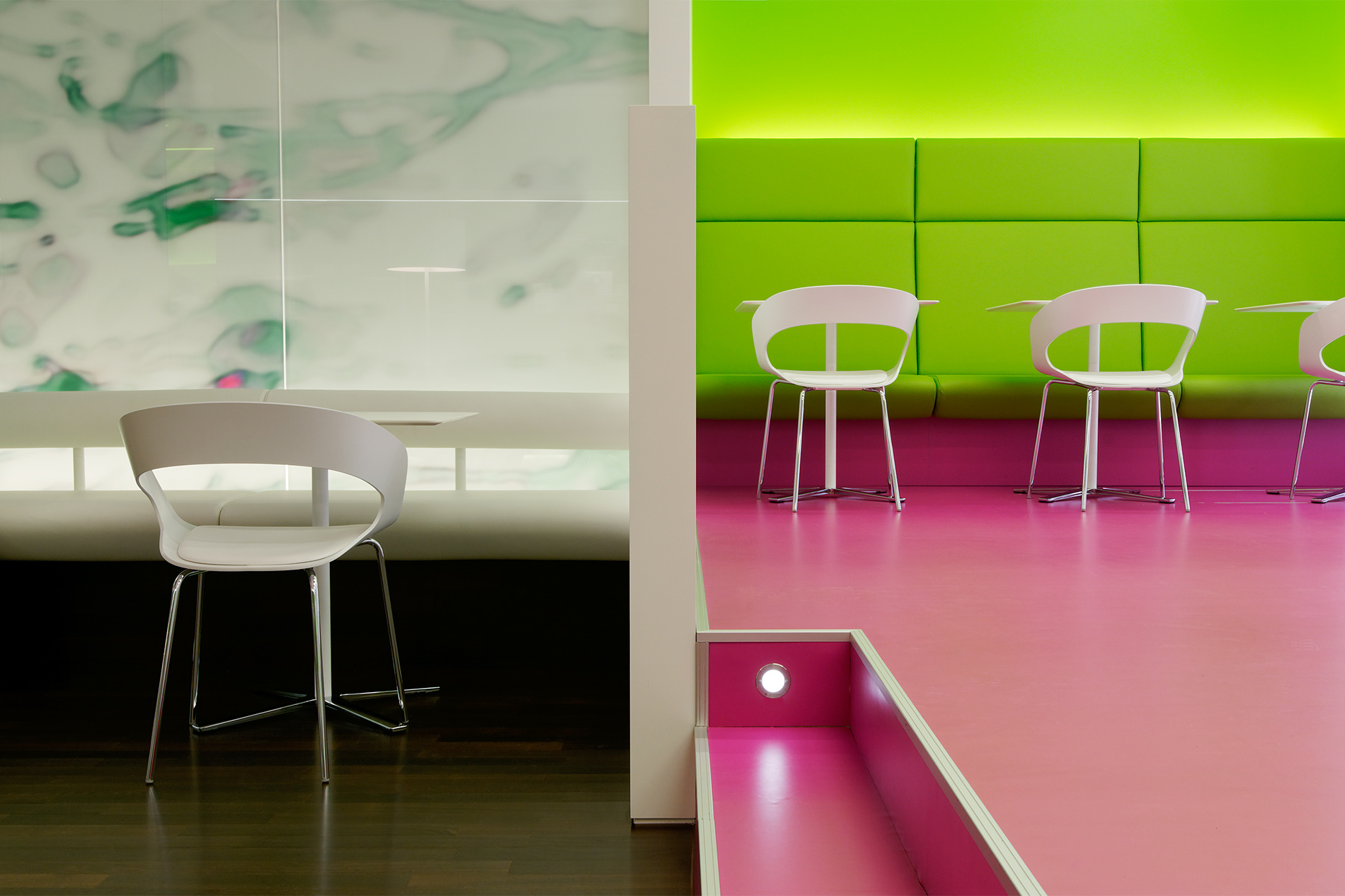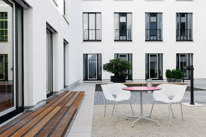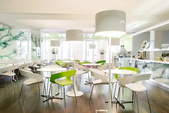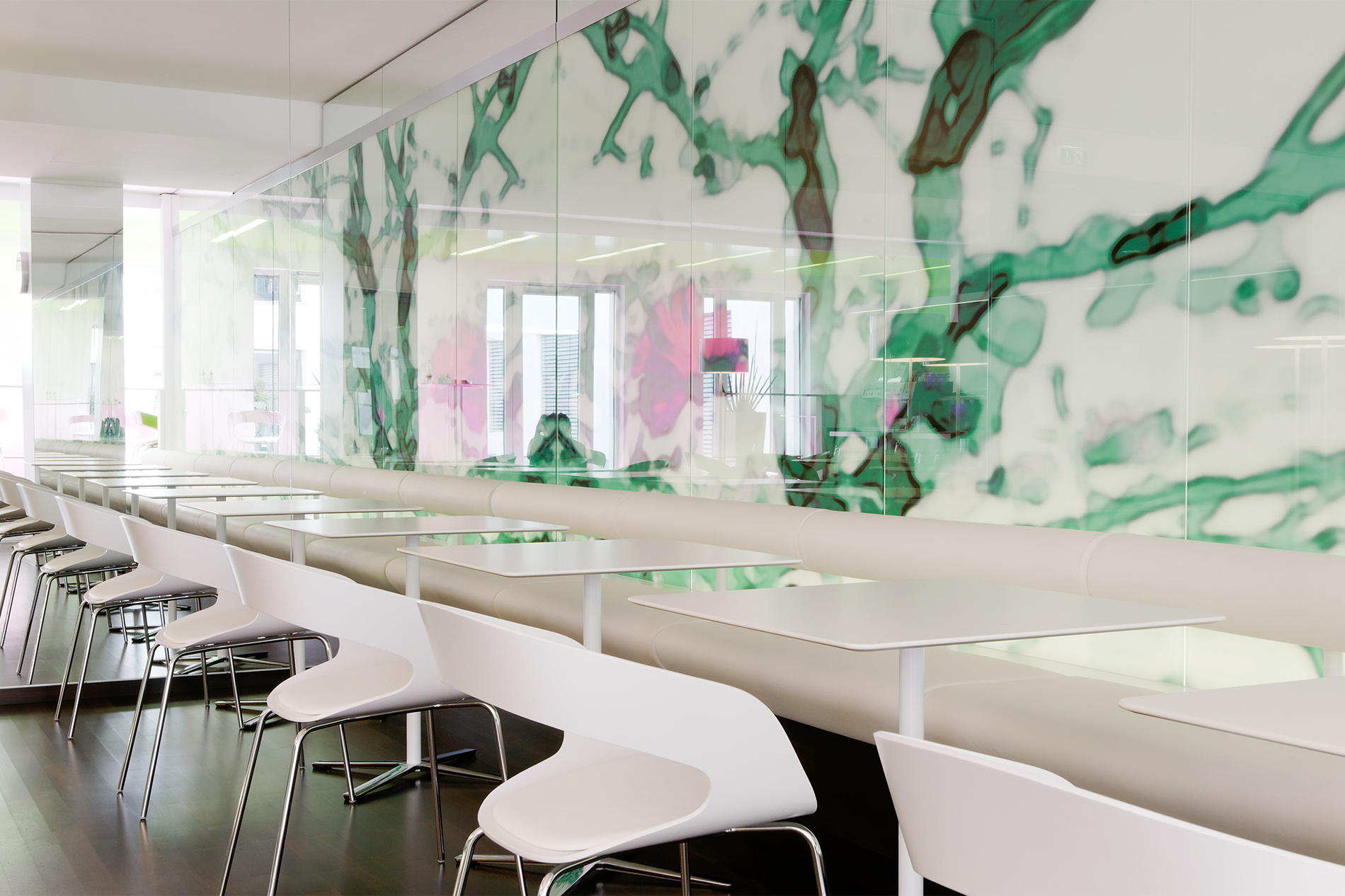 Die Cafeteria am Kronprinzbau dient den Angestellten als Ort der Kommunikation und Kontemplation. Der Gastraum gliedert sich in zwei Bereiche: gegenüber der Ausgabelinie lädt eine lange Sitzbank zum Verweilen ein. Der Blick schweift über die hinterleuchtete und mit Kirschblüten bedruckte Glaswand. Über zwei Stufen erreicht man den zweiten ruhigeren Bereich, den zwei sich gegenüberliegende Nischen prägen. Vom Podest aus gelangt man in den neu gestalteten Innenhof.