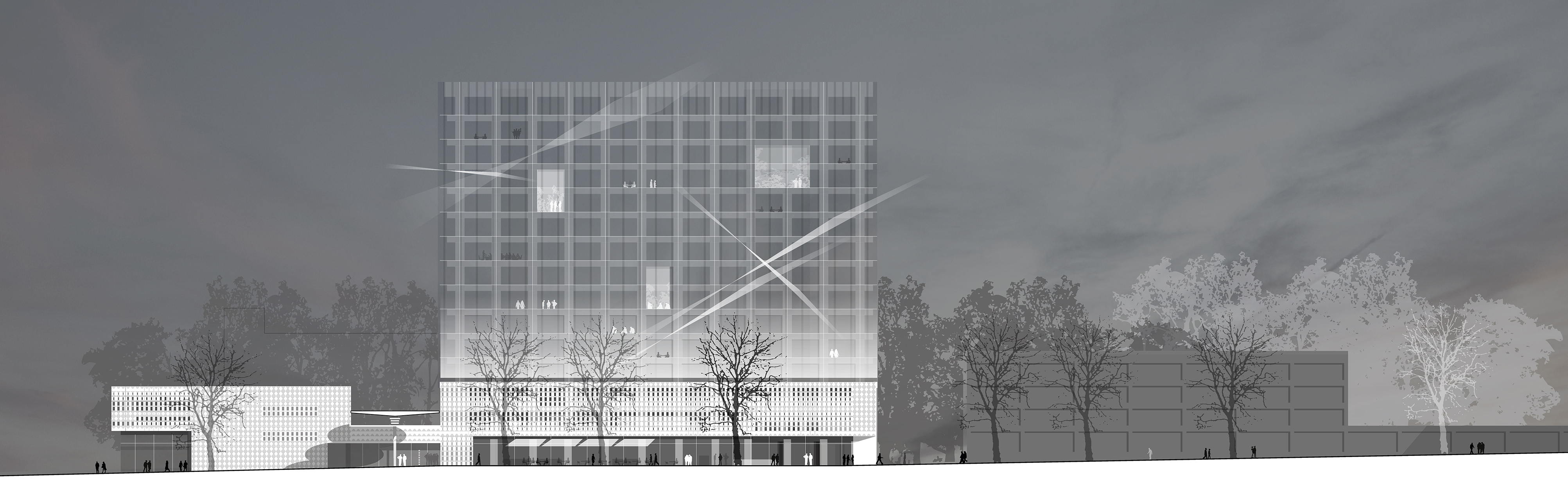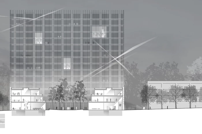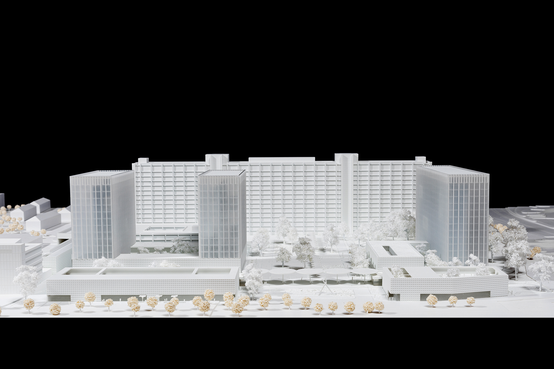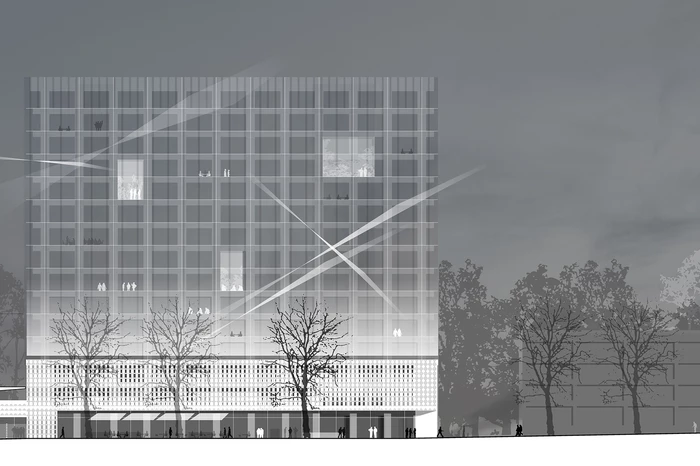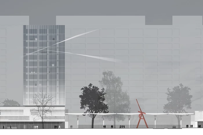 Die prägnanteste bauliche Ergänzung bilden drei Hochhäuser in 90°-Stellung zum bestehenden Haupthaus. Sie orientieren sich an dessen Höhenentwicklung und beinhalten alle neuen Bürobereiche. Im Gegensatz zu diesem werden sie als kristalline Baukörper ausgebildet. Während das Haupthaus seine Struktur offen zeigt, lässt sich die aus Dämmbeton bestehende Tragkonstruktion der Neubauten hinter schräg gestellten Glaselementen nur erahnen. Je nach Tageszeit und Lichtverhältnissen ändern die Büroscheiben ihr Erscheinungsbild.