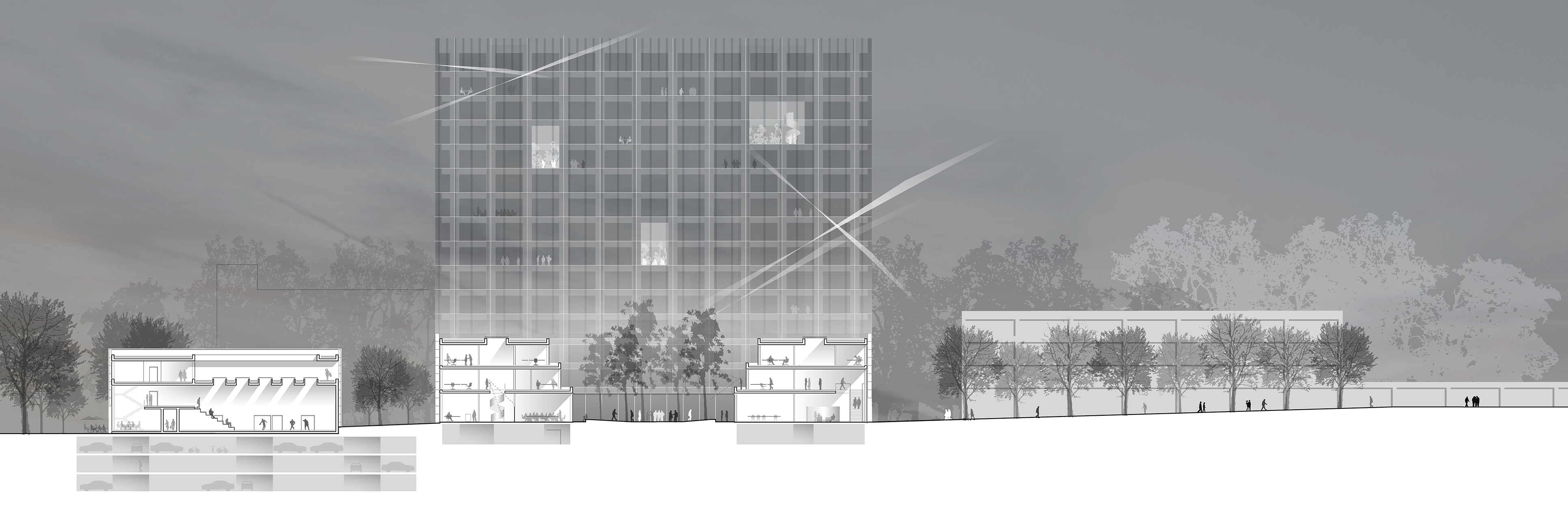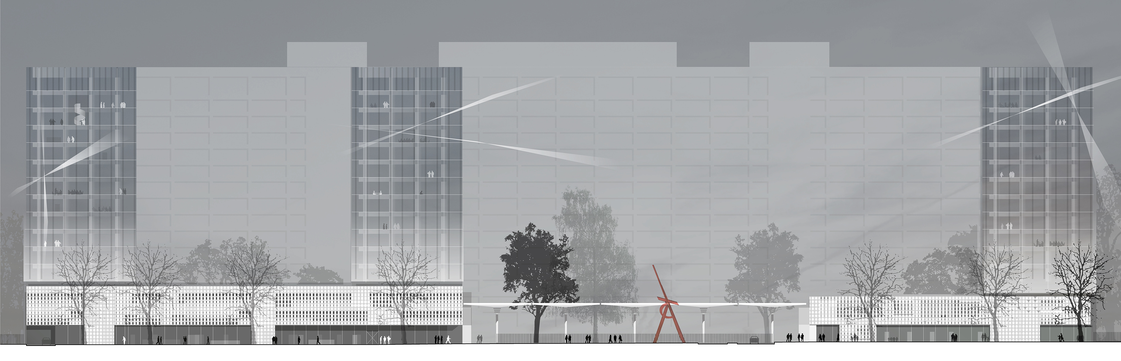Die Büroscheiben erheben sich über einer 2- bzw. 3-geschossigen Sockelzone, die alle weiteren Funktionen enthält. Die Fassaden im Sockelbereich präsentieren sich als ruhiges, plastisches Relief aus profilierten Betonkassetten, die zwischen vollständig geschlossen bis ganz offen variieren.