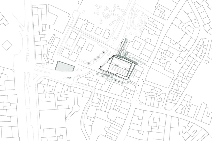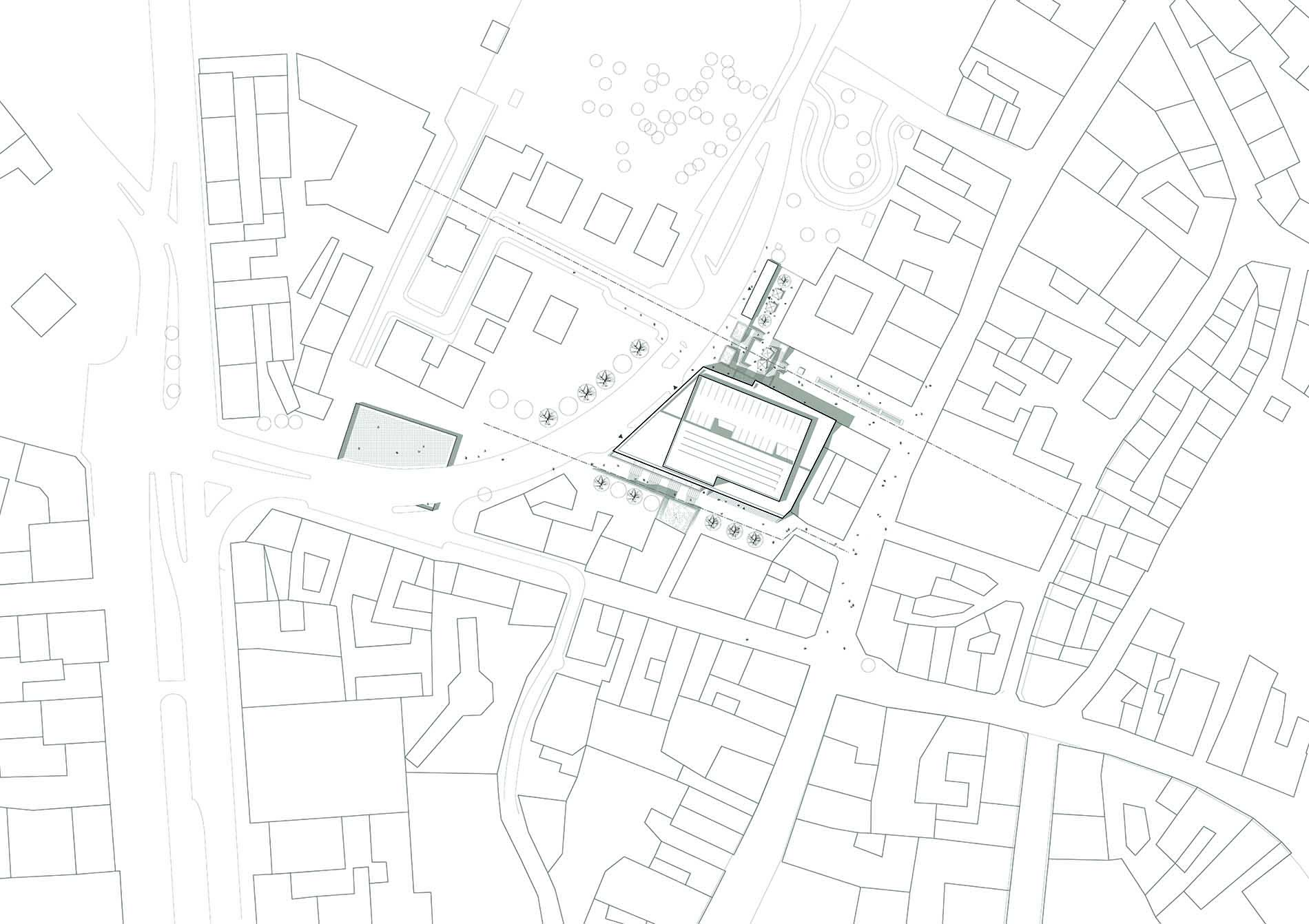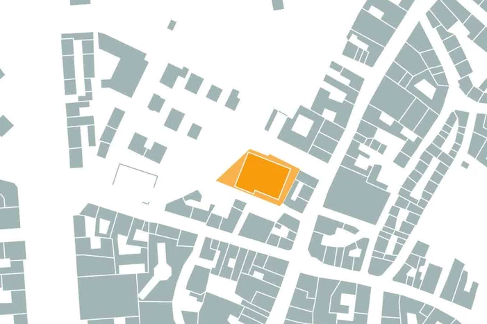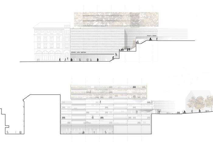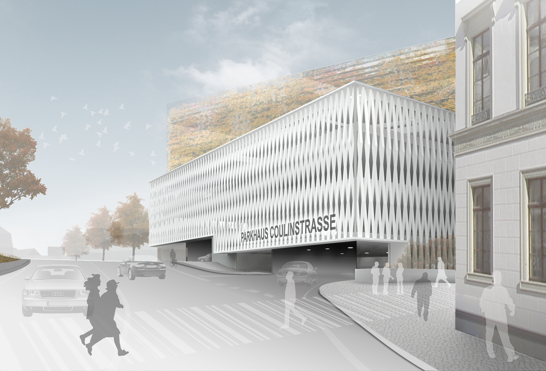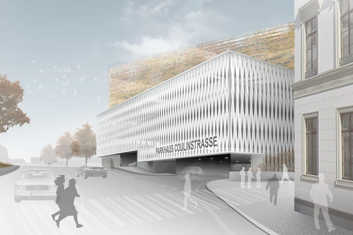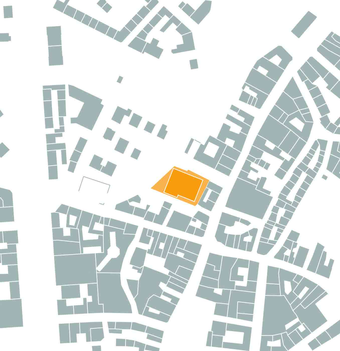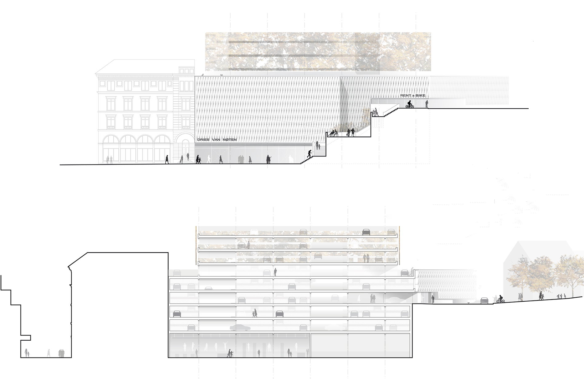 Das Bauvolumen wird aufgebrochen und in zwei Gebäudeteilen organisiert: einem unteren Teil, der sich in Höhe, Farbgebung und Proportion mit der umgebenden Bebauung auseinandersetzt und einem oberen Teil, der sich vom Sockel löst und als „fünfte Ansicht“ fungiert. Dieser Teil unterscheidet sich äußerlich durch seine Fassadengestaltung – die „Hängenden Gärten“. Das Parken im Split- Level- System schafft hierfür günstige Voraussetzungen.