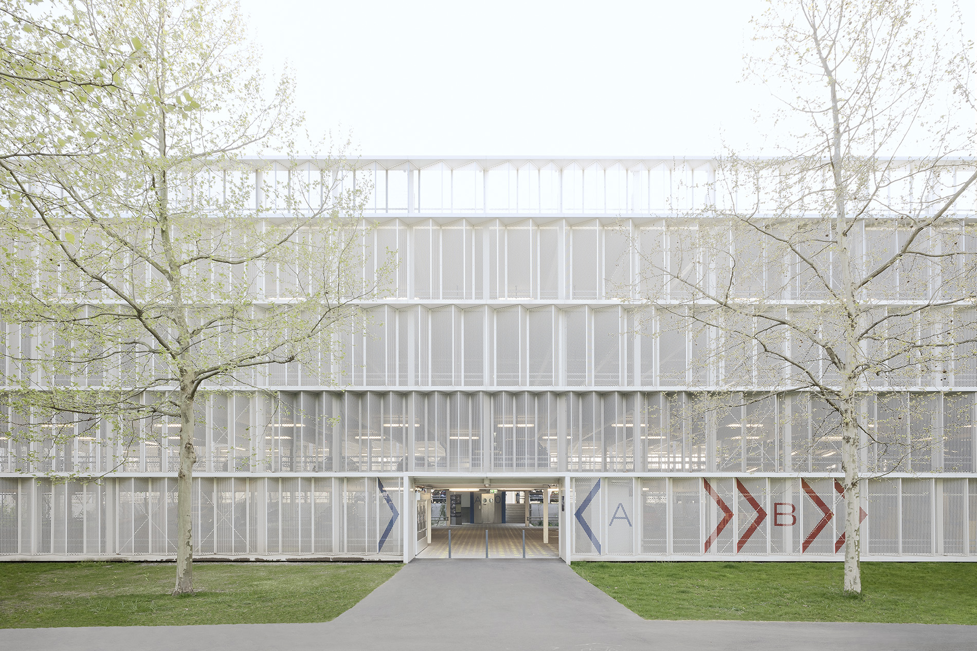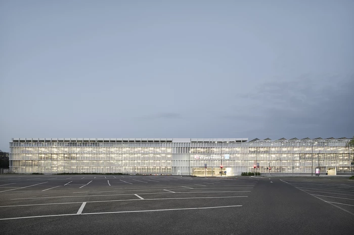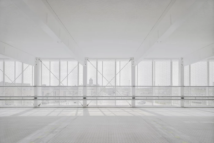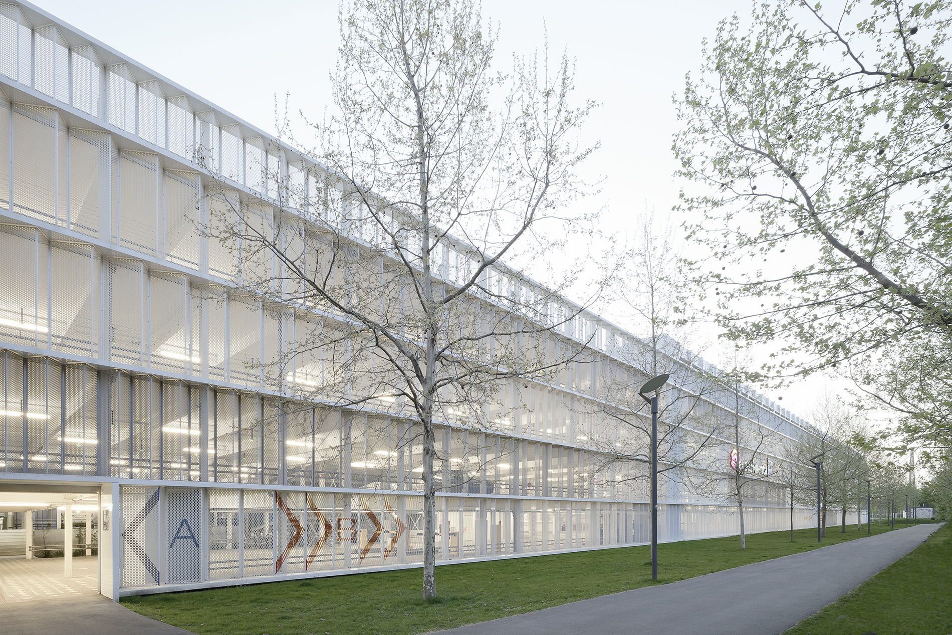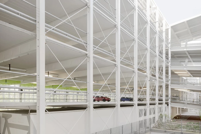 Großzügigkeit und Offenheit sind die tragenden und charakteristischen Elemente des Parkhauses. Gelungen ist diese große Transparenz zum einen durch die nach außen verlagerten Stützelemente, zum anderen durch die Wahl lichtdurchlässiger Materialien. Die Fassadenhaut besteht aus gefaltetem, perforiertem Stahlblech, dessen Lochungsanteil so bemessen ist, dass räumliche Schichtungen und unterschiedliche Lichtverhältnisse wahrnehmbar sind.