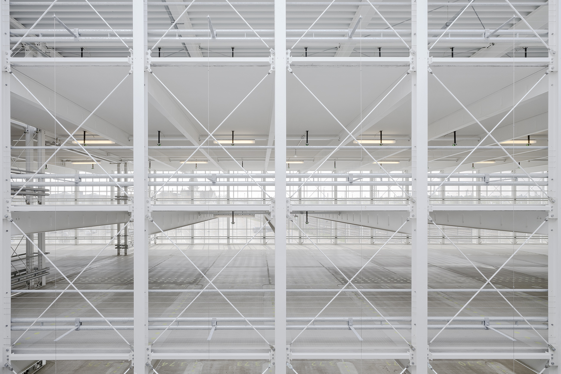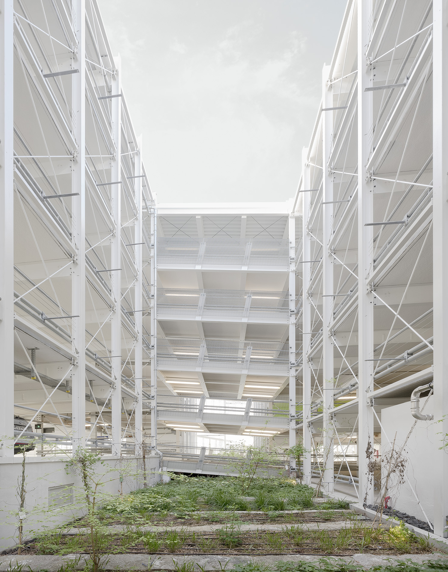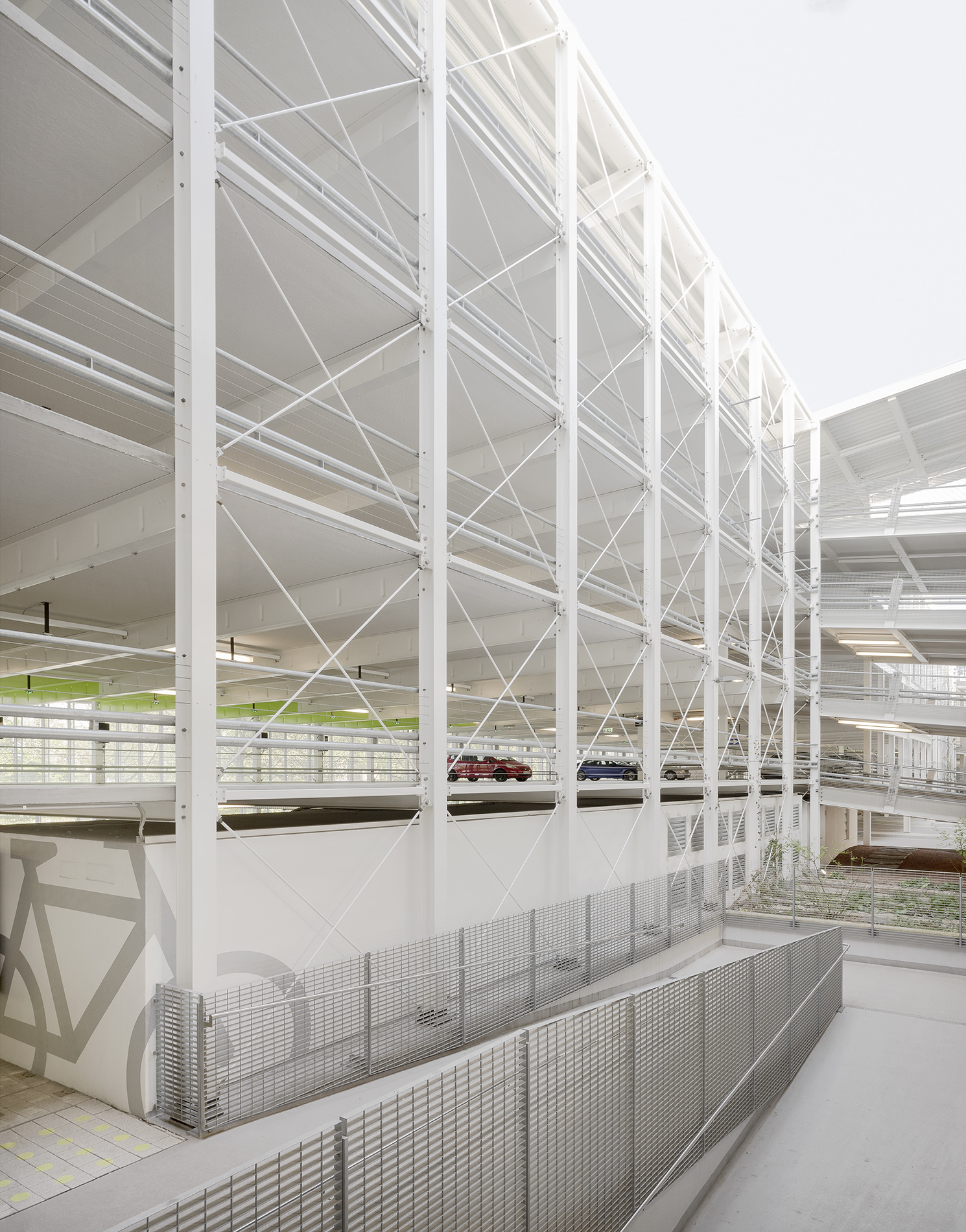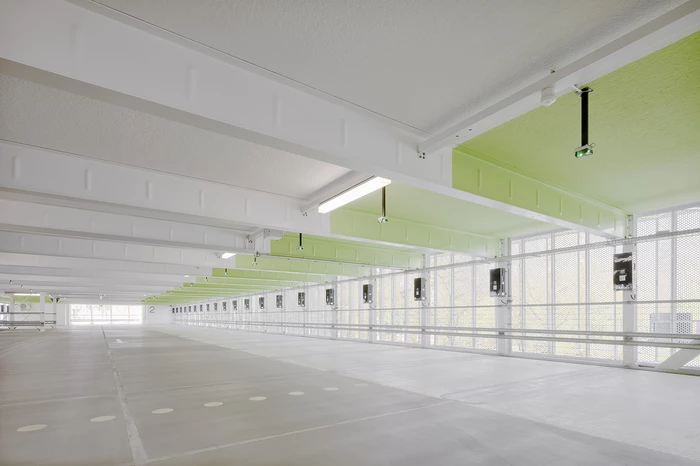 Der Erweiterungsbau schließt im Süden direkt an das Bestandsgebäude an und ist in Anlehnung an dessen Volumetrie in zwei längliche, 16,00 m breite Baukörper gegliedert, die in einem Abstand von ca. 5,40 m zueinander angeordnet sind. Über Rampen und ein zentrales Treppenhaus sind sie miteinander verbunden. Fünf Geschosse bieten Platz für weitere 592 Autos, die auf beiden Seiten der Fahrgassen in einem Winkel von 90° angeordnet sind. Die Baukörper sind frei überspannt, so dass das Rangieren sowie Begehen zwischen den Fahrzeugen nicht durch Stützen gestört werden.