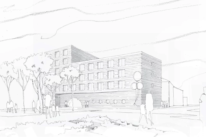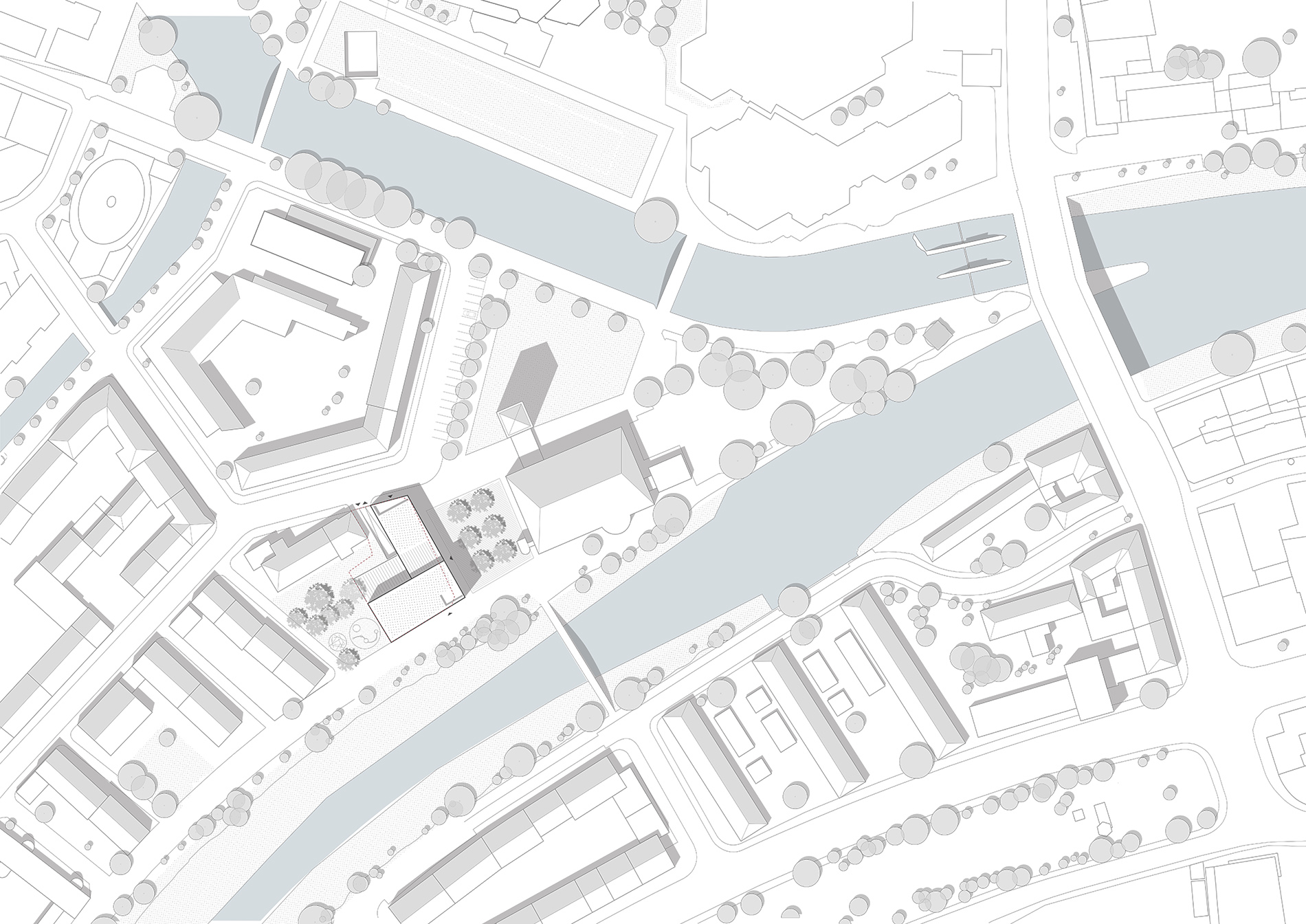 Die Volumetrie des Neubaus reagiert auf die unterschiedlichen städtebaulichen Rahmenbedingungen. Im Erdgeschoss folgt der Baukörper den Grundstücksgrenzen und definiert damit klare Raumkanten zur Rennfeld- und Nagoldstraße und zum Melanchthonplatz. Ab dem ersten Obergeschoss wird die Gebäudekante an der Platzseite hervorgezogen. Die Auskragung dient einerseits der Betonung des Haupteingangs, andererseits lenkt das Gebäude damit in Richtung Fußgängerbrücke. Der viergeschossige Gebäudeteil greift die Kleinmaßstäblichkeit der angrenzenden Wohnbebauung auf, während die 6-Geschossigkeit entlang der Nagold auf den Maßstab des Flussraums und der gegenüber liegenden Stadtkirche mit Glockenturm reagiert.