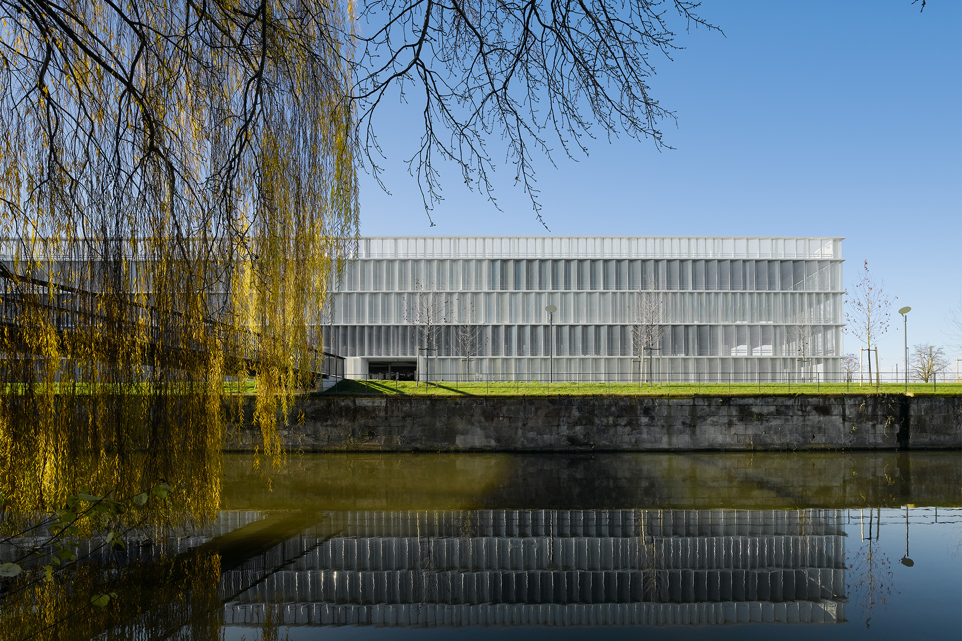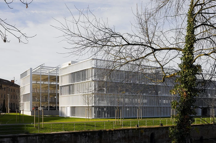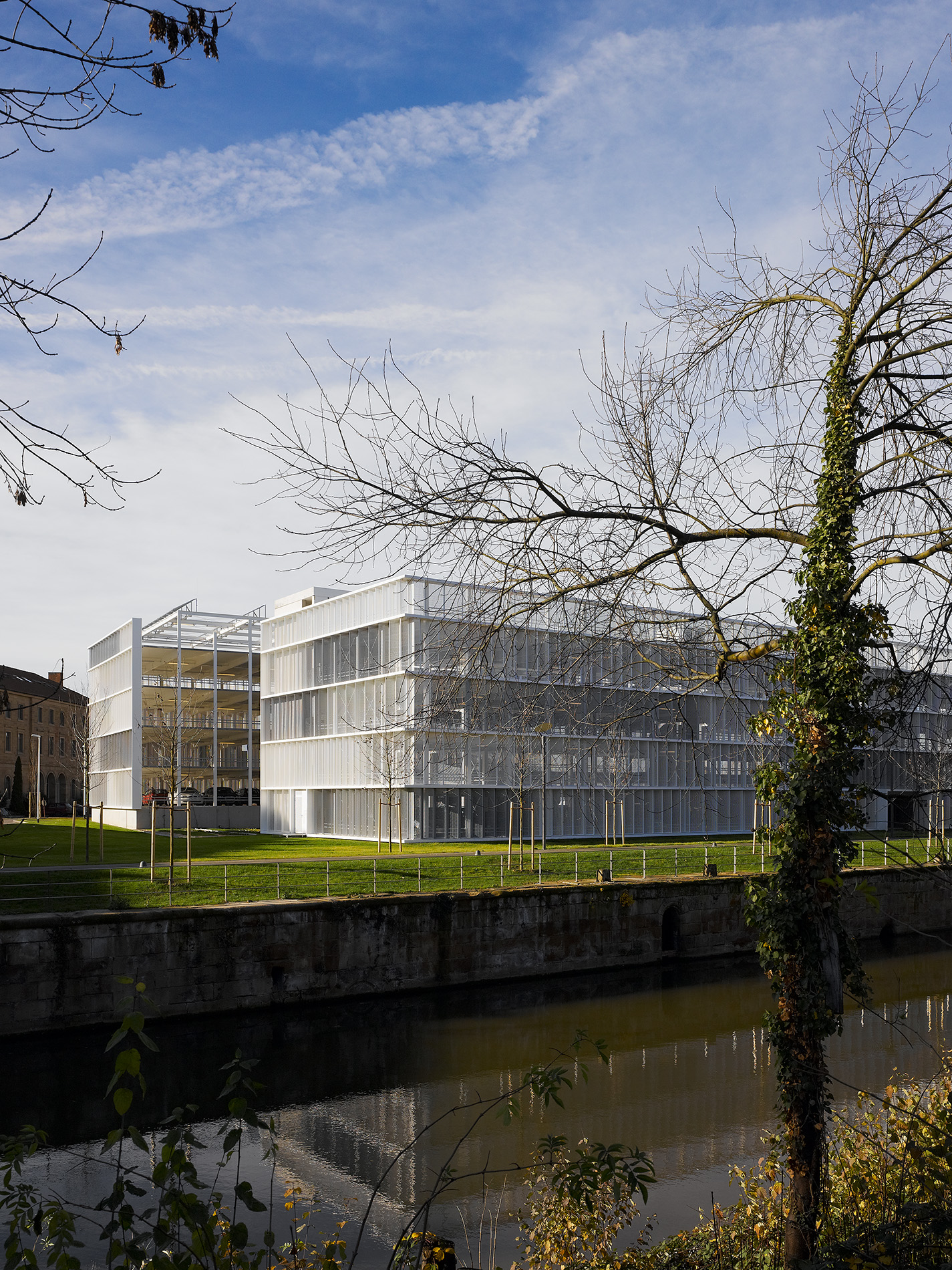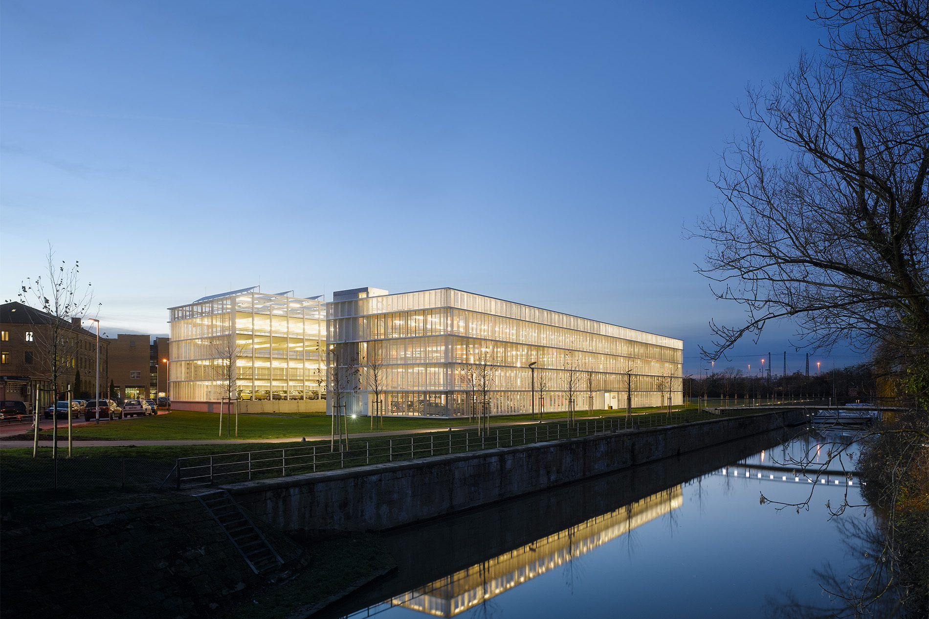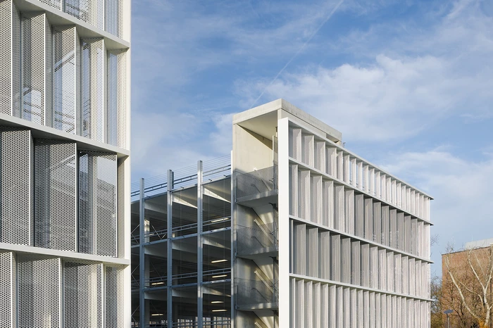 Die außergewöhnliche Lage des Parkhauses im Spannungsfeld zwischen der Innenstadt und der neu entstehenden Parkanlage für die “Bundesgartenschau Heilbronn 2019” schaffte besondere städtebauliche Rahmenbedingungen. Darüber hinaus steht das Parkhaus in direkter funktionaler Verbindung mit dem neuen Science-Center “Experimenta” im Hagenbucher-Gebäude. Die prominente Lage des Grundstücks und dessen Fernwirkung Richtung Innenstadt geben Anlass für die Zeichenhaftigkeit des Gebäudes am Wilhelmskanal. Klarheit, Einfachheit und die Reduktion auf das Wesentliche bestimmen die formale Gestaltung.