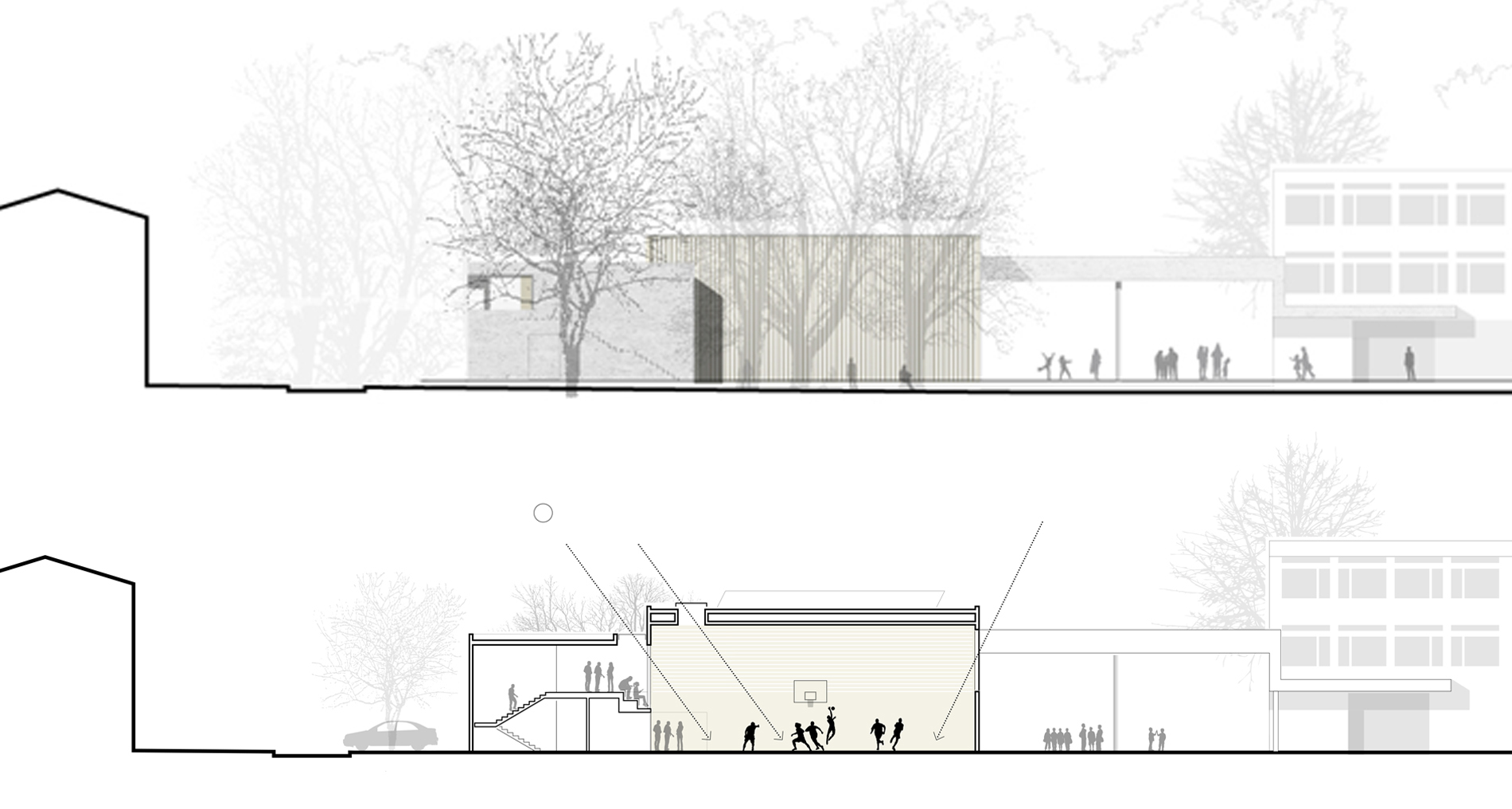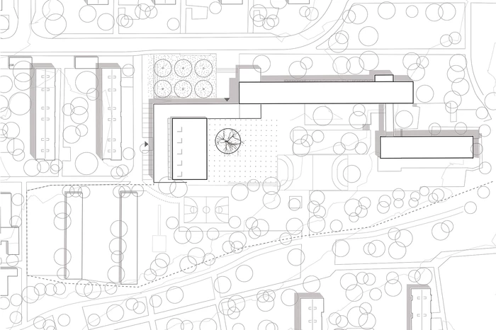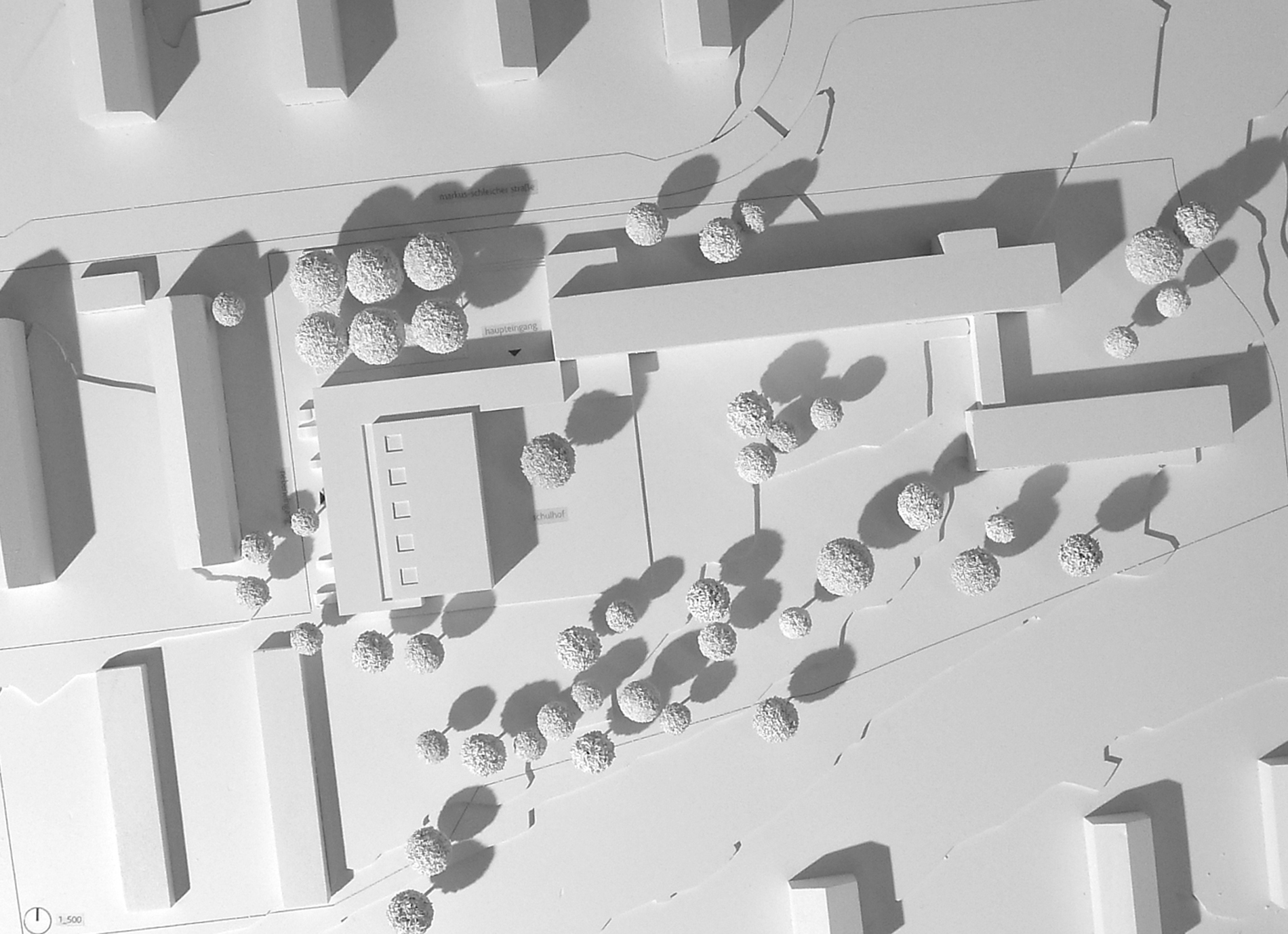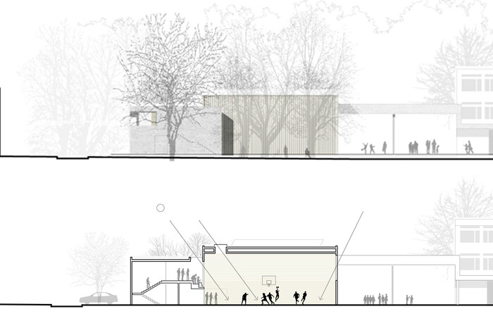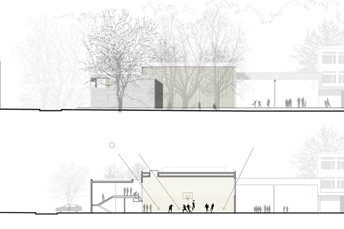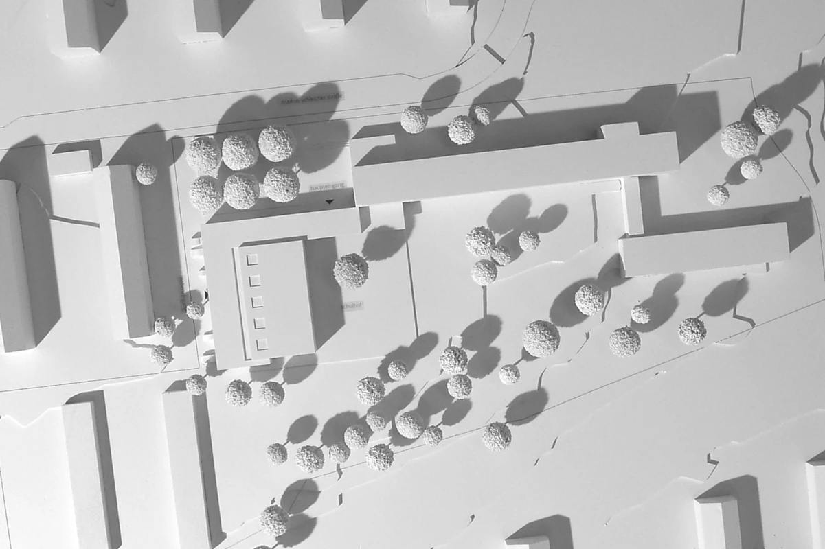 Die vorhandenen Baufluchten des Altbaus werden zum Teil aufgenommen und fortgeführt und schaffen so eine übersichtliche und eindeutige Eingangssituation in den Schulcampus. Es entsteht ein kleiner urbaner Vorplatz, der als Übergang vom öffentlichen in den schulischen Bereich fungiert. Der neue Baukörper schafft zur angrenzenden Wohnbebauung einen ruhigen Abschluss und führt zu einer deutlichen räumlichen Aufwertung des vorhandenen Schulhofs. Die bestehende Grünanlage im Süden wird weitestgehend erhalten und in den neugestalteten Schulhof einbezogen. Der Hof ist Teil einer Platz- bzw. Raumfolge, die sich über den Bereich vor der Schule, die neue Sporthalle bis hin zum neu geschaffenen Außen-Sportbereich erstreckt und dadurch den „Campusgedanken“ stärkt.