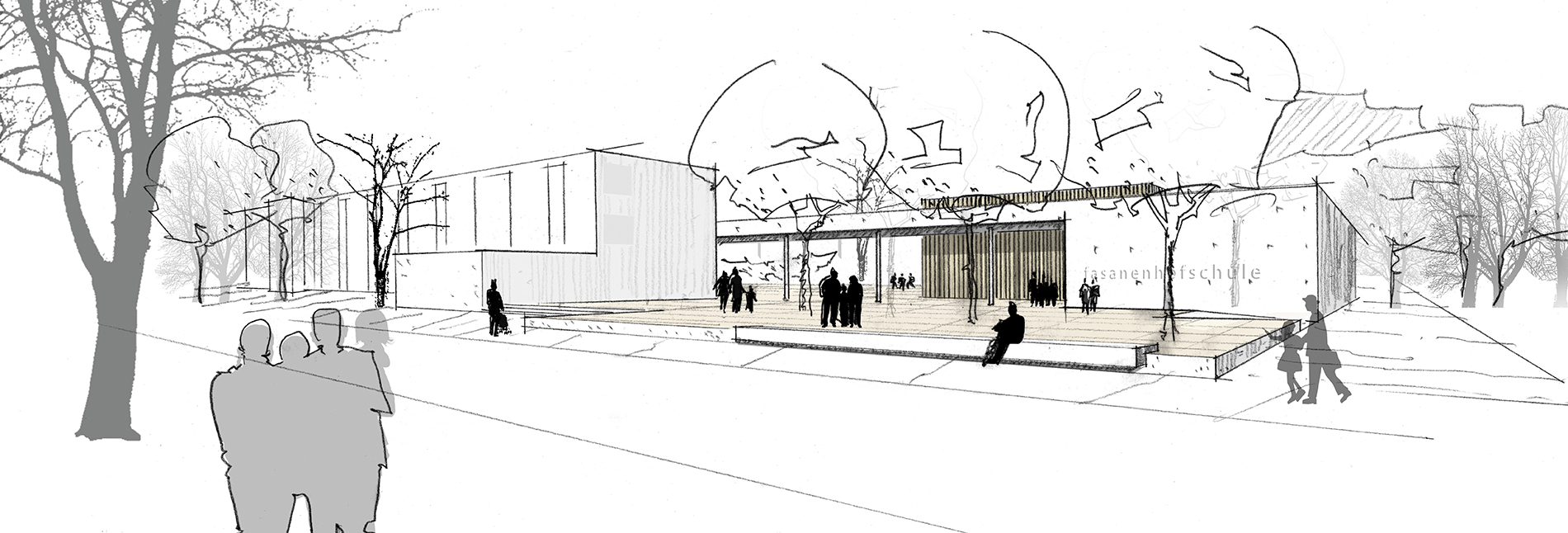 Das Grundstück für den Ersatzneubau der bestehenden Sporthalle der Grund- und Hauptschule Fasanenhof befindet sich im Spannungsfeld zwischen Mehrfamilienhäusern im Westen und angrenzendem Grünbereich im Süden. Durch die Positionierung der neuen Halle sollte die städtebauliche Situation des vorhandenen Gebäudeensembles so ergänzt werden, dass eine ausdrucksstarke, markante Gesamtanlage mit funktional differenzierten, qualitätsvollen Außenbereichen entsteht.