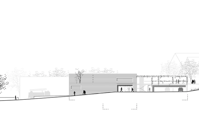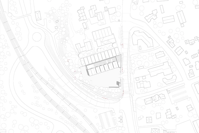 Der Entwurf sieht eine Konzentration der differenzierten Baumaßnahme im nördlichen Grundstücksbereich vor, um den Eingriff in die mit Altlasten kontaminierte Fläche so gering wie möglich zu halten. Die kompakte, flächensparende Gebäudedisposition trägt sowohl der Wirtschaftlichkeit und den Funktionsabläufen als auch der begrenzt zur Verfügung stehenden Ressource Boden Rechnung.