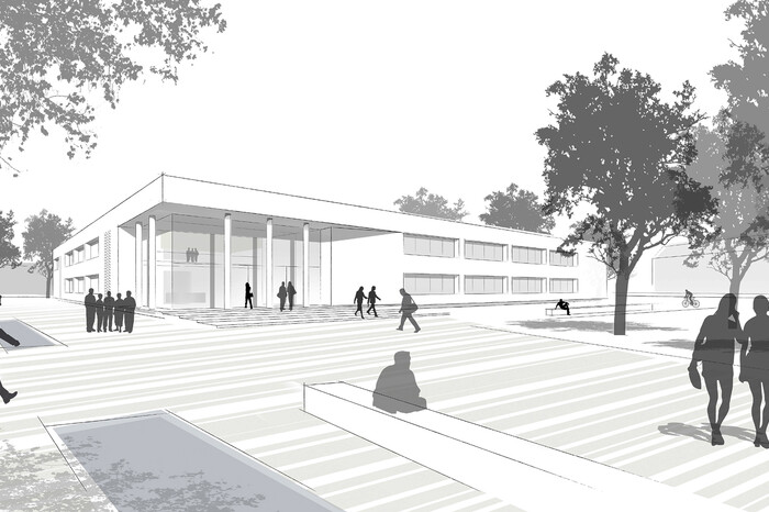 Das Wettbewerbsgrundstück liegt im Spannungsfeld zwischen der vierspurig ausgebauten Hauptverkehrsachse B303, einer Mischbauweise mit Wohnen und Gewerbe und den angrenzenden Sportflächen. Das neue Fakultätsgebäude mit seiner großzügigen, übereck angelegten Eingangssituation, bildet den Anfangspunkt der zukünftigen Campusachse und schafft durch seine klare, kraftvolle Kubatur und Ausformung einen angemessenen Auftakt der städtebaulichen Neuausrichtung des ehemaligen Militärstandortes.
