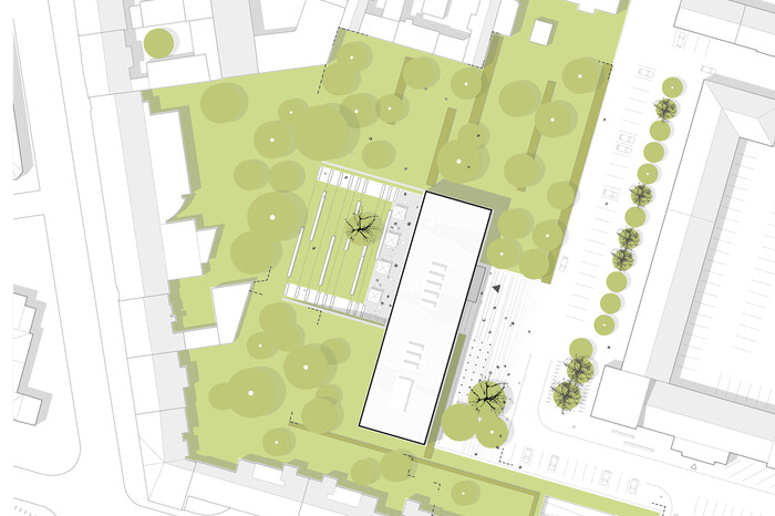 Die Lage des Grundstücks in direkter Nachbarschaft zur typischen Blockrandbebauung der Karlsruher Oststadt und dem historischen Gebäudeensemble des Polizeipräsidiums schafft die besonderen Rahmenbedingungen.