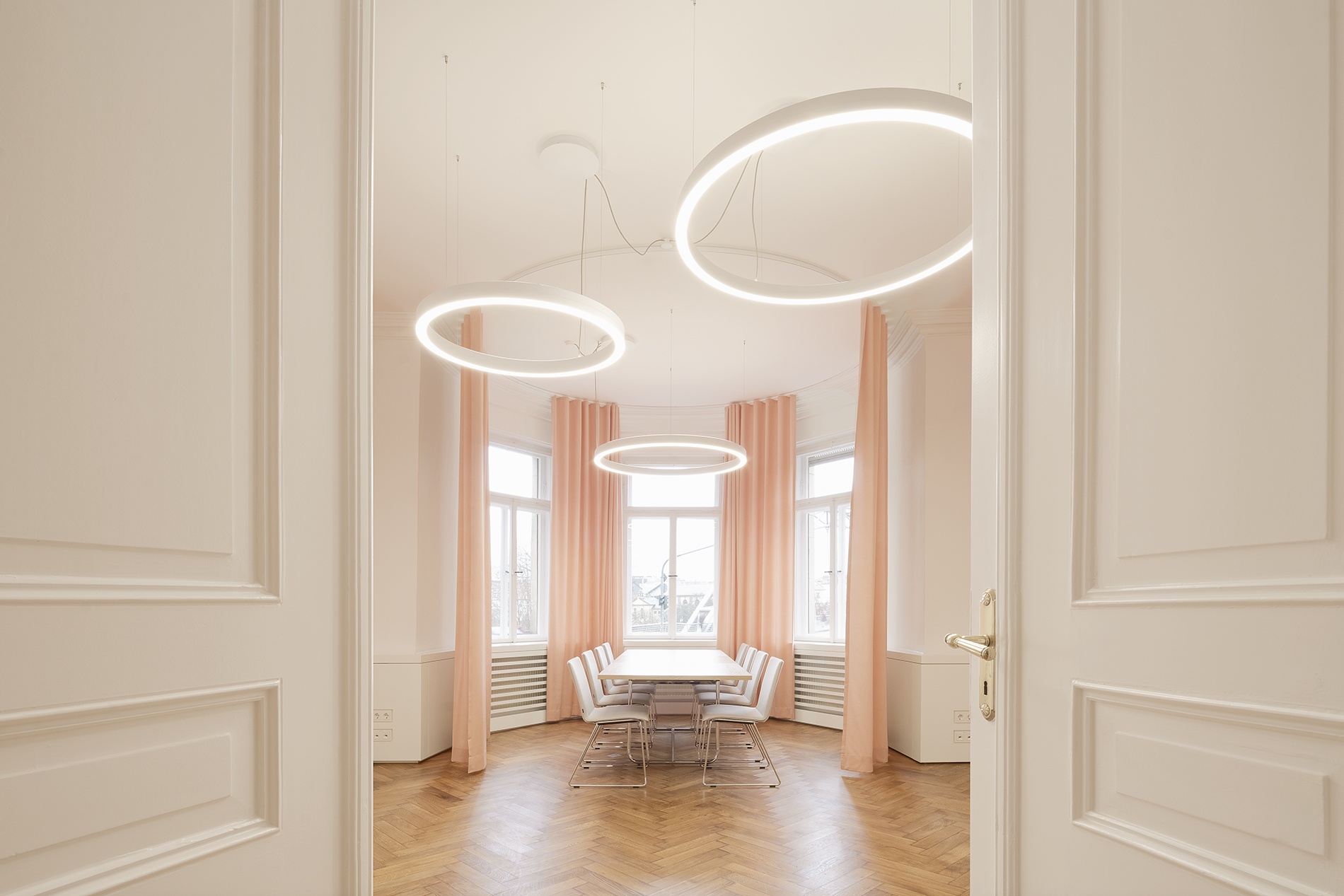 Neben den Kunden- und Büroräumen bietet ein flexibel nutzbarer Kreativ- und Sozialraum zusätzlich die Möglichkeit für Veranstaltungen, Seminare und Workshops. Ein in einem zarten Orangeton gehaltener Vorhang komplettiert die halbrunde Erkerform zum Kreis und generiert bei Bedarf einen intimen Raumbereich.