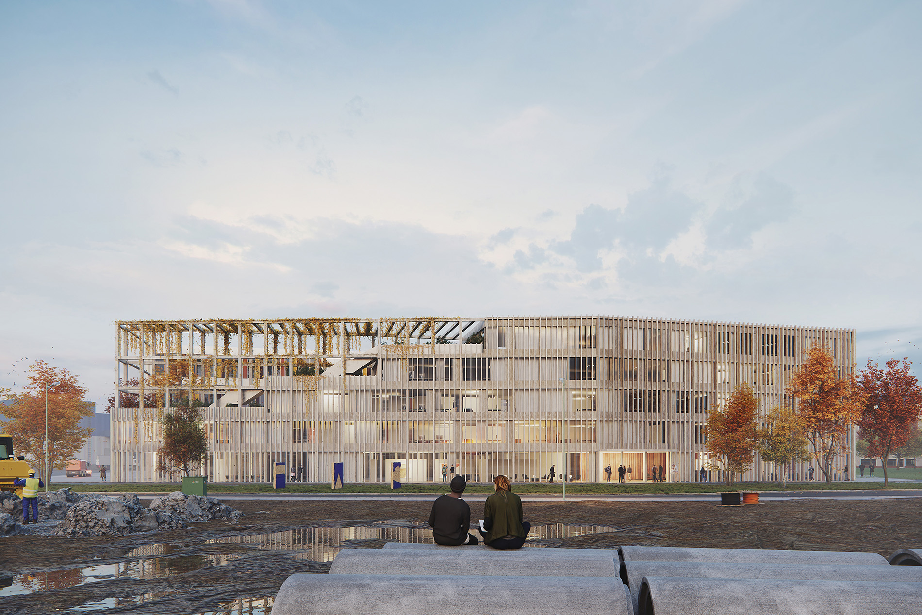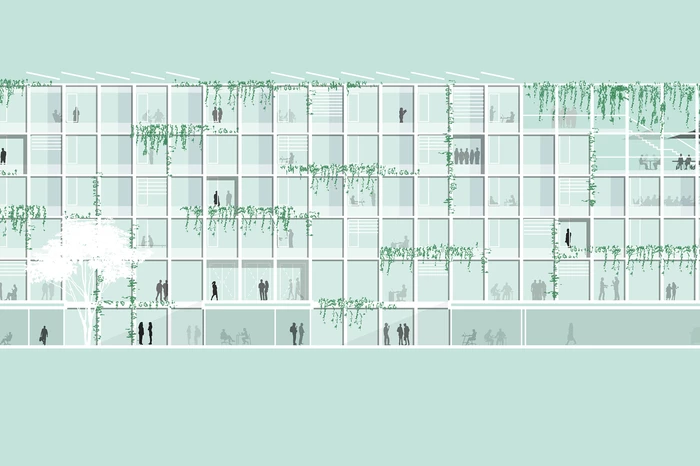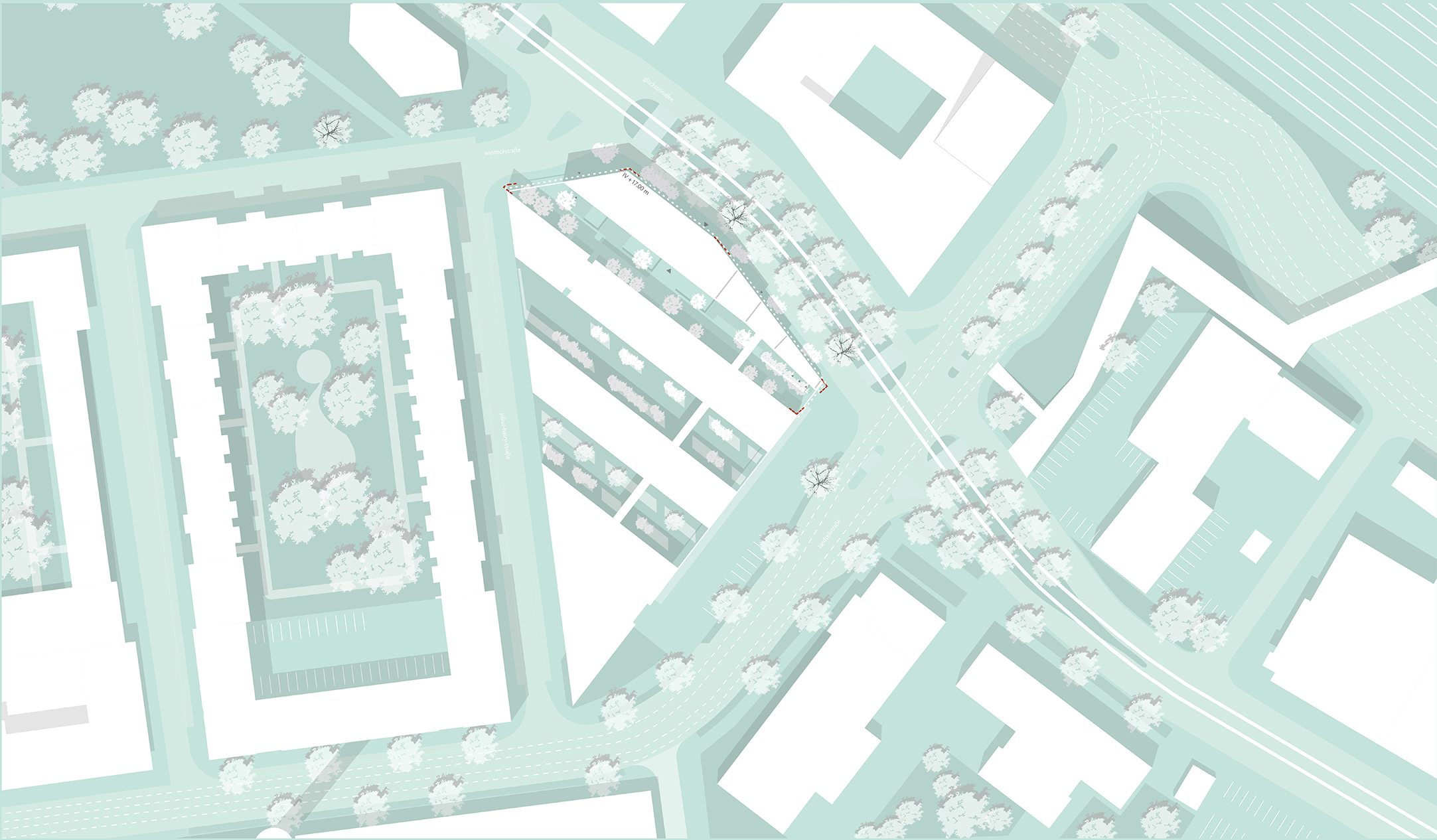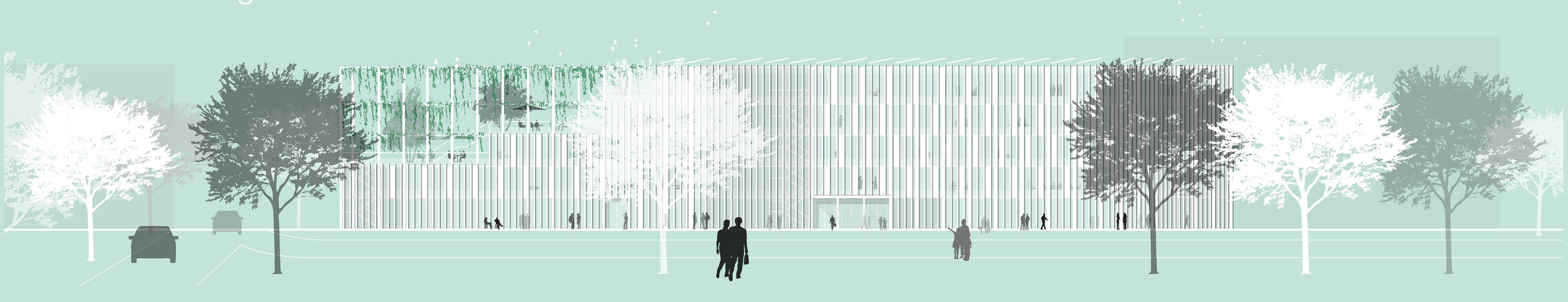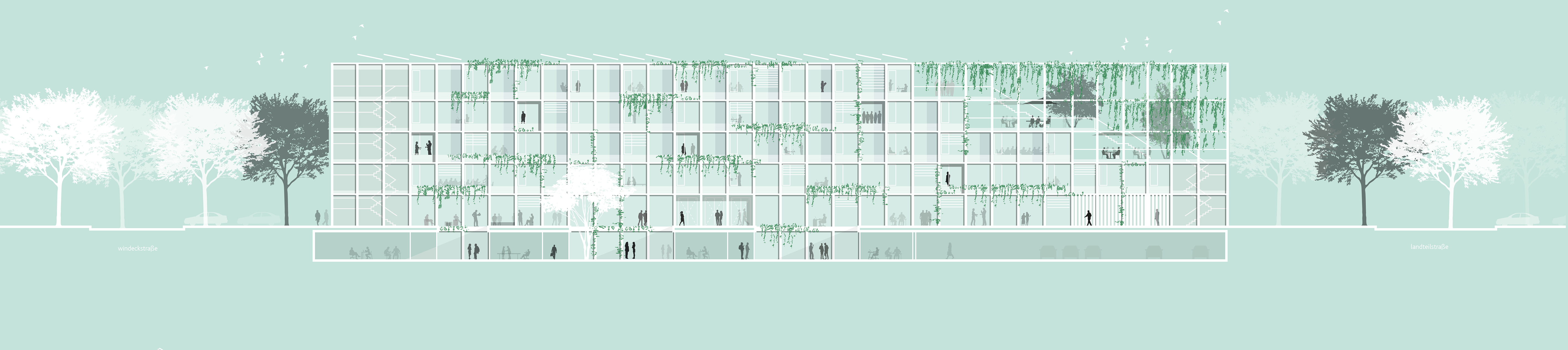 Das an der Glücksteinallee gelegene Informationszentrum Green Tech ist aufgrund seiner städtebaulichen Bezüge fest mit dem Ort verbunden und gleichzeitig ein markanter, neuer Stadtbaustein. Die dem MAFINEX zugrunde liegende Kammstruktur wird aufgenommen und der bestehende Gebäudekomplex durch den Neubau komplettiert. Die städtebauliche Struktur der Blockrandbebauung aufgreifend, schafft das neue Gebäude durch klare Raumkanten klar definierte Straßenräume und einen halböffentlichen Grünraum mit hoher Aufenthaltsqualität. Durch die städtebauliche Setzung entsteht eine konzeptionelle Verbindung zwischen MAFINEX und IZ Green Tech, die eine effektive Zusammenarbeit und den Informations- und Wissensaustausch fördert. Gleichzeitig wird die Eigenständigkeit der beiden Einrichtungen bewahrt.