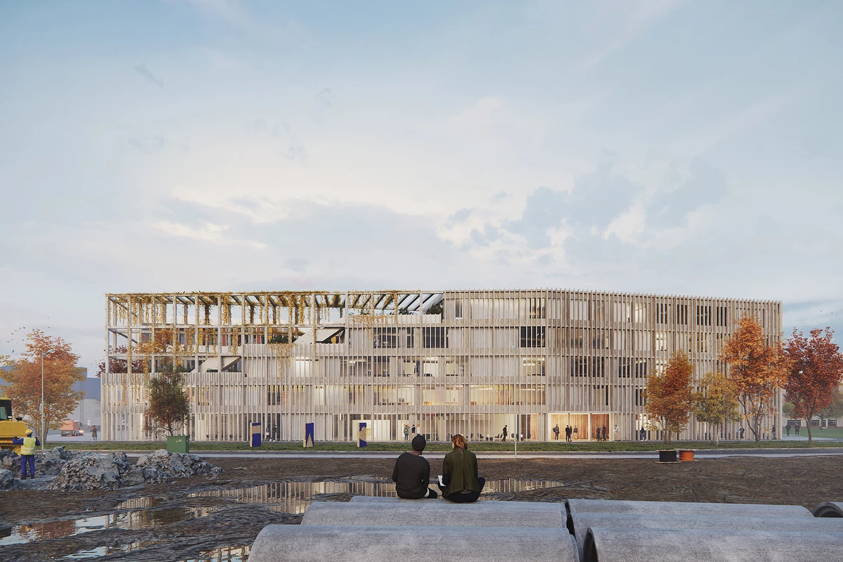 Das IZ Green Tech tritt zur Glücksteinallee mit einer vertikal strukturierten, eher geschlossen wirkenden Fassade in Erscheinung, die sich nach Süden stufenartig in eine offene, mit Pflanzen bewachsene Struktur auflöst. Es entstehen über Treppen miteinander verbundene Terrassen, die zum Aufenthalt und zur Kommunikation einladen und dem Gebäude seinen unverwechselbaren Charakter geben. Im Spannungsfeld dazu steht die nach Südwesten orientierte Fassade mit ihrer offenen Struktur, die durch farbige Photovoltaikpaneele und teilweiser Begrünung ein abwechslungsreiches und lebendiges Bild vermittelt. Die Idee des IZ Green Tech zeigt sich damit nicht nur in der Nutzungskonzeption, sondern auch im äußeren Erscheinungsbild.