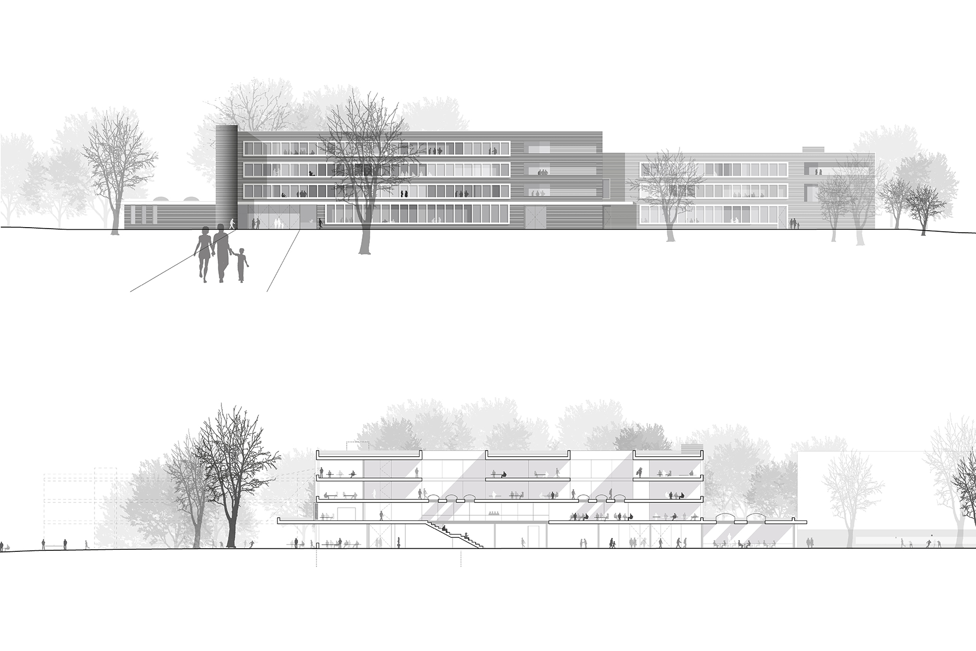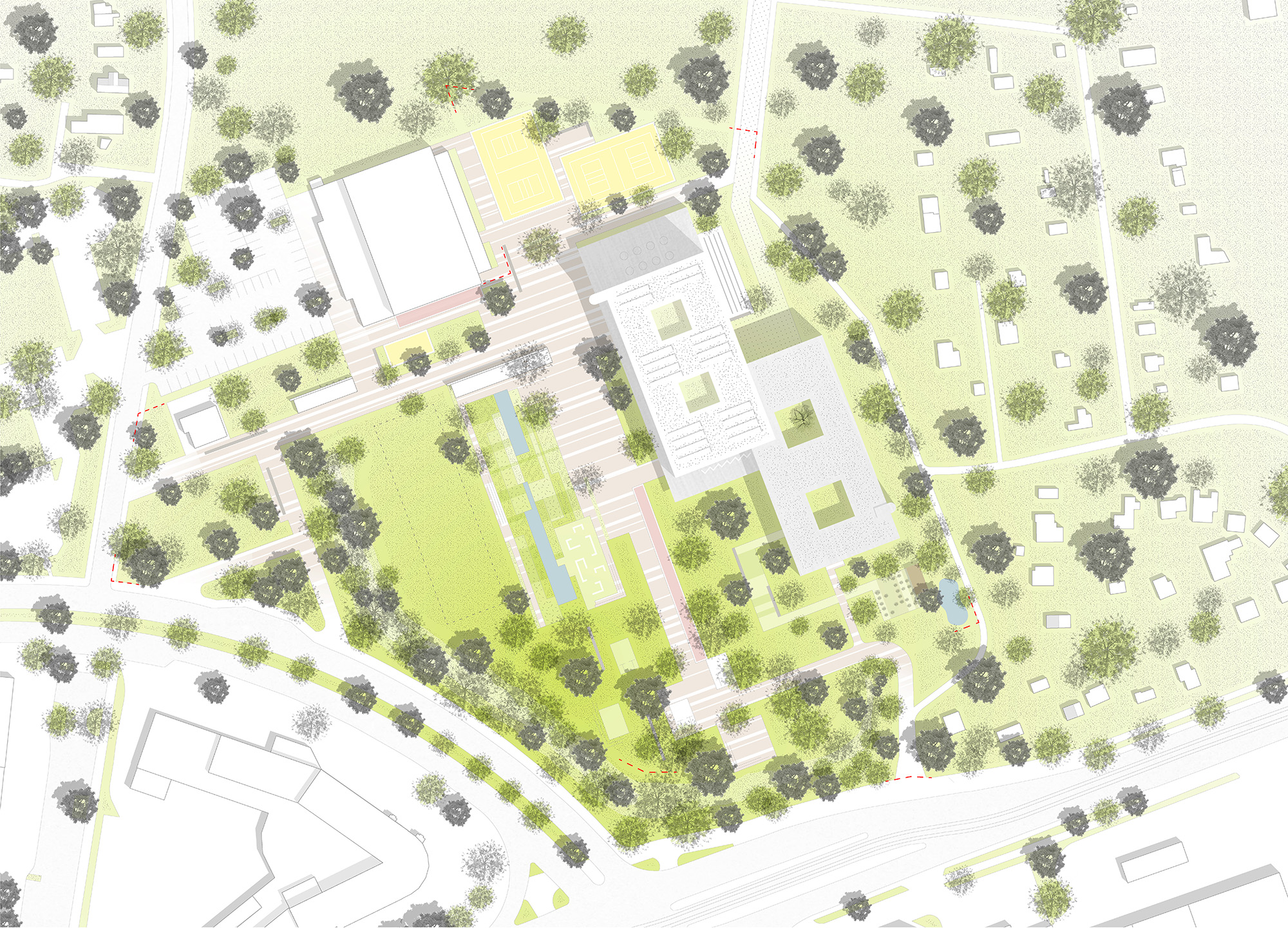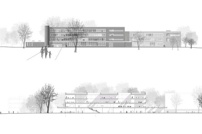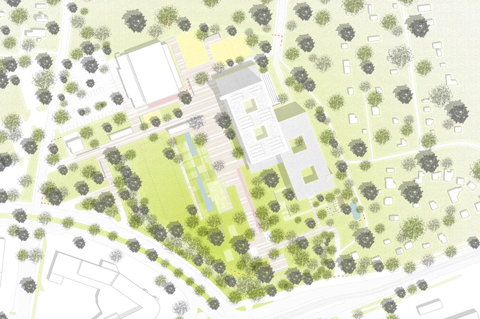 Das neue Schulgebäude, dessen Volumen durch einen Versatz in zwei Baukörper gegliedert ist, positioniert sich konsequent am östlichen Grundstücksrand und schafft im Zusammenspiel mit der bestehenden Sporthalle einen durch klare Raumkanten definierten, großzügigen Grün- und Freibereich, der sowohl für vielfältige Aktivitäten Räume schafft, als auch Spielraum für zukünftige bauliche Entwicklungen lässt.