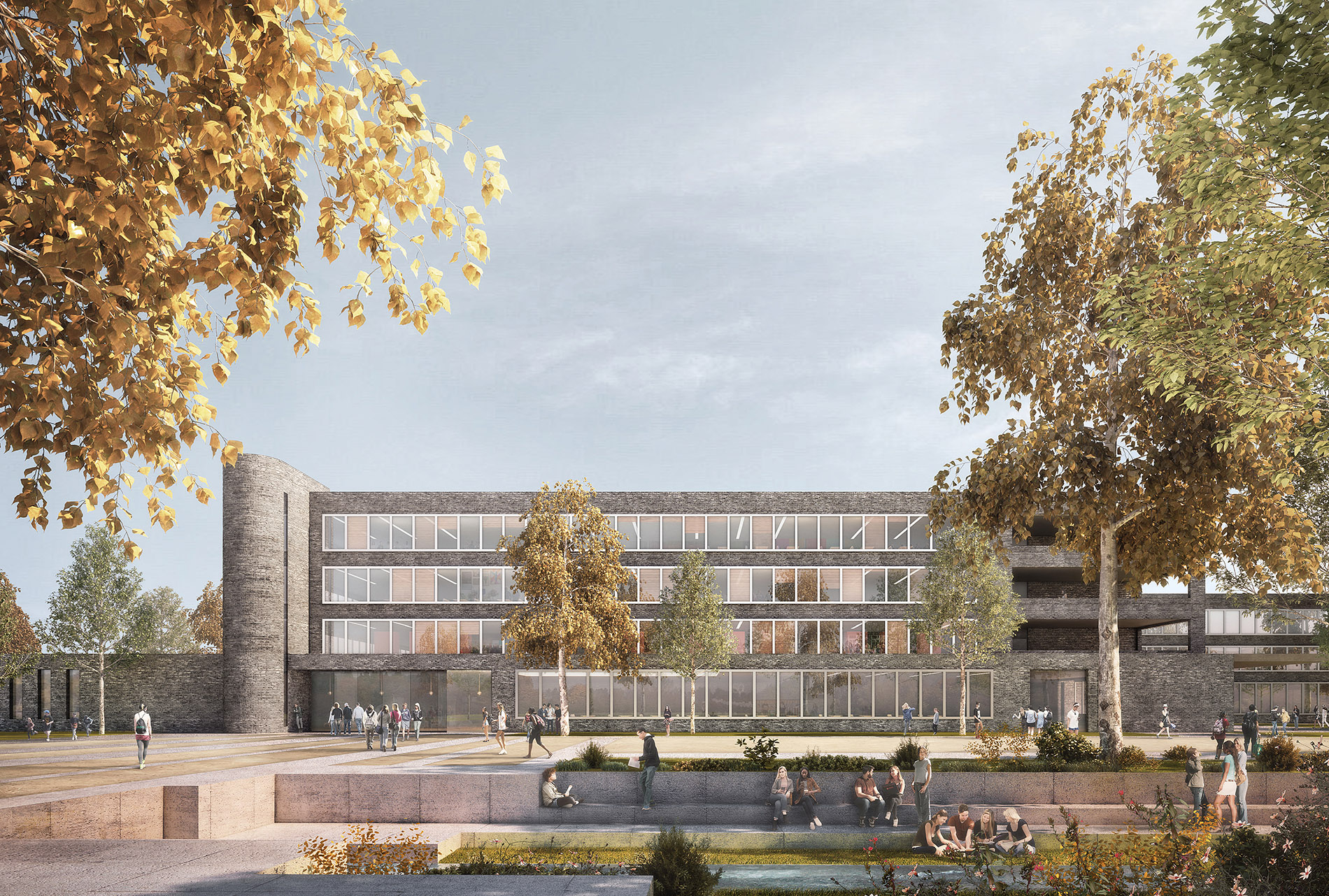 Der Neubau ist in überschaubare Funktionsbereiche gegliedert, die eine gute Orientierung gewährleisten. Mittelpunkt und repräsentatives, großzügiges Entrée ist das Forum, dessen Sitzstufen eine kontinuierliche Verbindung zu den Klassen- und Fachräumen der oberen Geschosse herstellen. Das Forum dient als zentraler Aufenthaltsbereich und kann durch das Zusammenschalten mit Aula und Mensa auch für größere oder außerschulische Veranstaltungen genutzt werden.
