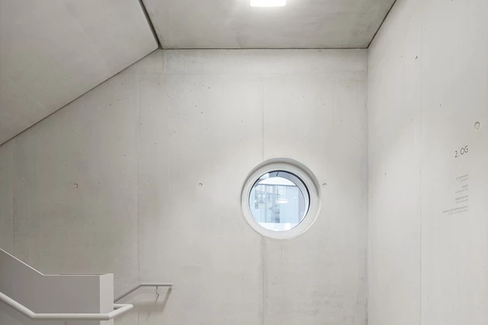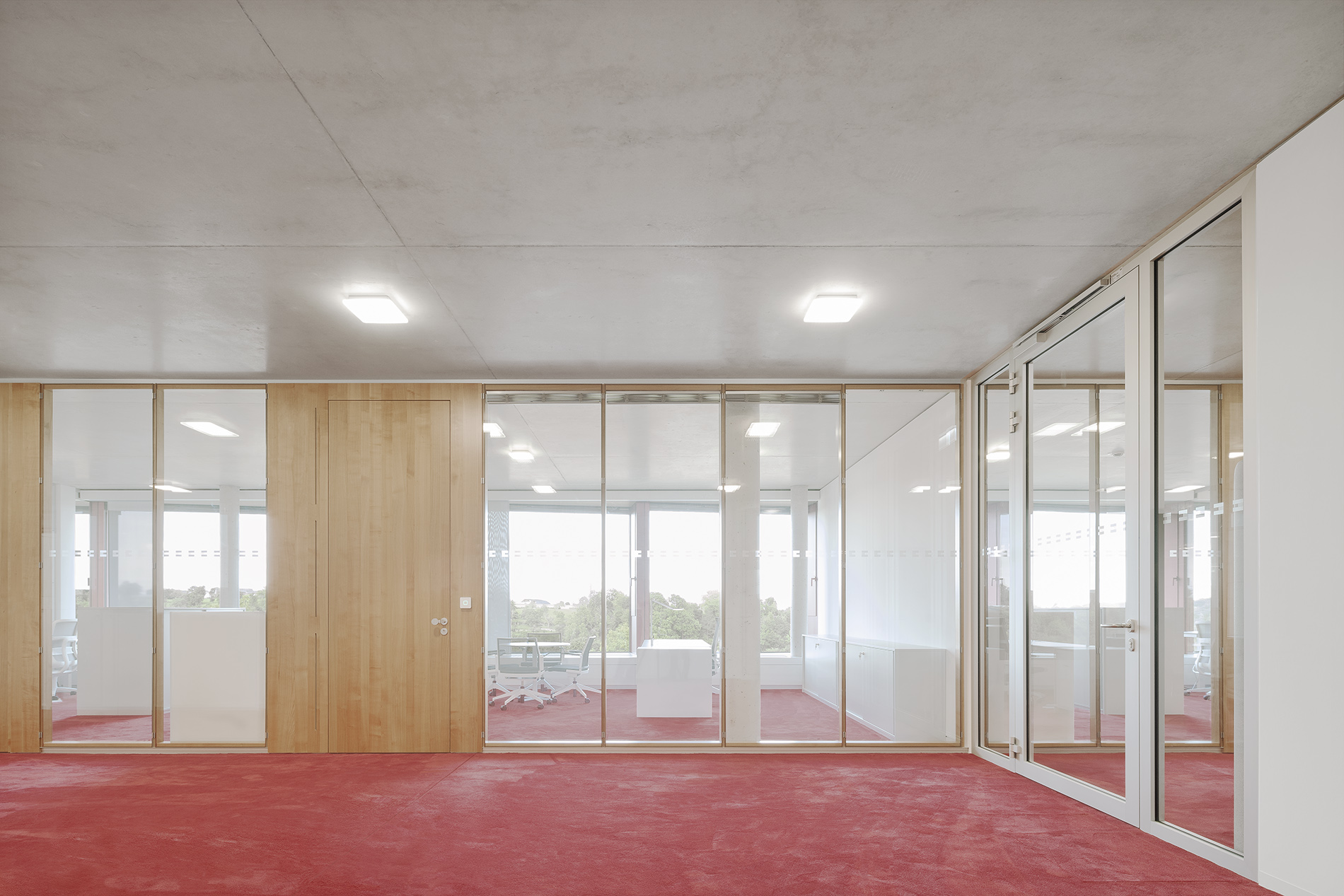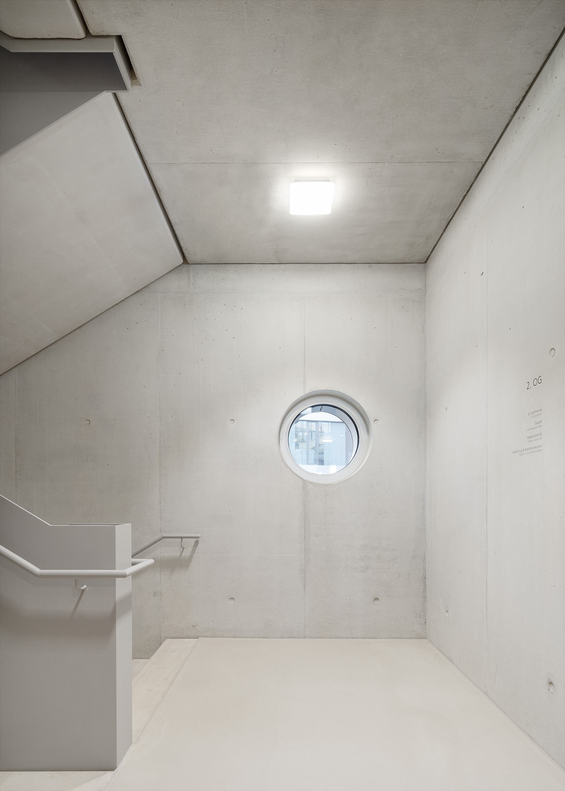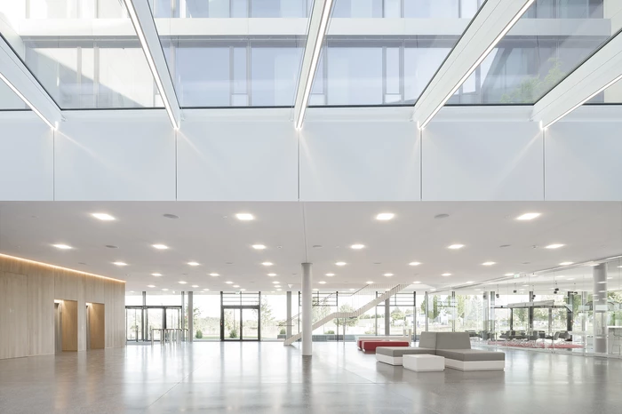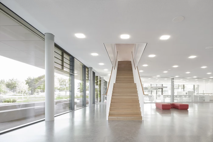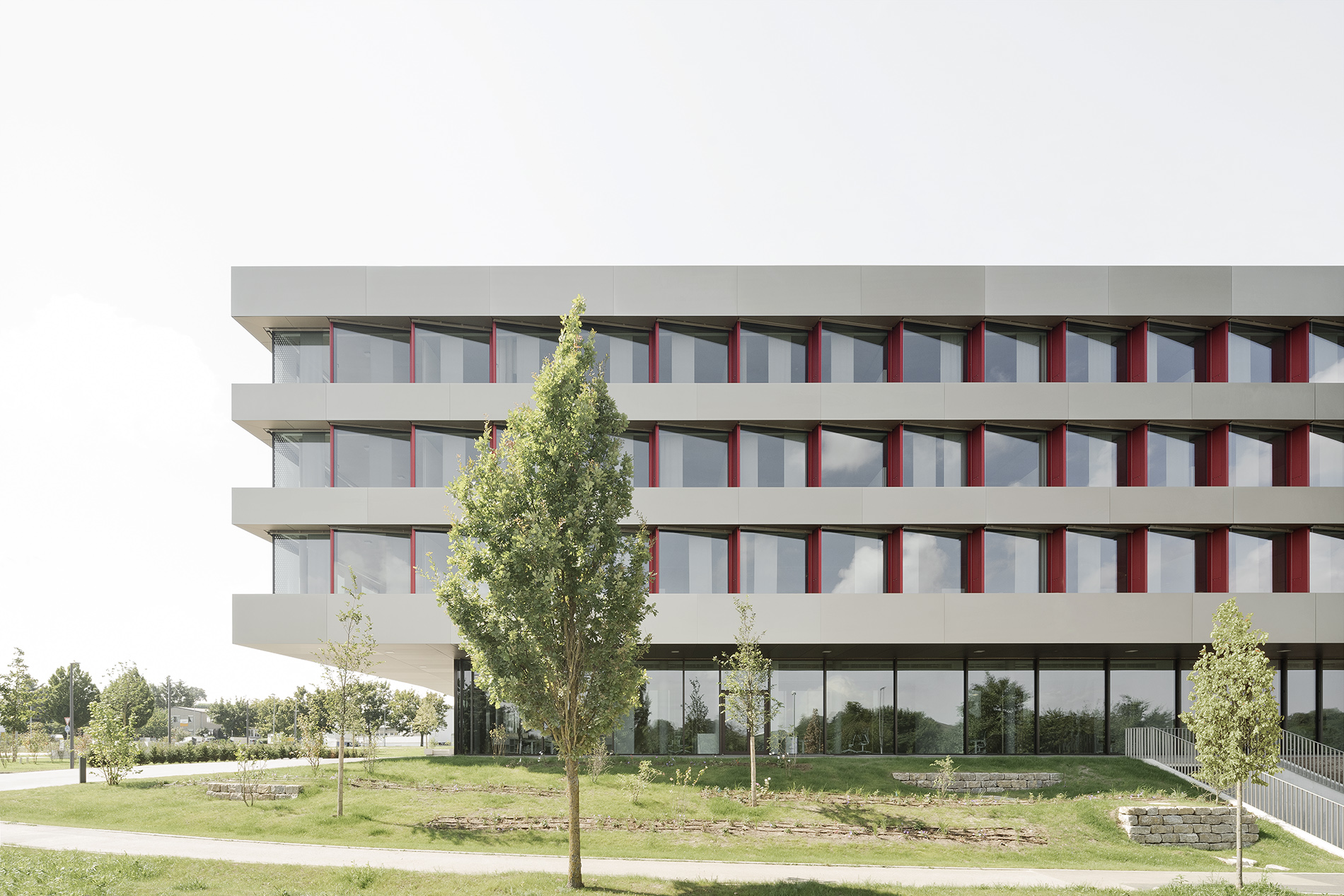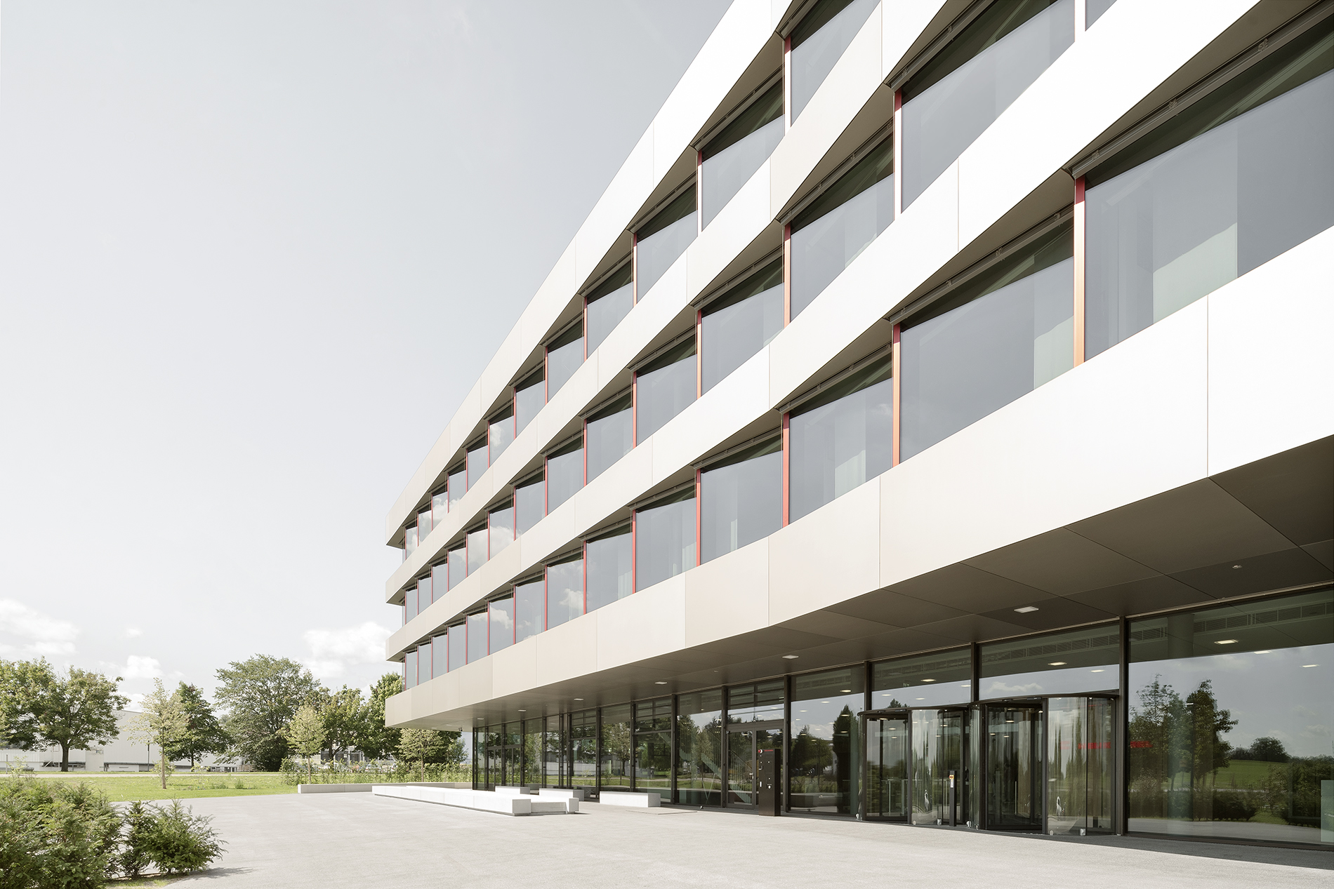 Der großzügig bemessene Vorplatz mit dem Haupteingang, den Besucherparkplätzen und Fahrradabstellplätzen liegt am südöstlichen Grundstücksrand und wird über die Schlosshaldenstraße in unmittelbarer Nähe zur vorhandenen Bushaltestelle erschlossen. Über einer vollständig verglasten Sockelzone, die alle öffentlichen Funktionen wie Foyer, Cafeteria, Ausstellungsbereich und Konferenzräume enthält, kragen drei scheinbar schwebende Bürogeschosse aus.