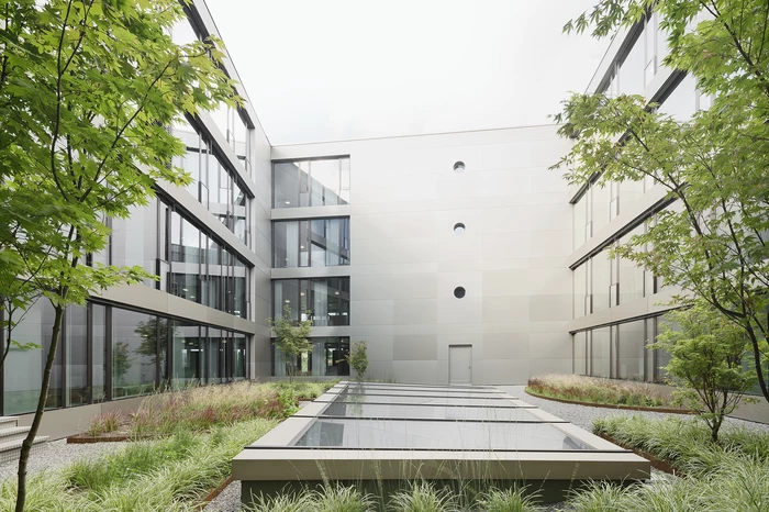 Das Flachdach wurde extensiv begrünt. Der Wechsel aus Intensivbegrünungen und extensiv begrünten Flächen im Innenhof schafft einen von hoher Gestaltqualität und zugleich hoher ökologischer Wertigkeit geprägten Ort.