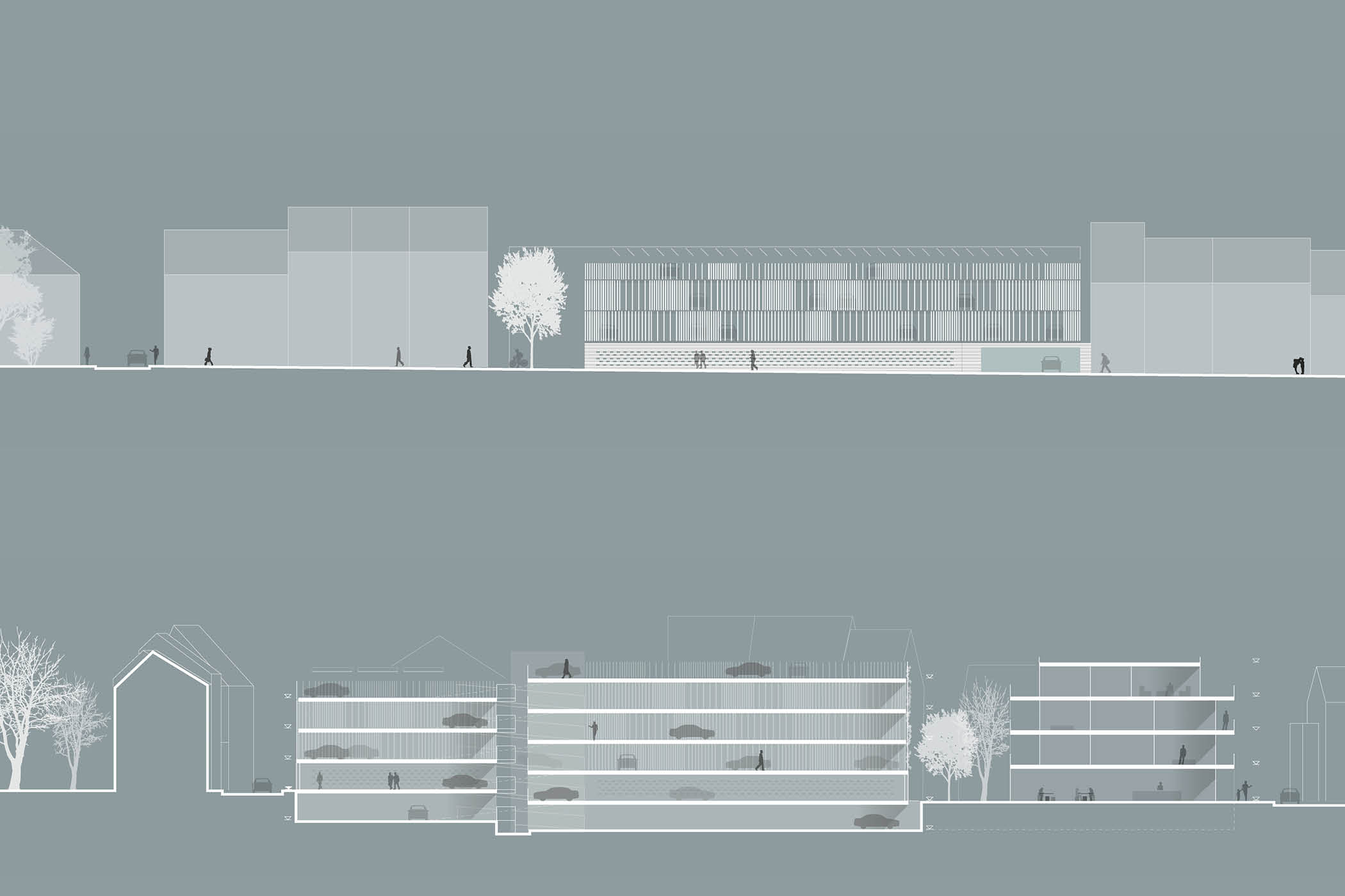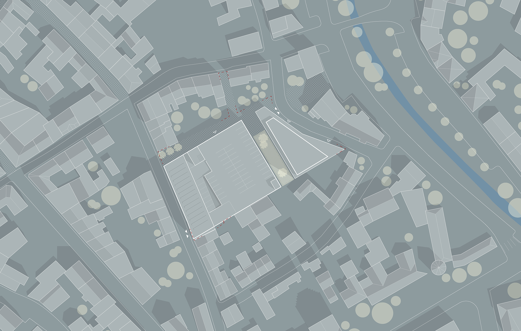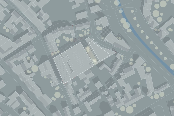 Zwischen der Hochgarage und der Straße Im Keutel entsteht eine Freifläche, die zunächst als städtische Grünfläche genutzt werden kann und zukünftig für eine eigenständige Bebauung mit Gewerbe und Wohnen zur Verfügung steht. Das Wohn- und Geschäftshaus nimmt mit seiner Kubatur auf den historischen Straßenverlauf Bezug.