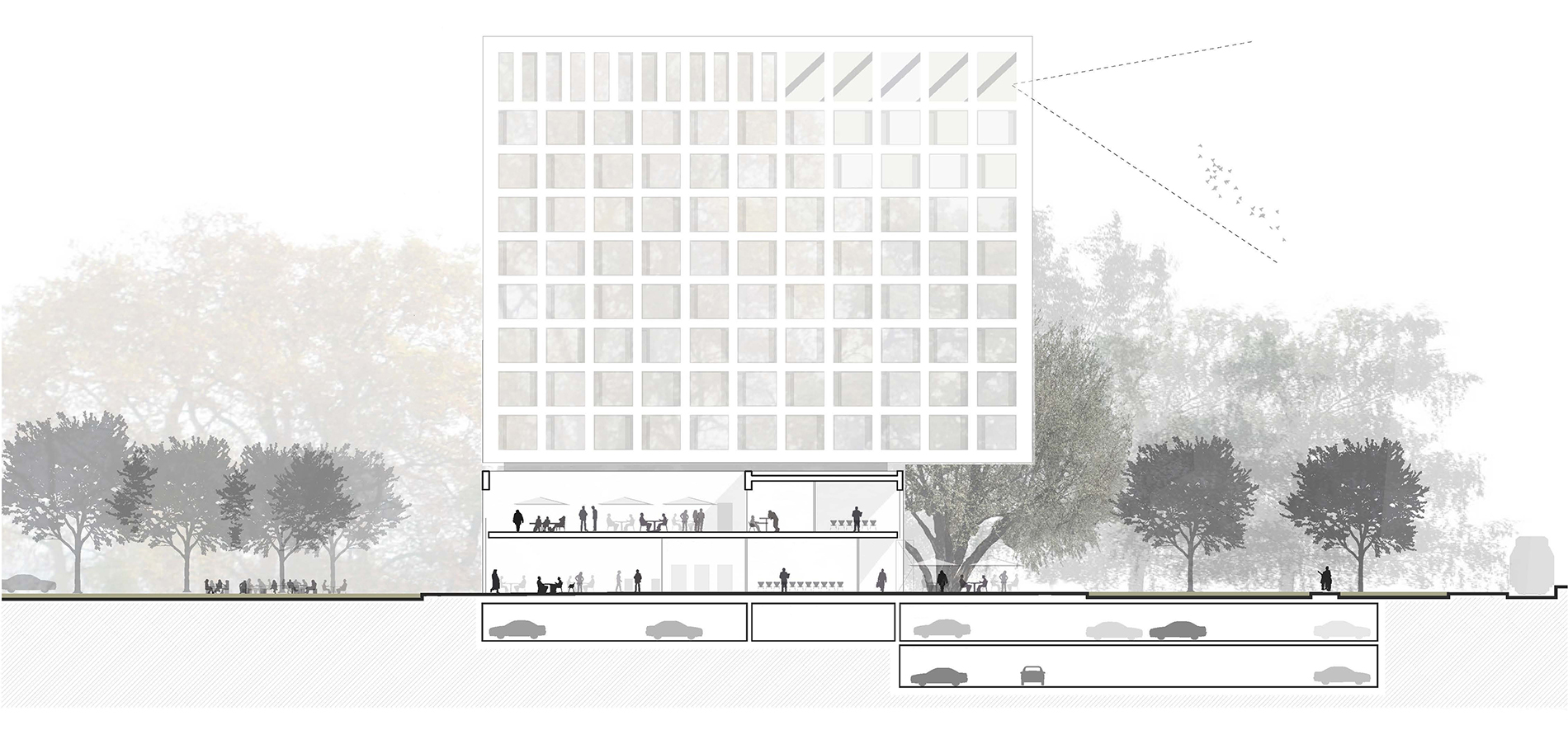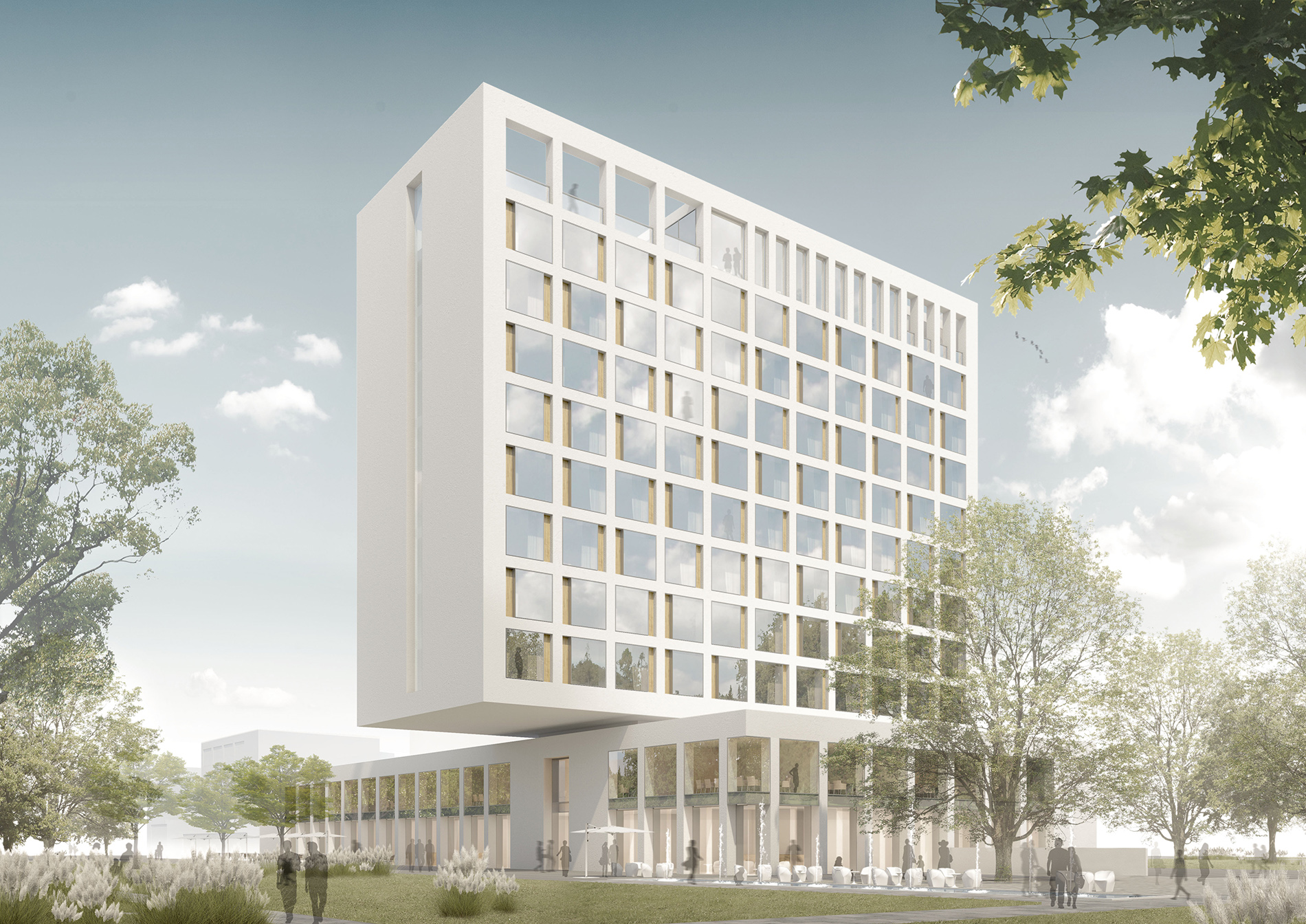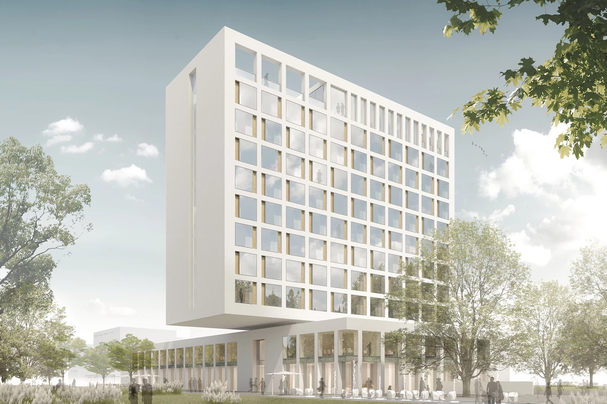 Der Hotelneubau gliedert sich im Wesentlichen in zwei Bauteile – die zweigeschossige, horizontal ausgerichtete Sockelzone und den darüber schwebenden, vertikalen Hochpunkt. Durch diese Aufteilung erscheint das eigentliche Bauvolumen geringer und fügt sich spielerisch leicht in die Parklandschaft ein.