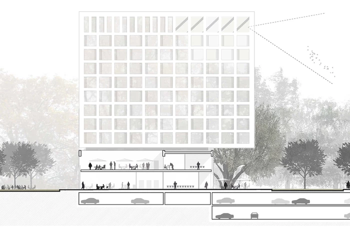 Die Sockelzone beherbergt alle gemeinschaftlichen Einrichtungen, der vertikale Baukörper die Hotelzimmer mit unterschiedlichen Typologien - von klassischen Doppelzimmern über Junior Suiten bis hin zu Boarding-Zimmern - und den Fitnessbereich mit Terrasse.