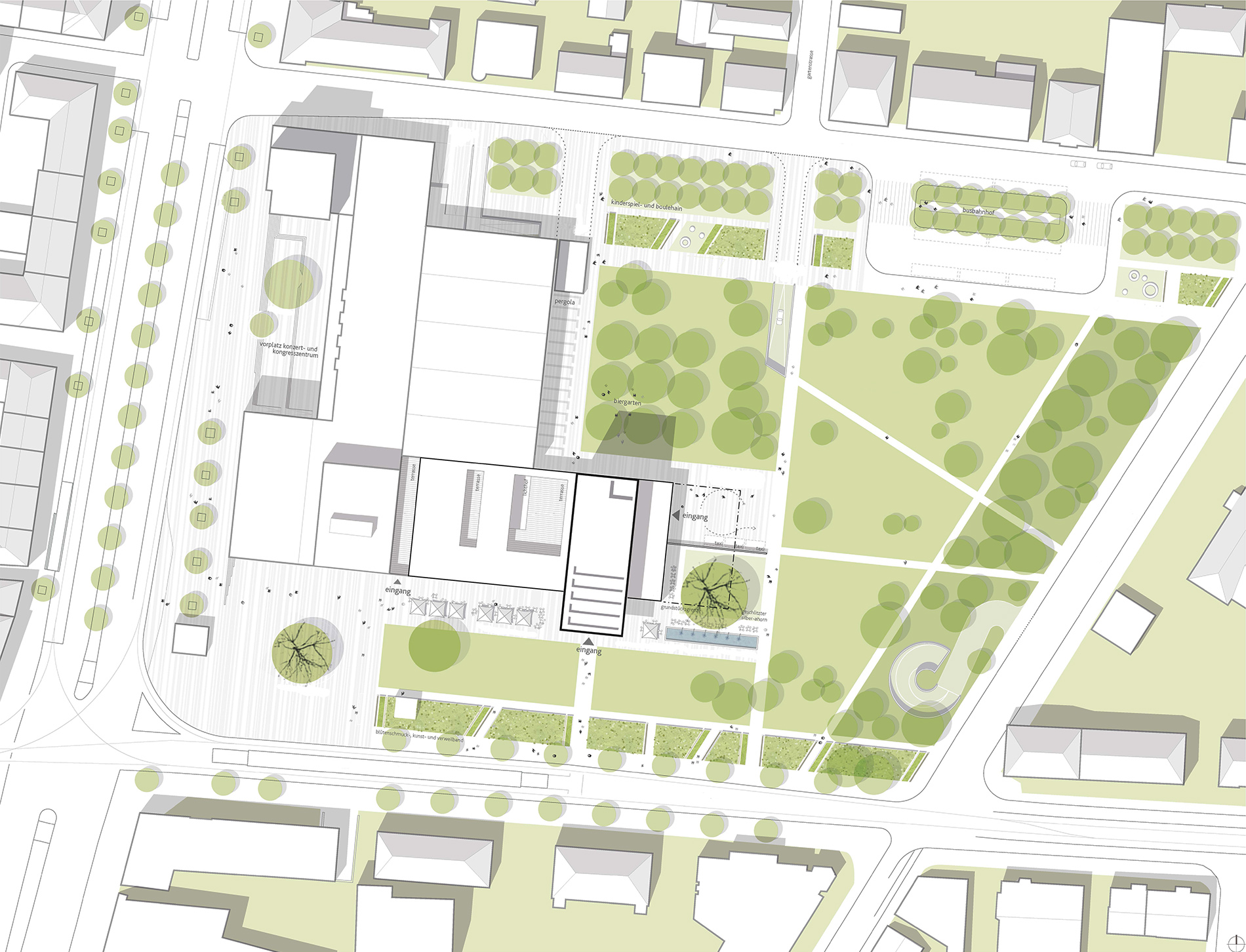 Der Stadtgarten stellt einen wichtigen zentralen Grünraum im Herzen von Heilbronn dar, der in den vergangenen Jahrzehnten durch die städtebaulichen Entwicklungen an seinen Rändern an Klarheit und Prägnanz verloren hat. Der Neubau des Hotels und der Erwerb der angrenzenden Grundstücke durch die Stadt eröffnen nun die Möglichkeit, der Gartenanlage zu neuem Glanz zu verhelfen. Das freiraumplanerische Konzept zielt darauf ab, unter Bewahrung des wertvollen Baumbestands eine räumliche und funktionale Neuordnung des Stadtgartens vorzunehmen, die Grünfläche mit der Umgebung zu vernetzen und damit als wichtigen Stadtbaustein zu stärken.