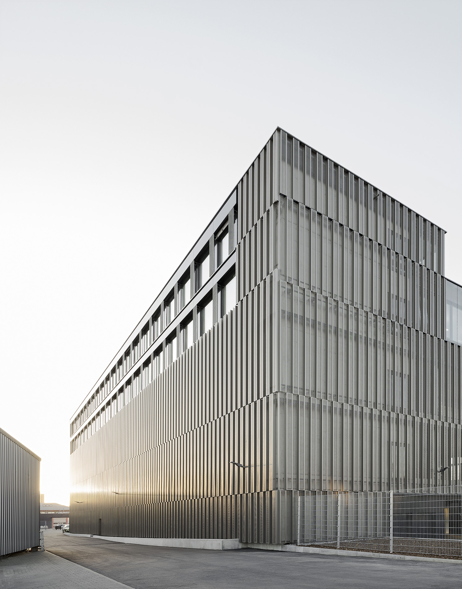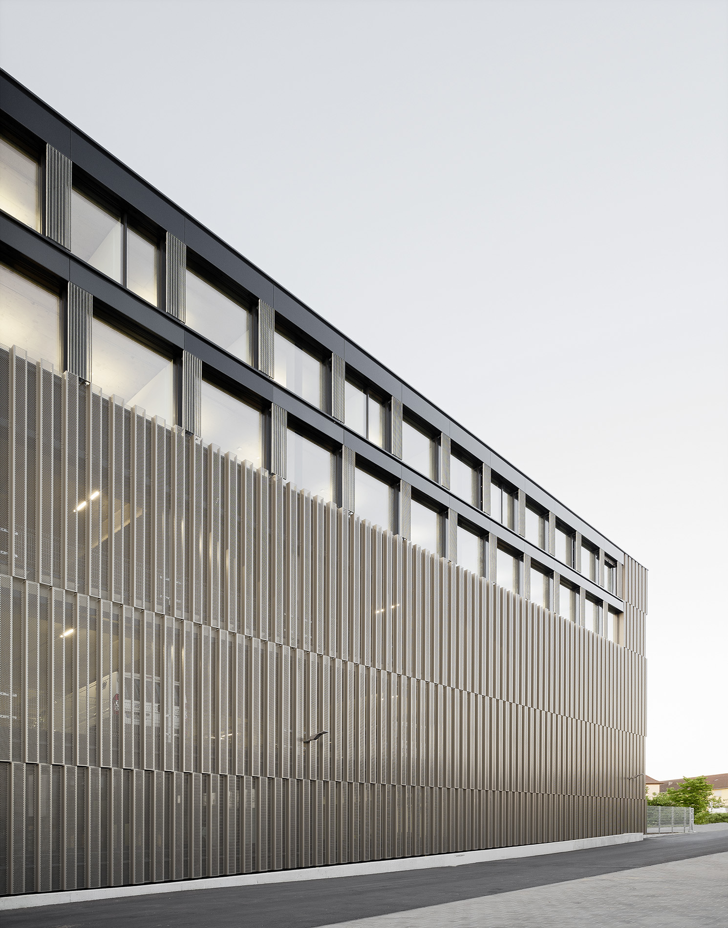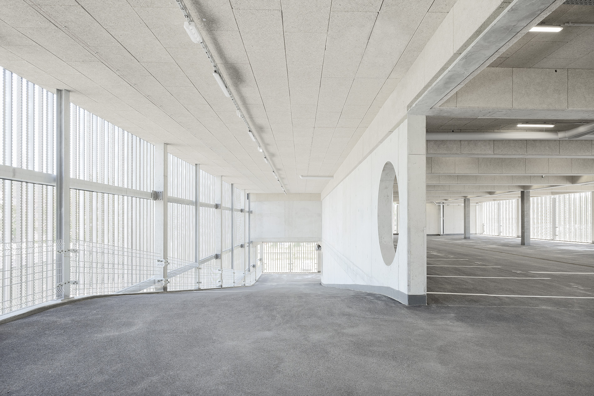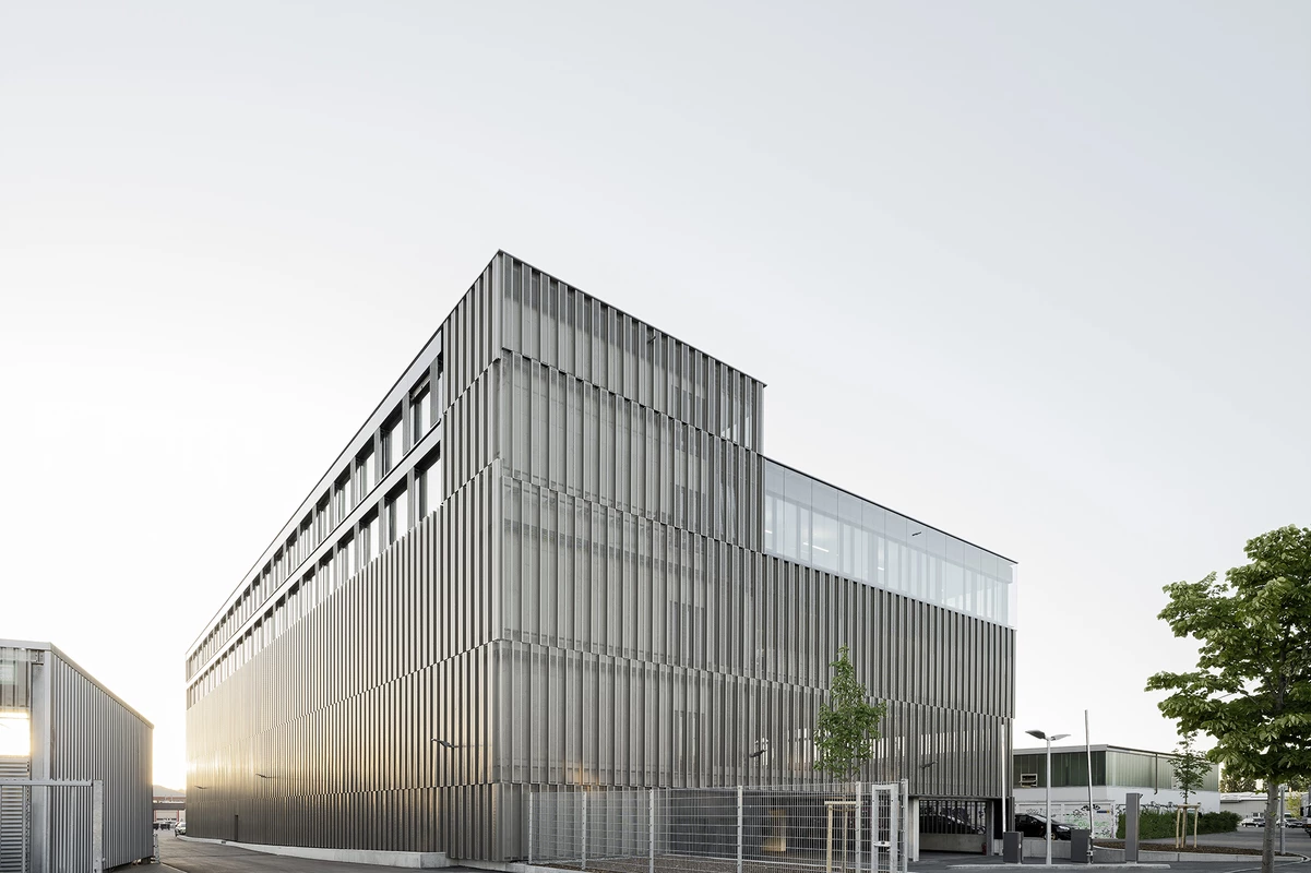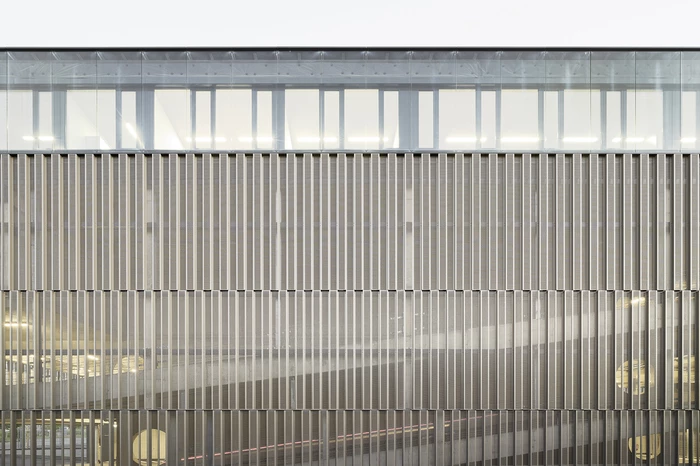 Die Tragstruktur besteht aus einer feuerbeständigen Betonrahmen-Konstruktion. Eine perforierte Fassadenhülle legt sich gleich einer Karosserie um den Baukörper. Der hohe Lochanteil in den Blechen sichert ein hohes Maß an Transparenz und Durchlässigkeit. Durch die offene, geometrische Struktur entstehen Schichtungen sowohl in der Höhe als auch in der Tiefe. Wechselnde Lichtverhältnisse lassen immer wieder neue Eindrücke und Bilder entstehen. Bei Nacht gleicht das beleuchtete Gebäude einem illuminierten Stadtbaustein.