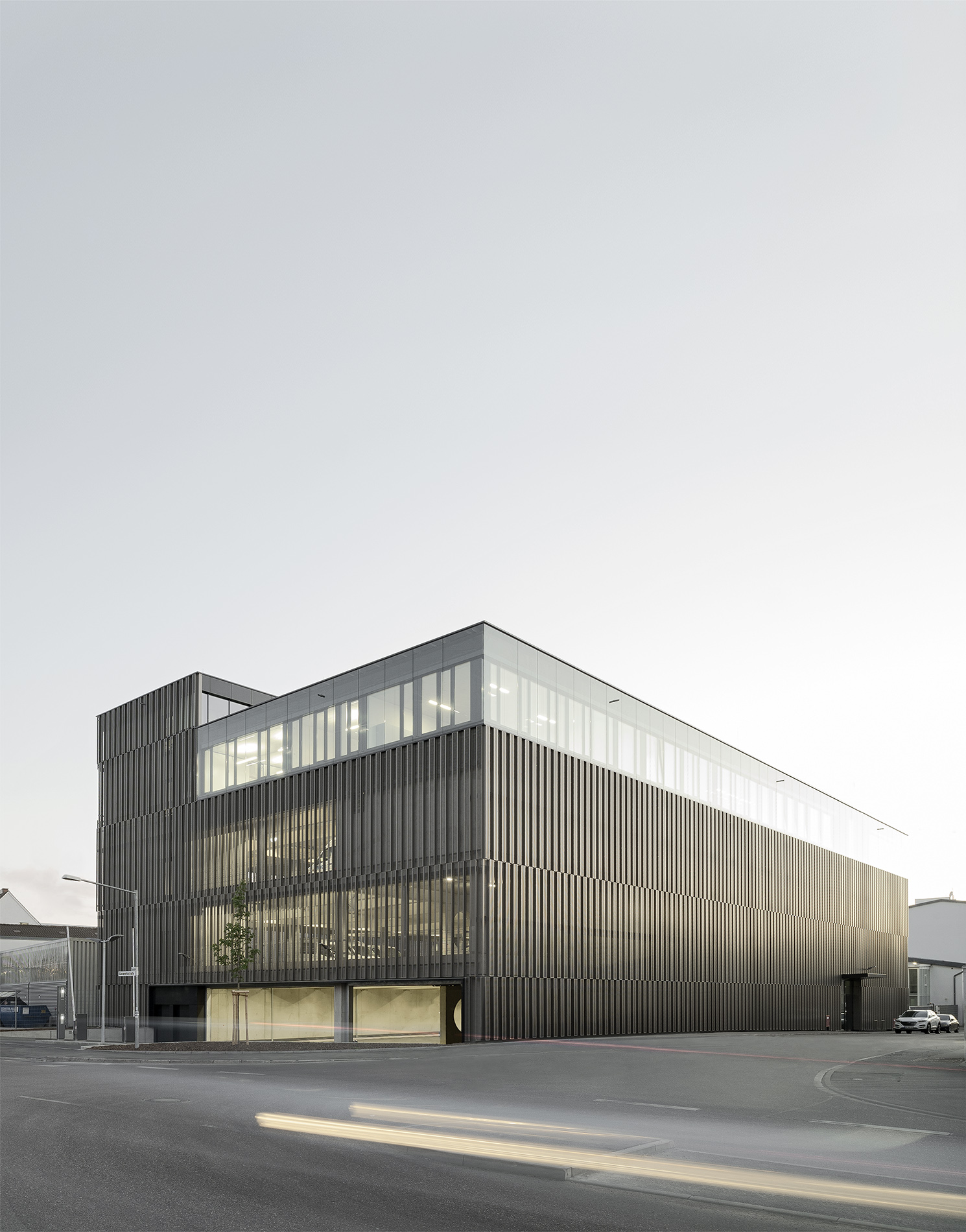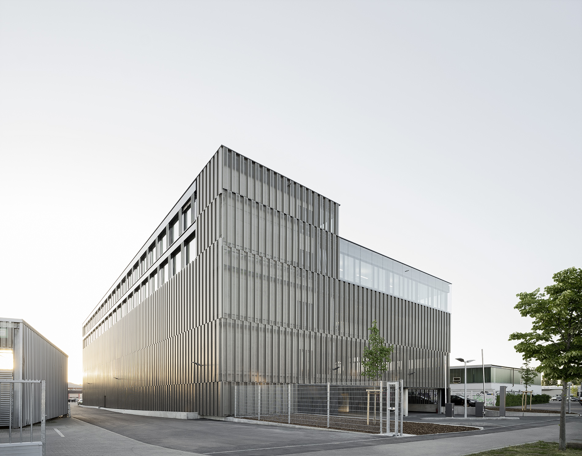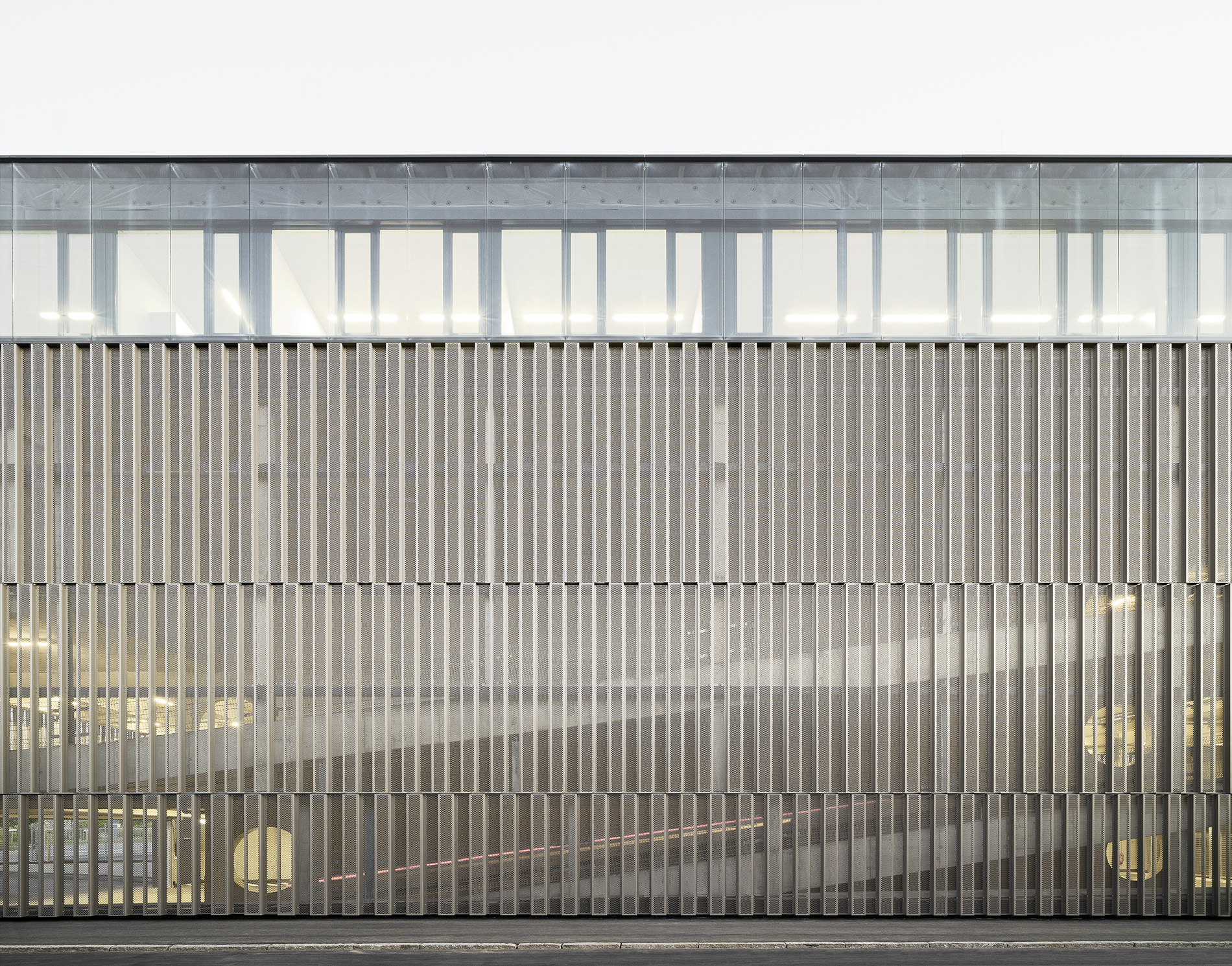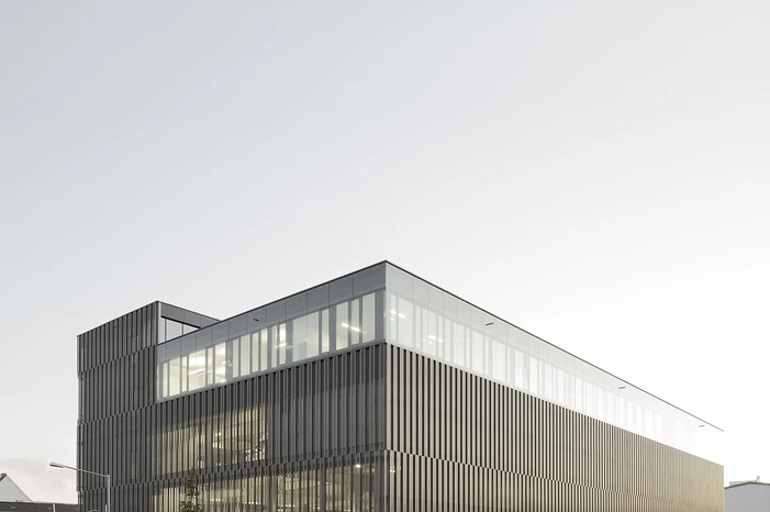 Die Tragstruktur besteht aus einer feuerbeständigen Betonrahmen-Konstruktion. Eine perforierte Fassadenhülle legt sich gleich einer Karosserie um den Baukörper. Der hohe Lochanteil in den Blechen sichert ein hohes Maß an Transparenz und Durchlässigkeit. Durch die offene, geometrische Struktur entstehen Schichtungen sowohl in der Höhe als auch in der Tiefe. Wechselnde Lichtverhältnisse lassen immer wieder neue Eindrücke und Bilder entstehen. Bei Nacht gleicht das beleuchtete Gebäude einem illuminierten Stadtbaustein.