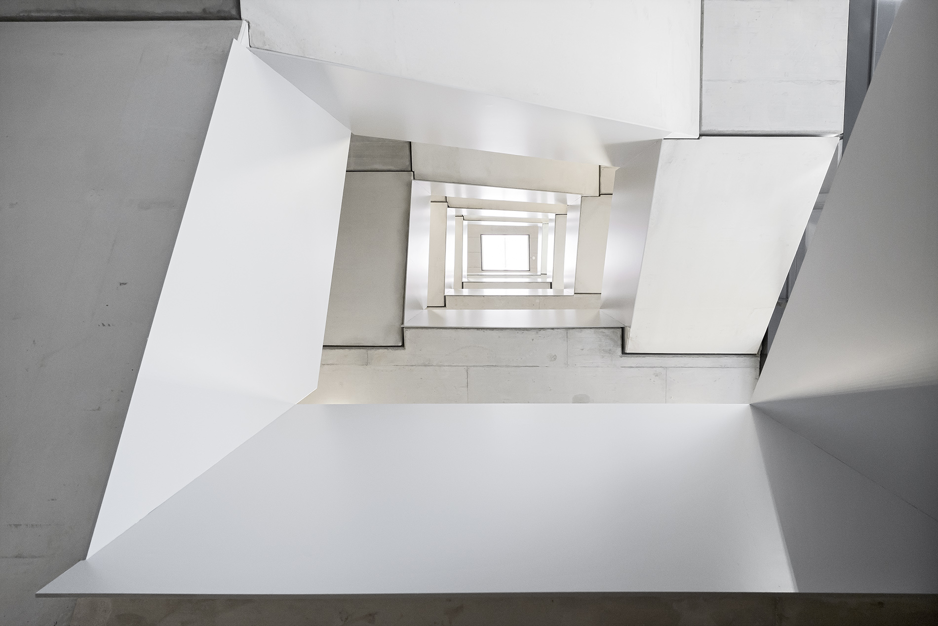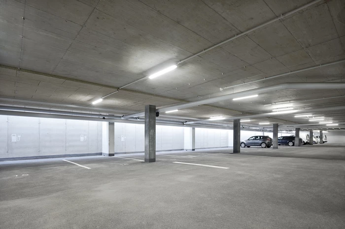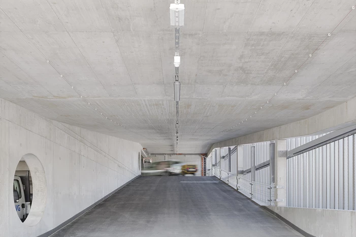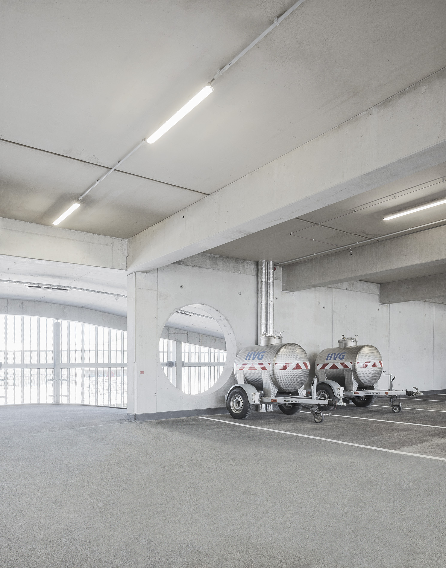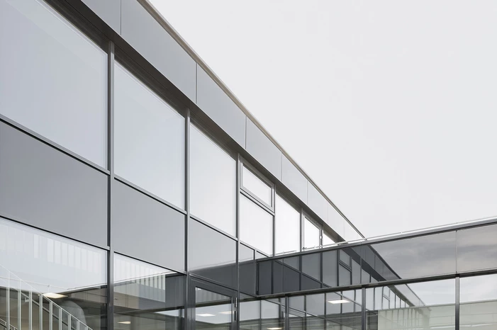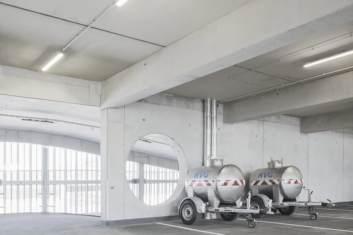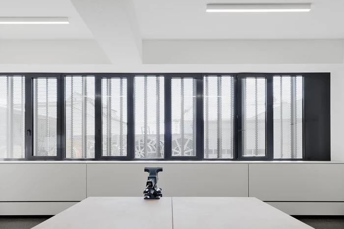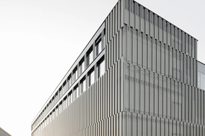 Die Tragstruktur besteht aus einer feuerbeständigen Betonrahmen-Konstruktion. Eine perforierte Fassadenhülle legt sich gleich einer Karosserie um den Baukörper. Der hohe Lochanteil in den Blechen sichert ein hohes Maß an Transparenz und Durchlässigkeit. Durch die offene, geometrische Struktur entstehen Schichtungen sowohl in der Höhe als auch in der Tiefe. Wechselnde Lichtverhältnisse lassen immer wieder neue Eindrücke und Bilder entstehen. Bei Nacht gleicht das beleuchtete Gebäude einem illuminierten Stadtbaustein.