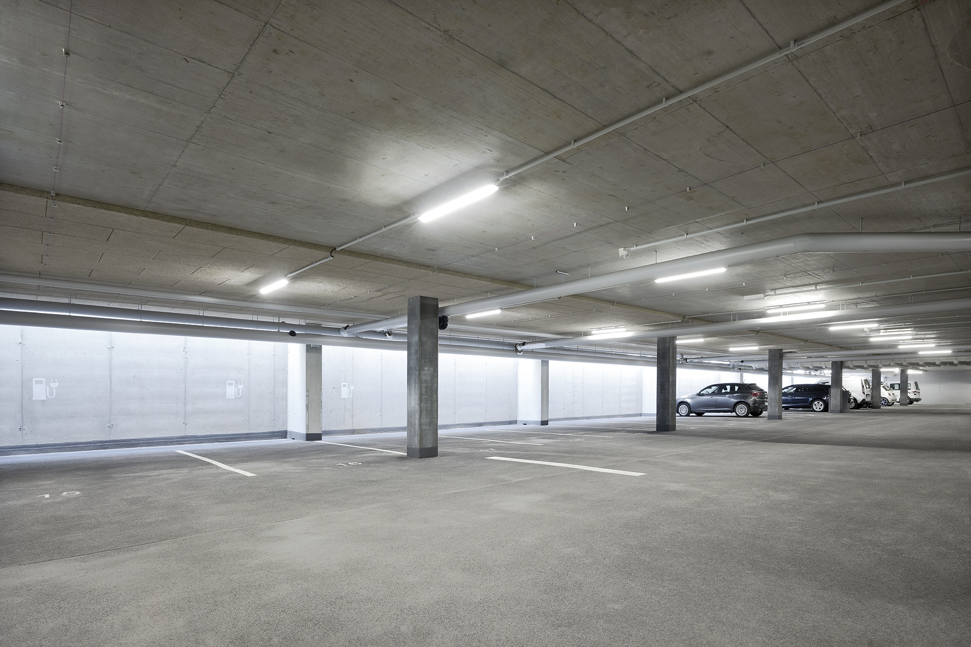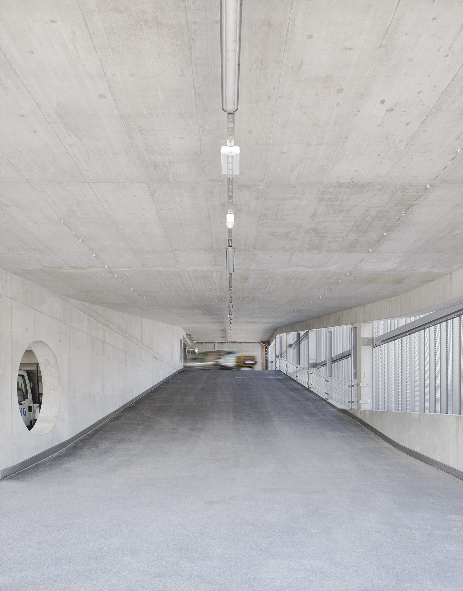 Das Volumen des Werkstattgebäudes wird selbstbewusst und in sich ruhend an der Etzelstraße, Ecke Gaswerkstraße platziert und setzt somit einen deutlichen städtebaulichen Akzent. Die Parkierungsebenen mit den geforderten Stellplätzen werden übereinandergestapelt. Alle weiteren Funktionen wie Büro- und Aufenthaltsräume und ein Großteil der Werkstätten befinden sich in den beiden darüber liegenden Geschossen. Dadurch ergeben sich nicht nur kurze Wege, sondern auch eine optimale energetisch/konstruktive Ausbildung des Baukörpers. Die Klarheit und Übersichtlichkeit der Wegeführungen, die Offenheit des Baukörpers, die Farbgebung und die Lichtführung in den Ebenen schaffen eine positive, räumliche Gesamtatmosphäre.