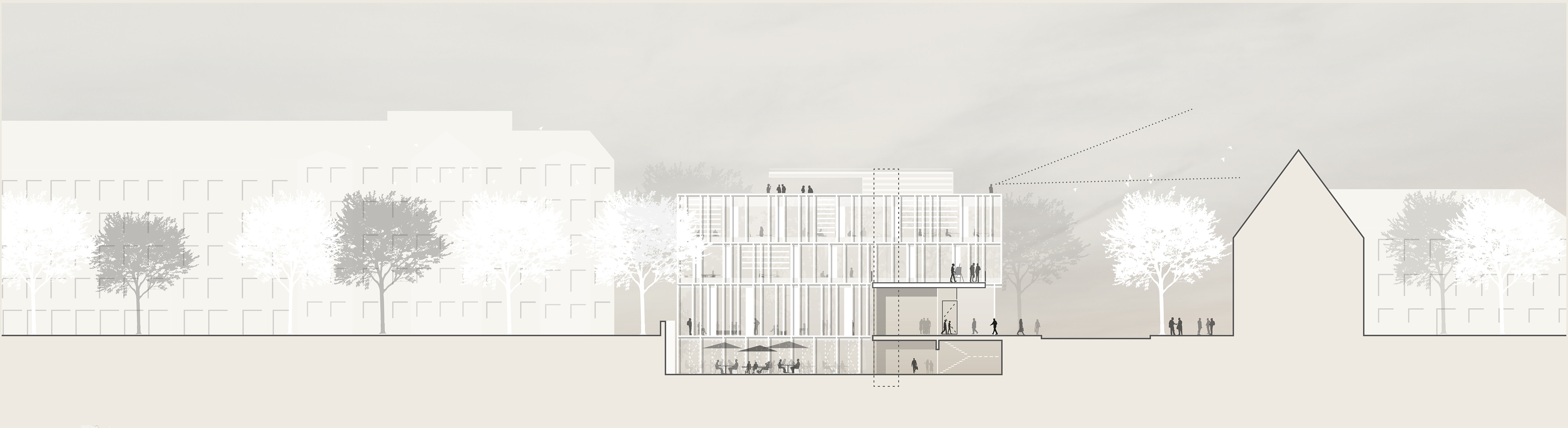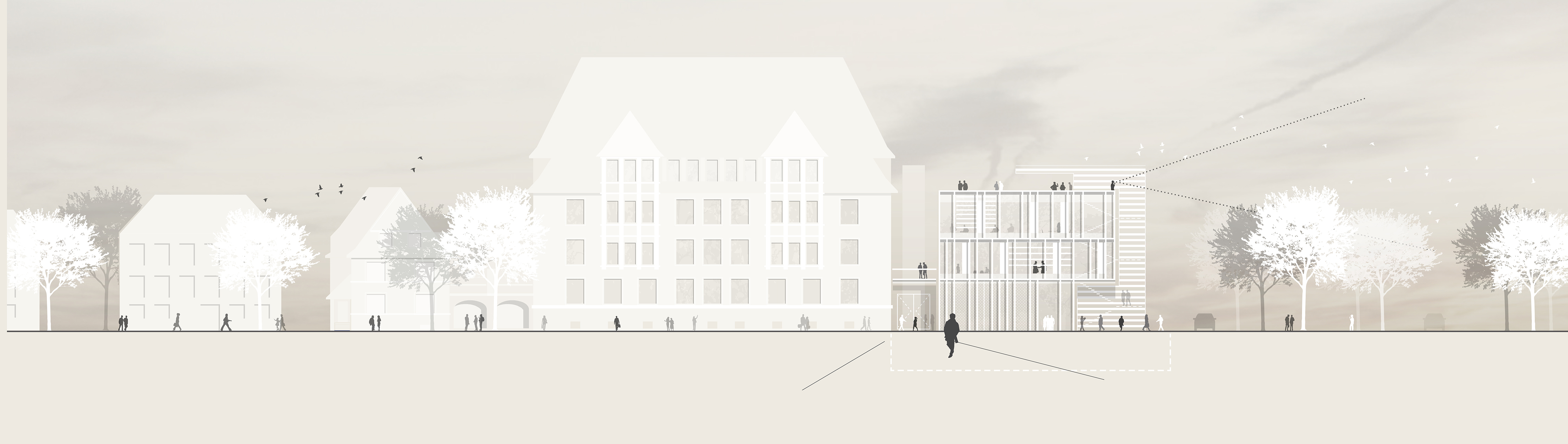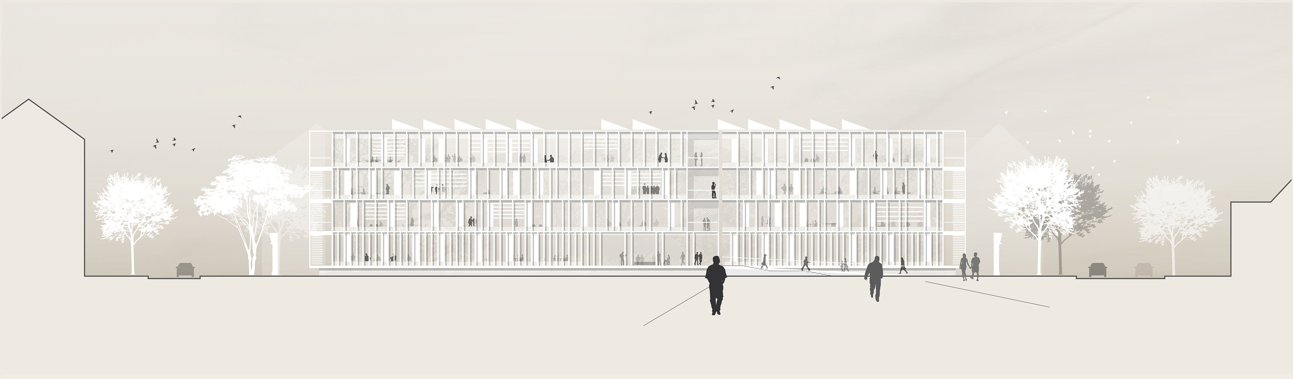 Sowohl das „Lernhaus“ als auch das an die denkmalgeschützte Holbeinschule anschließende „Stadtteilhaus“ mit seiner kompakten Volumetrie werden aufgrund ihres Erscheinungsbildes als zusammengehörig gelesen. In ihrem Zusammenspiel unterstützen Neu- und Bestandsgebäude die Idee eines erlebbaren, Identität stiftenden Schul-Campus. Es entsteht ein moderner Schulbaukomplex, der sich mit einem Beratungs- und Förderzentrum und einem „offenen Treff“ räumlich zum Stadtteil öffnet und eine klare Adressbildung schafft.
