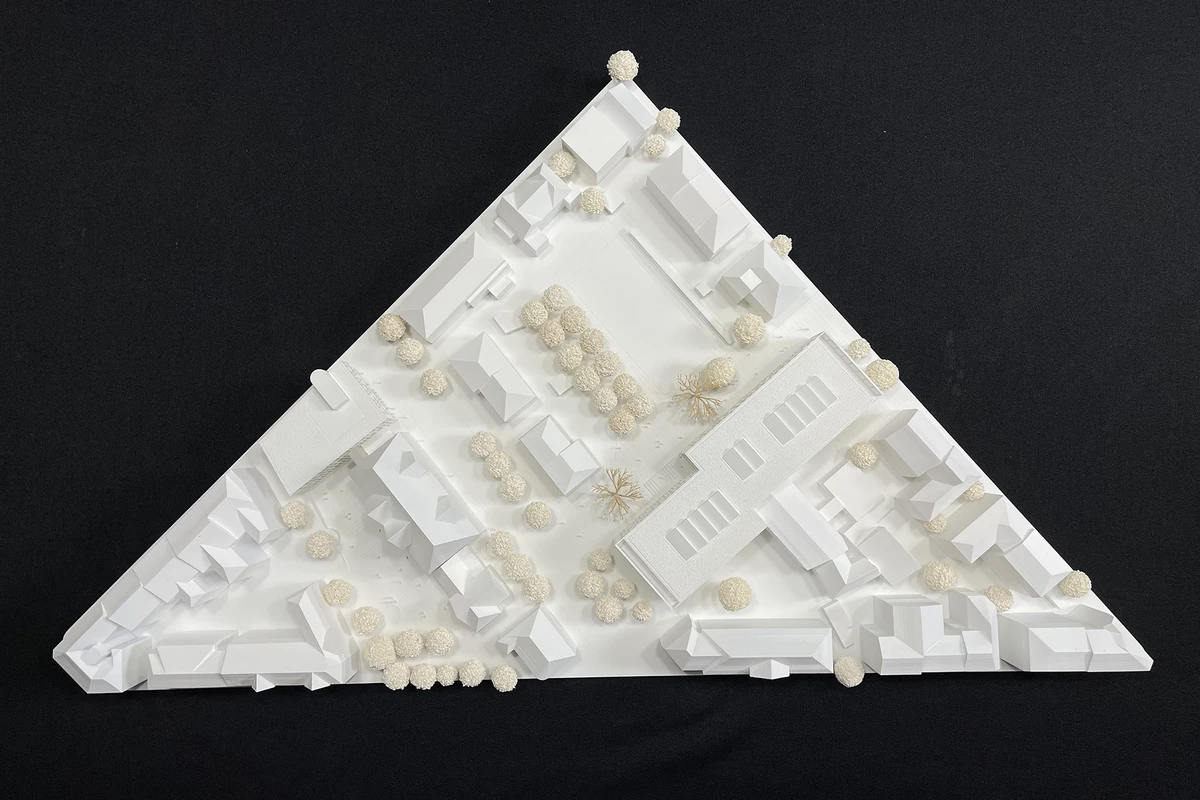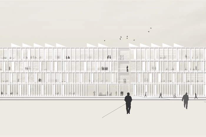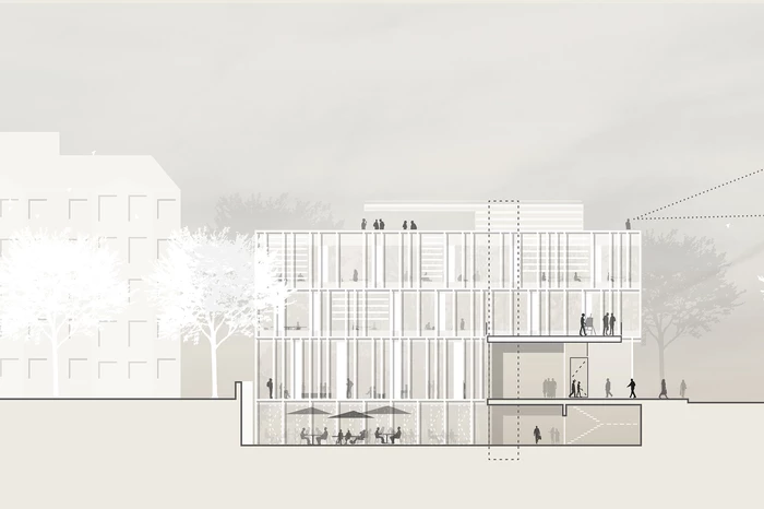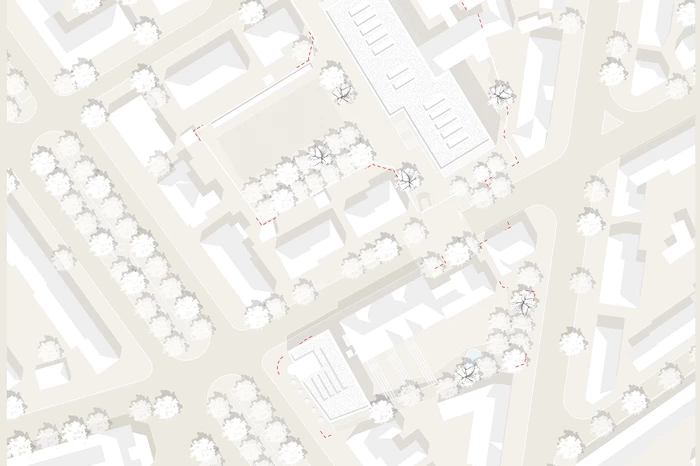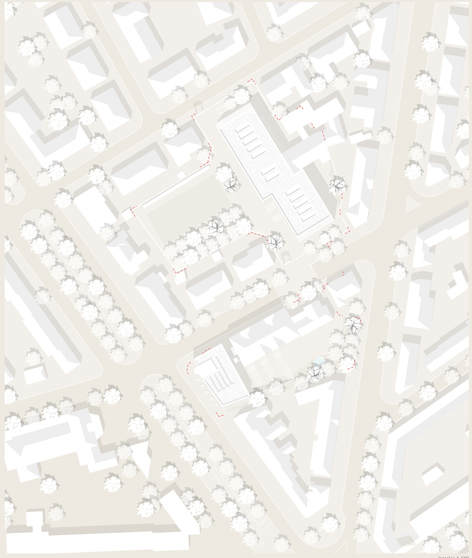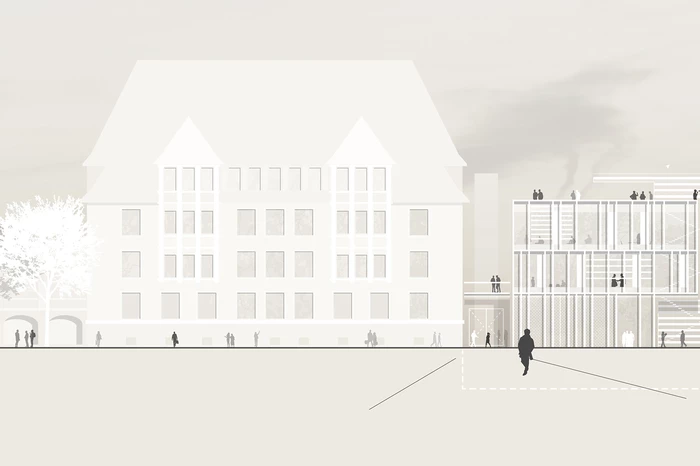 Sowohl das „Lernhaus“ als auch das an die denkmalgeschützte Holbeinschule anschließende „Stadtteilhaus“ mit seiner kompakten Volumetrie werden aufgrund ihres Erscheinungsbildes als zusammengehörig gelesen. In ihrem Zusammenspiel unterstützen Neu- und Bestandsgebäude die Idee eines erlebbaren, Identität stiftenden Schul-Campus. Es entsteht ein moderner Schulbaukomplex, der sich mit einem Beratungs- und Förderzentrum und einem „offenen Treff“ räumlich zum Stadtteil öffnet und eine klare Adressbildung schafft.