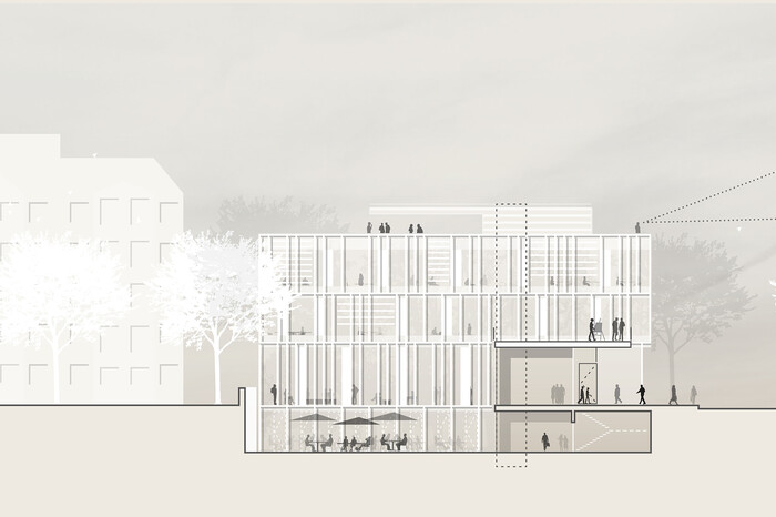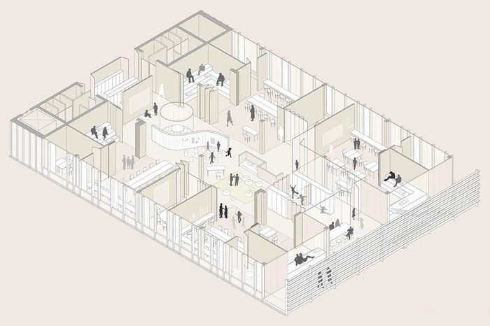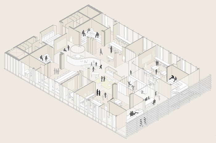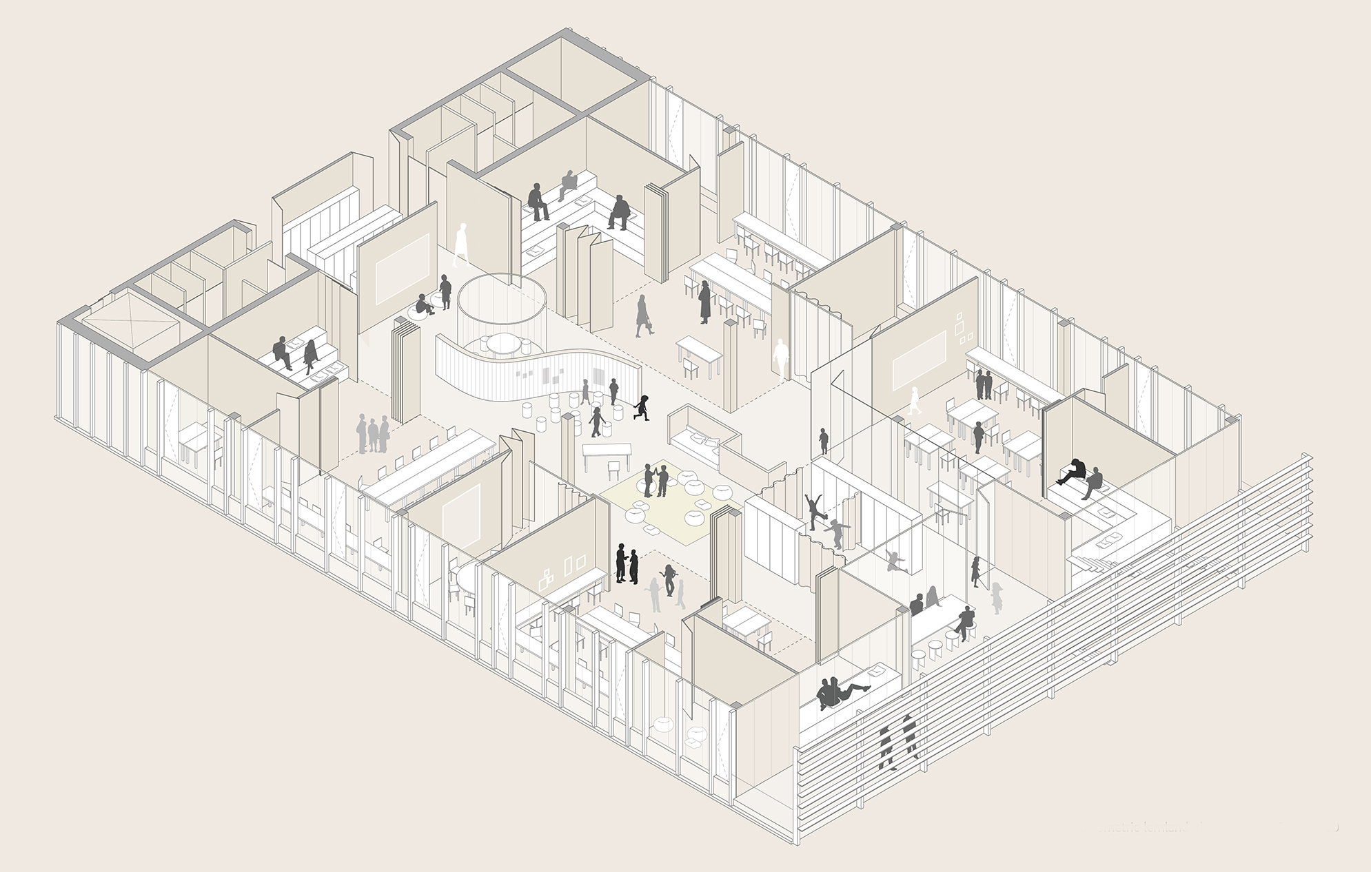 Der Neubau für das „Lernhaus“ ist in klare, überschaubare Funktionsbereiche gegliedert, die eine gute Orientierung als Grundvoraussetzung in Bezug auf das inklusive Bauen gewährleisten. Die Lernlandschaften sind als identifizierbare Einheiten organisiert, jeweils durch Kernzonen horizontal und vertikal miteinander verbunden. Es werden Gemeinschaftsbereiche geschaffen, die als kontinuierliche Erweiterungen des Klassenraums fungieren und strenge Klassenstrukturen auflösen.