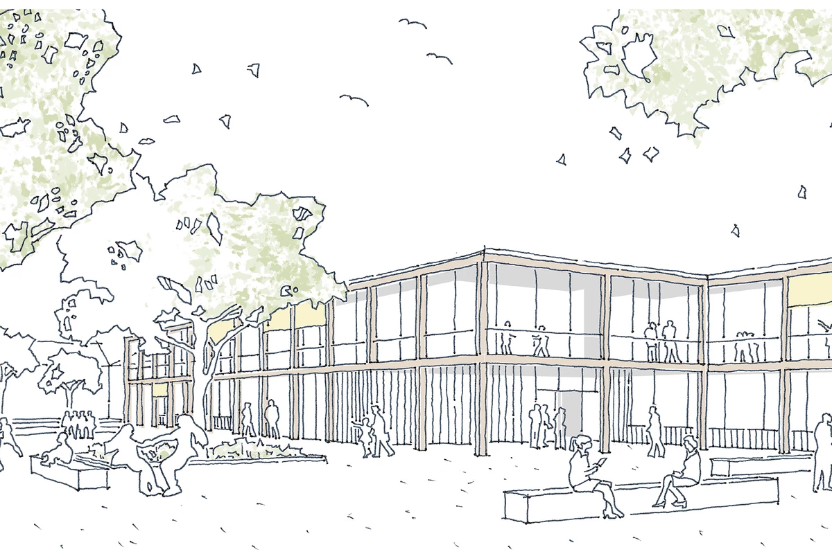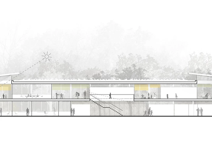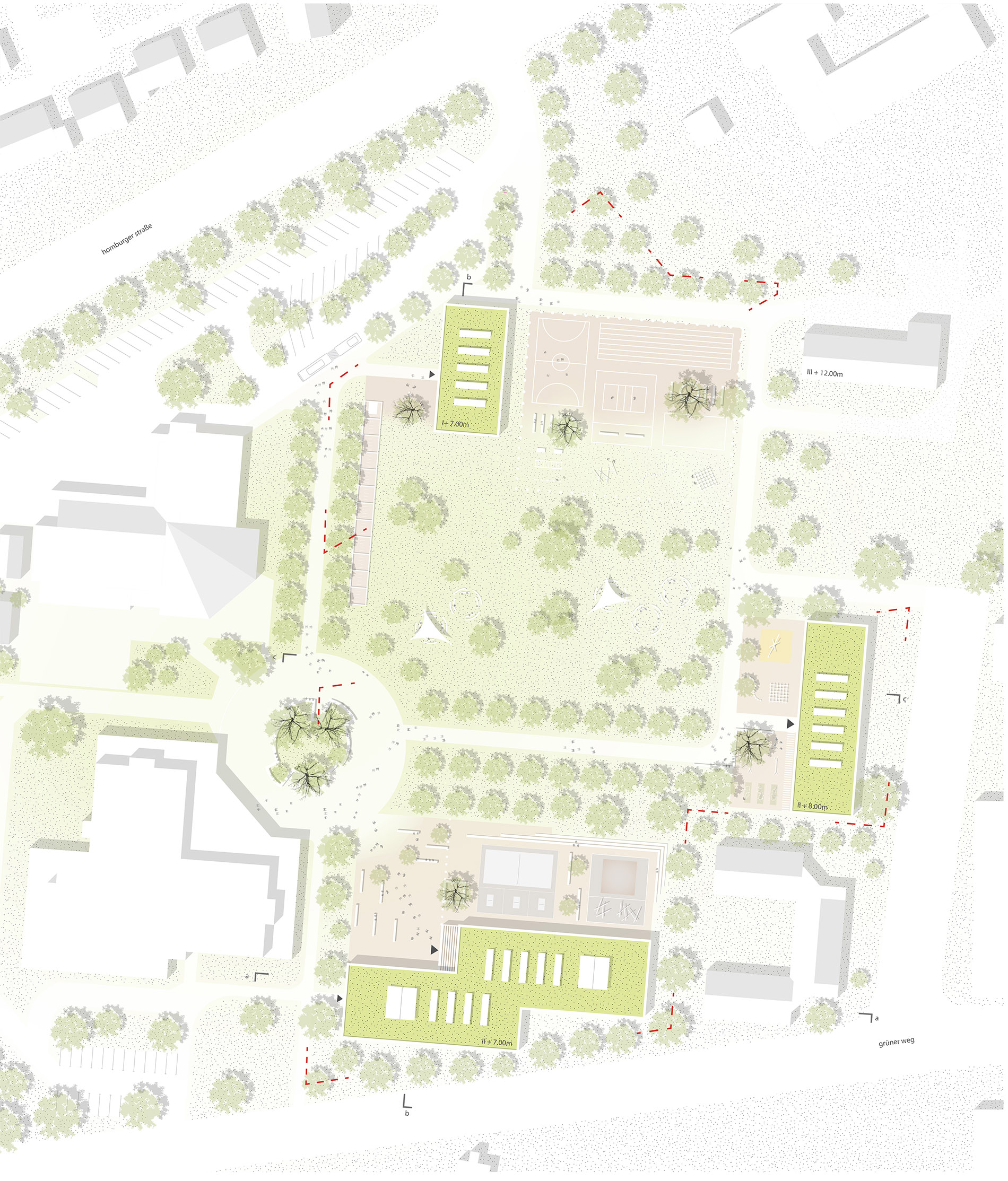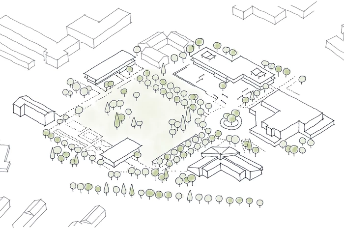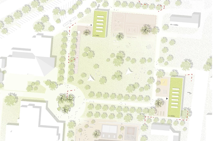 Der Gebäudebestand wird von einer Vielzahl verstreut im Gelände liegender Bauten gekennzeichnet, die zum Teil deutliche Charakterunterschiede aufweisen. Nach Rückbau verbleiben die „Neue Schule“, die Mensa und das Haus 4 auf dem Wettbewerbsgelände. Die neue Grundschule, das Internat und die Sporthalle werden so auf dem weitläufigen Gelände verortet, dass sie im Zusammenspiel mit den Bestandsgebäuden einen zentralen Freiraum generieren: den Campus. Die drei zweigeschossigen, pavillonartigen Neubauten bilden aufgrund ihrer Setzung und Materialisierung ein Gebäudeensemble, das durch Blick- und Wegebeziehungen miteinander verbunden ist.